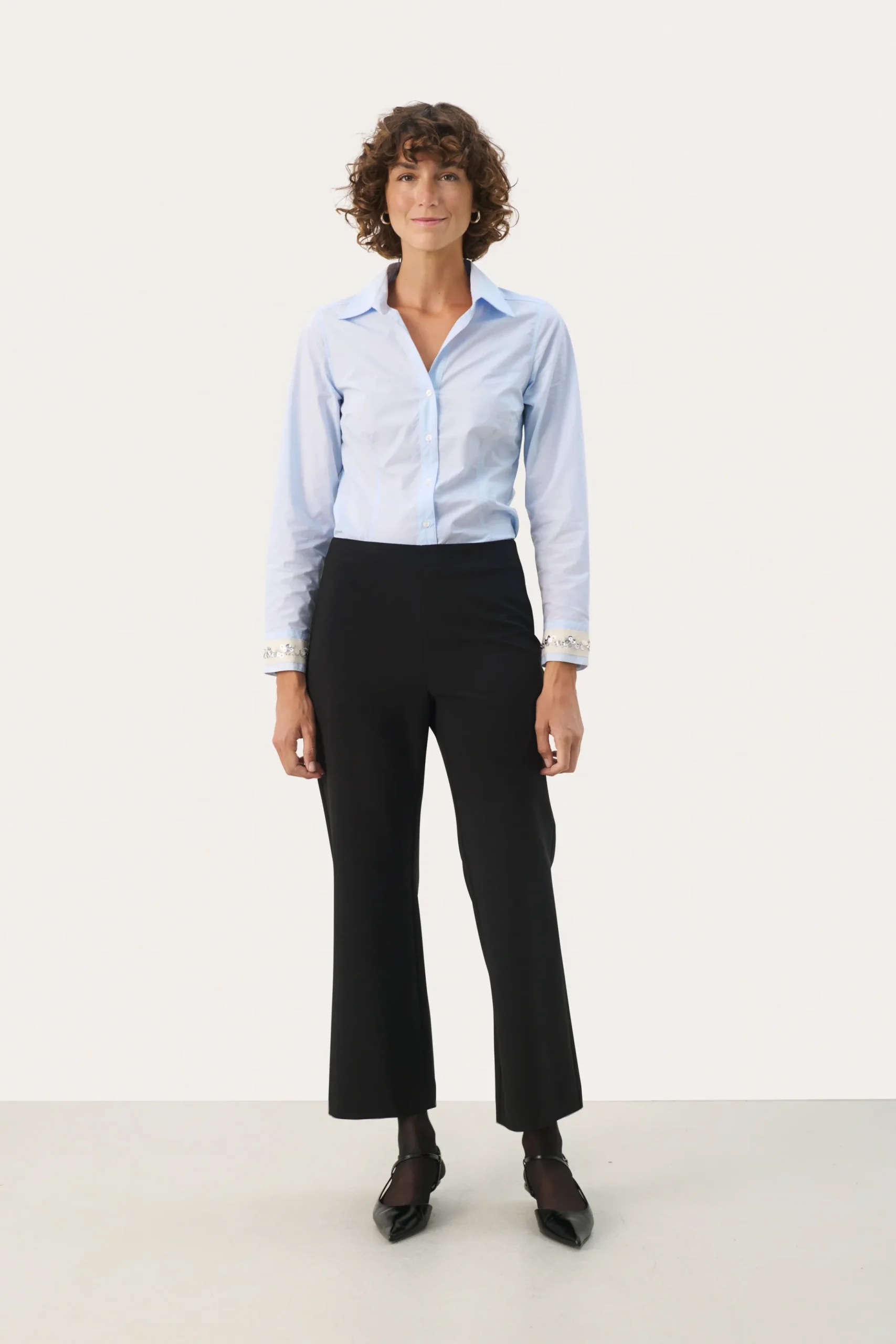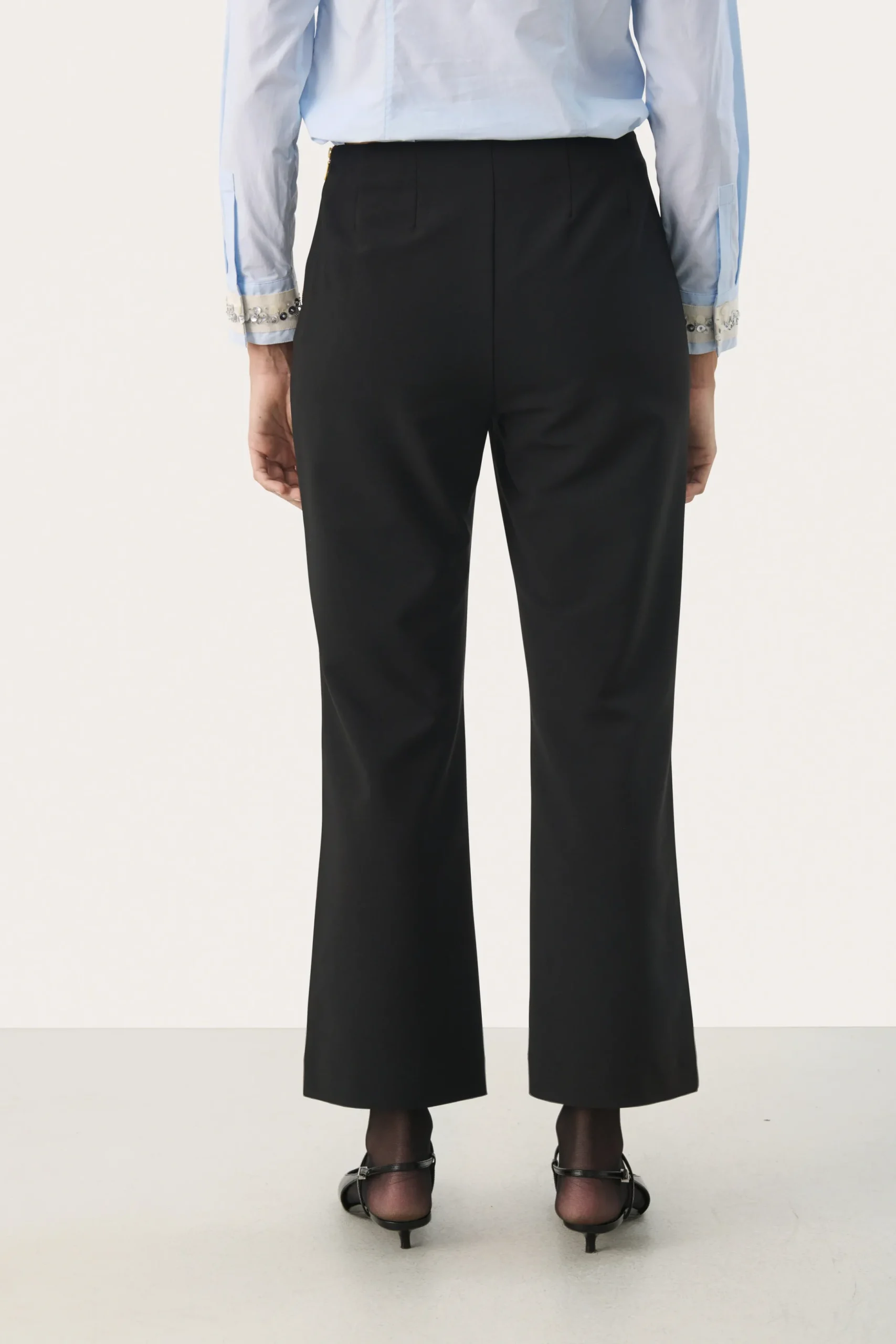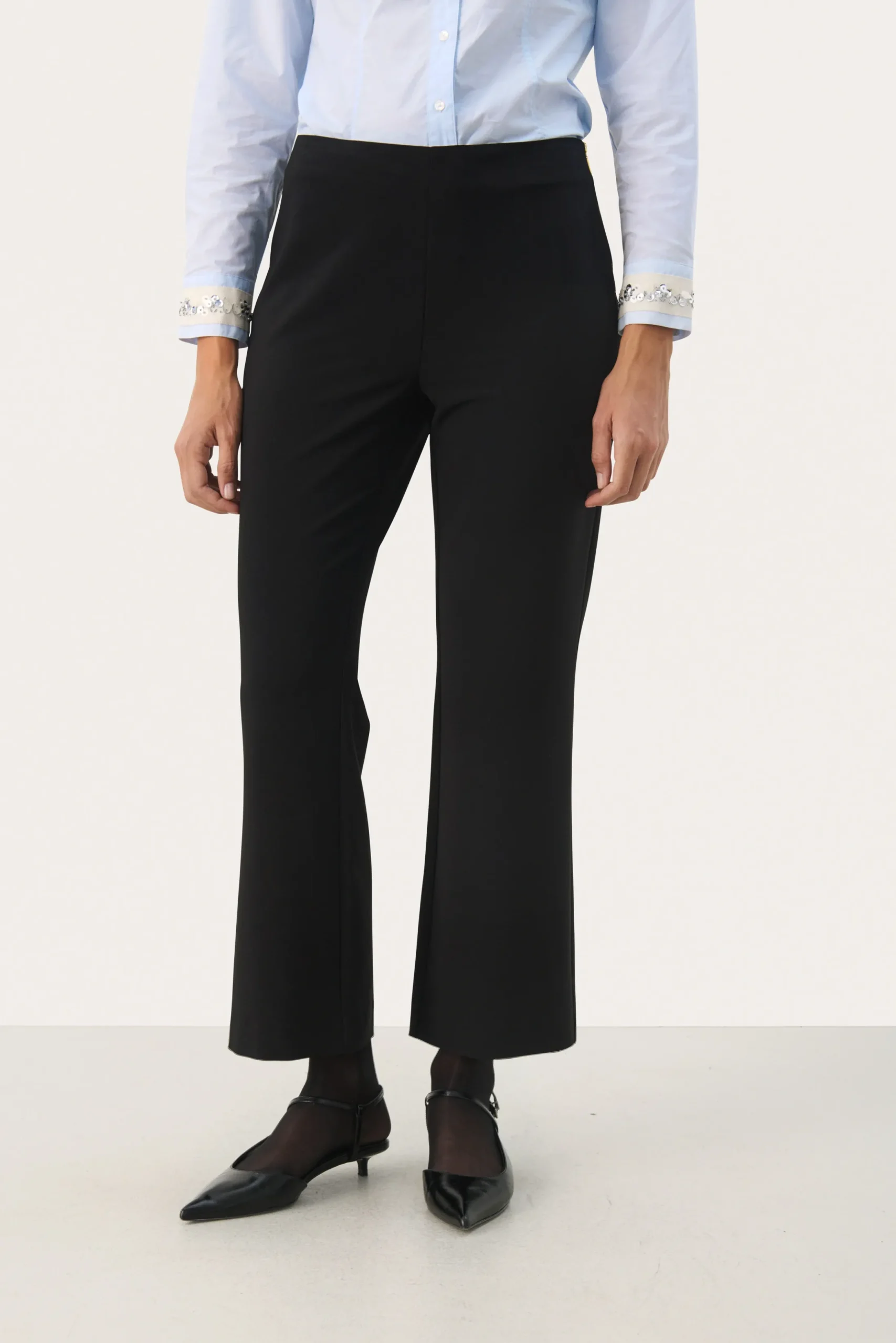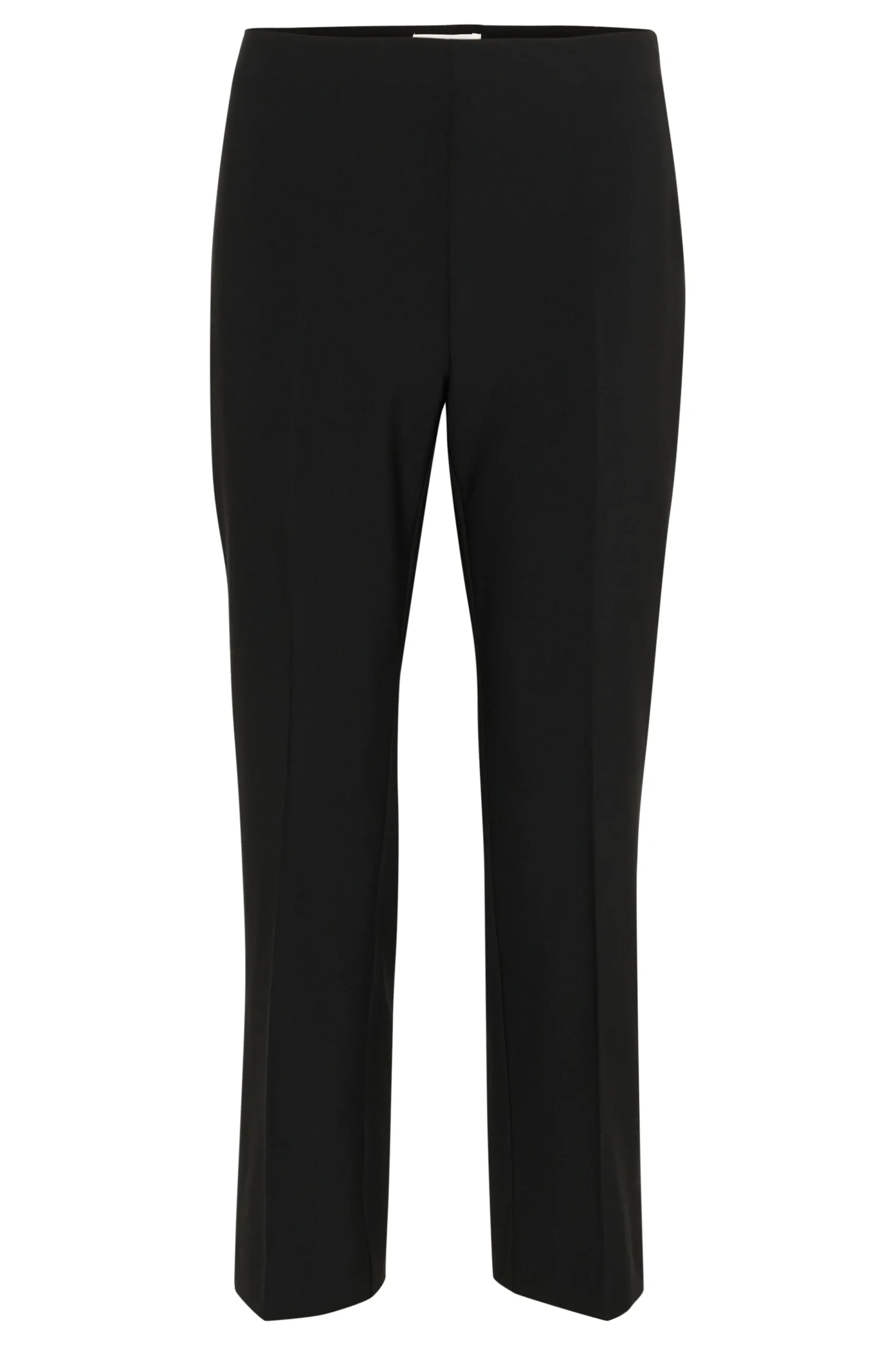 Modellen er 178 cm høj og er iført en størrelse 36.\\n\\nDisse klassiske sorte bukser er en uundværlig del af enhver garderobe. Med deres lige snit og tidløse design passer de til enhver lejlighed. De er fremstillet i et blødt og strækbart materiale, der sikrer en behagelig pasform hele dagen. Perfekte til både kontorbrug og festlige lejligheder.