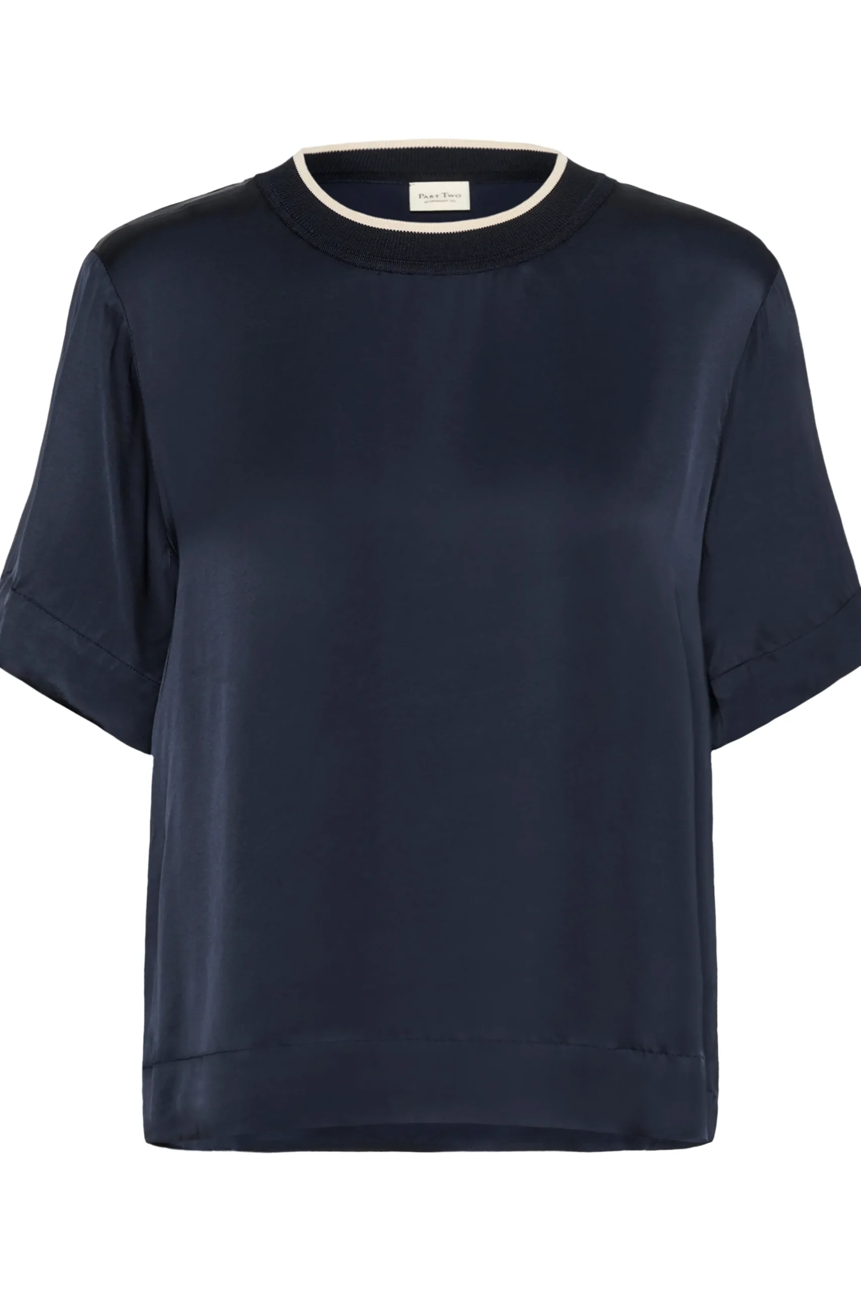 Modellen er 176 cm høj og er iført en størrelse 36.\\n\\nDenne bluse har et afslappet snit med korte ærmer og ribdetalje ved halsudskæringen. Den bløde kvalitet giver et elegant fald og et glansfuldt look. Brug den til både hverdag og fest 窶