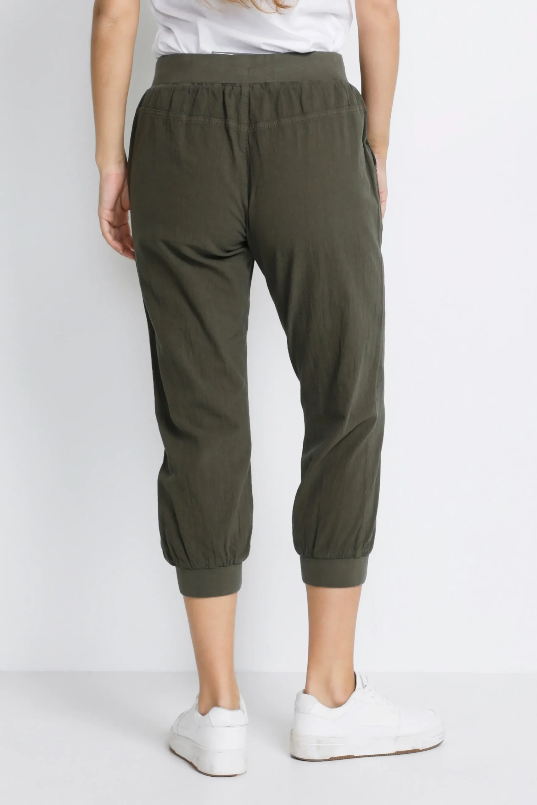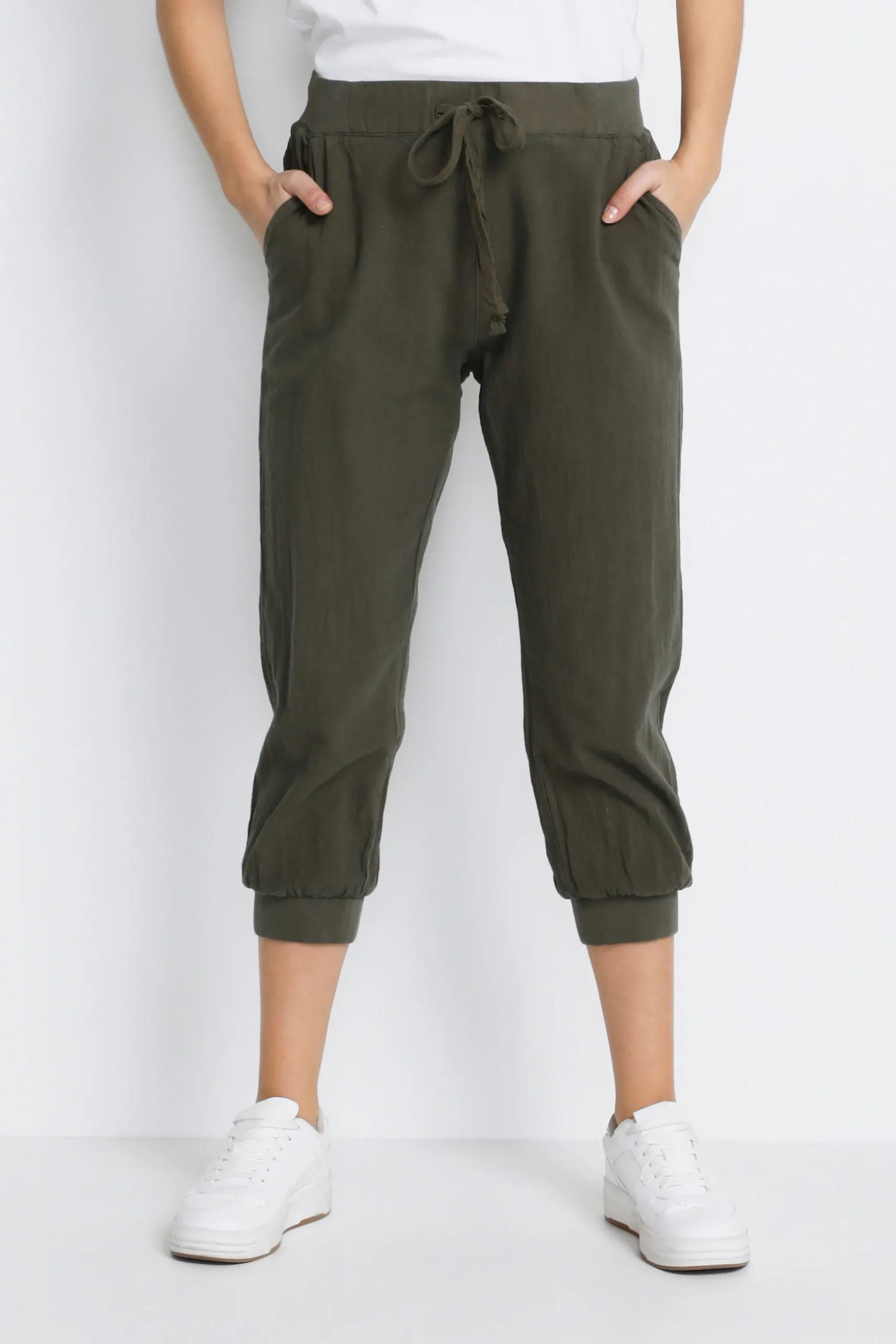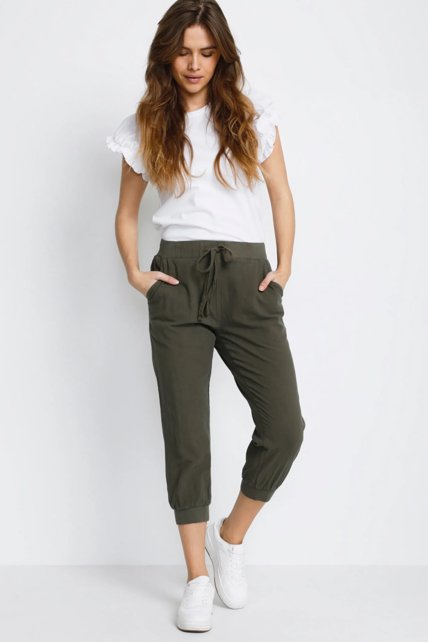 Capribuks fra KAFFE med elastik i taljen. Snøre foran. Ribkant nederst. Vævet kvalitet. Capribukserne fra KAFFE har normal pasform.