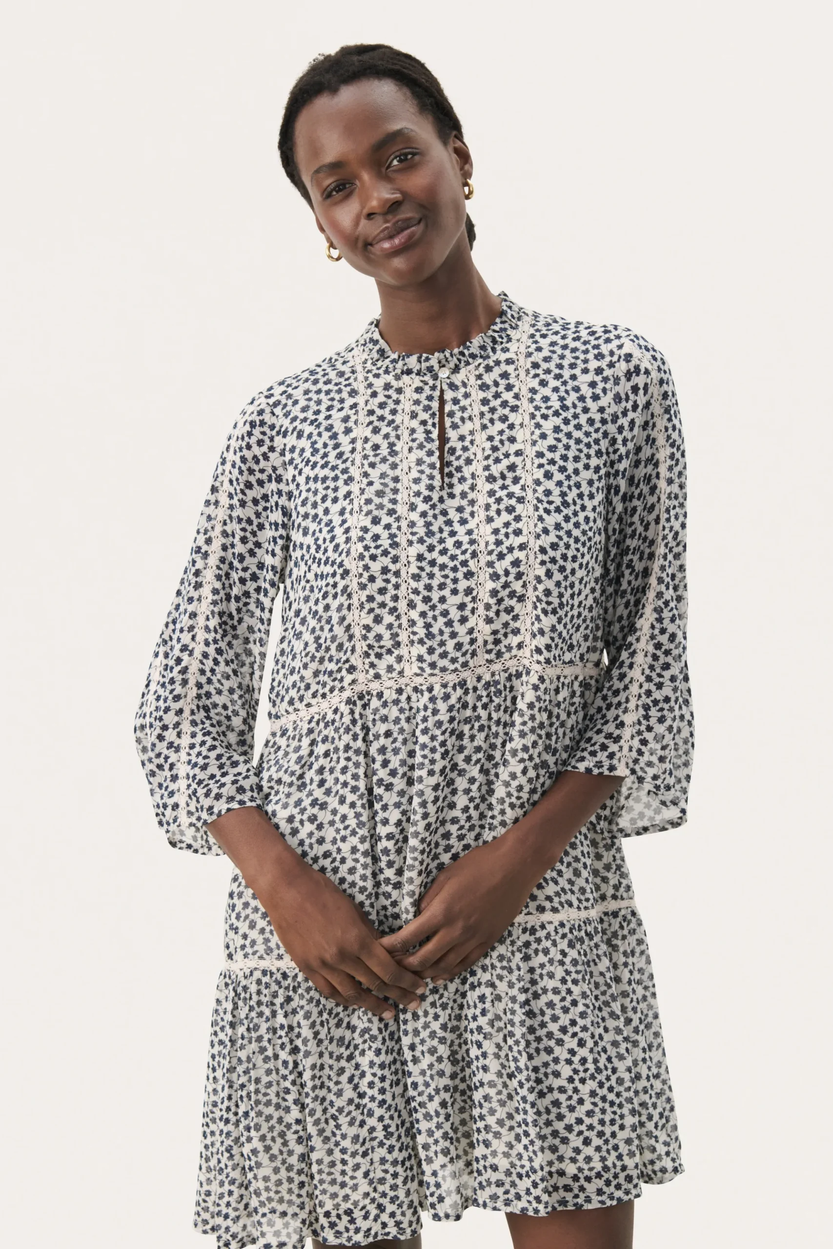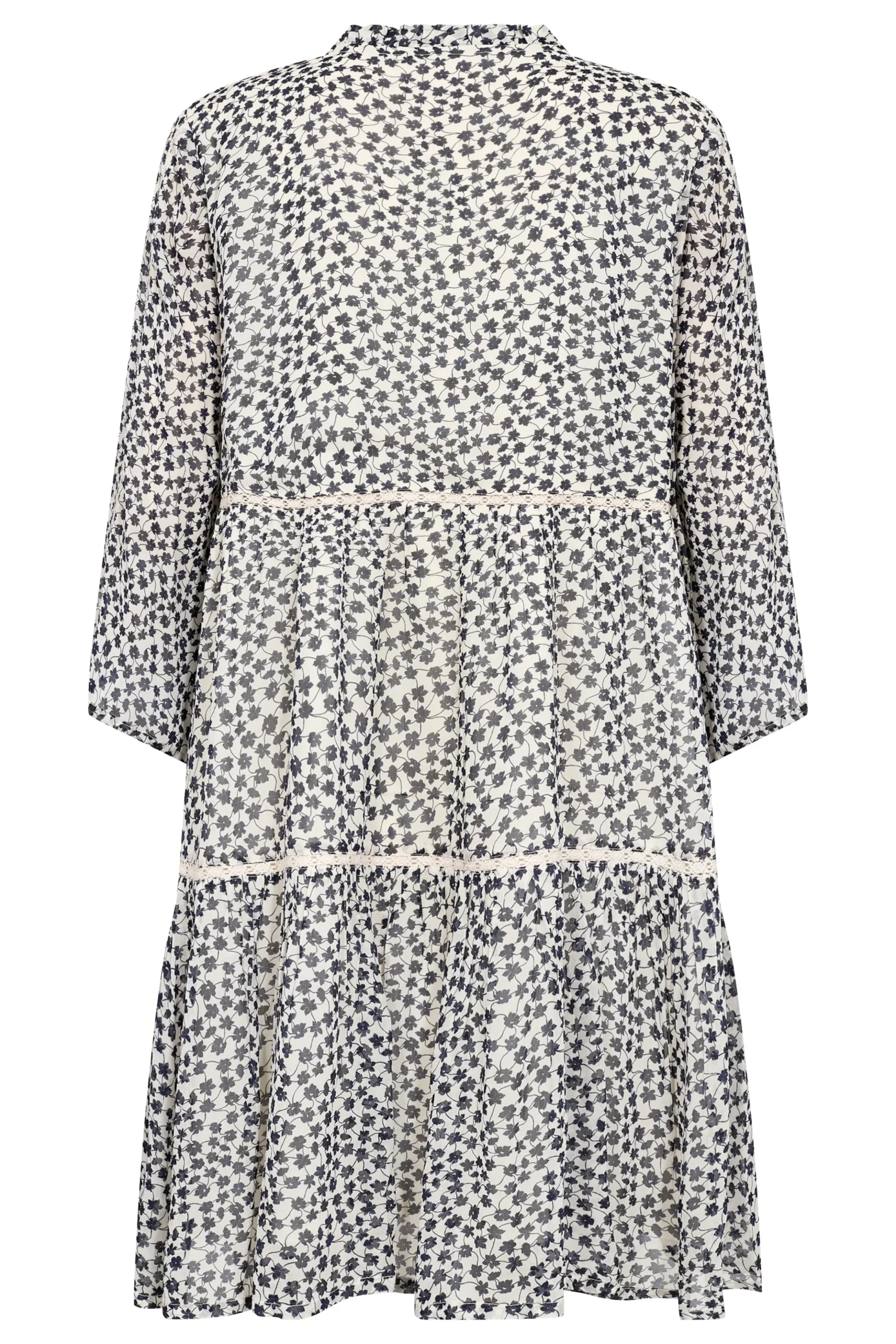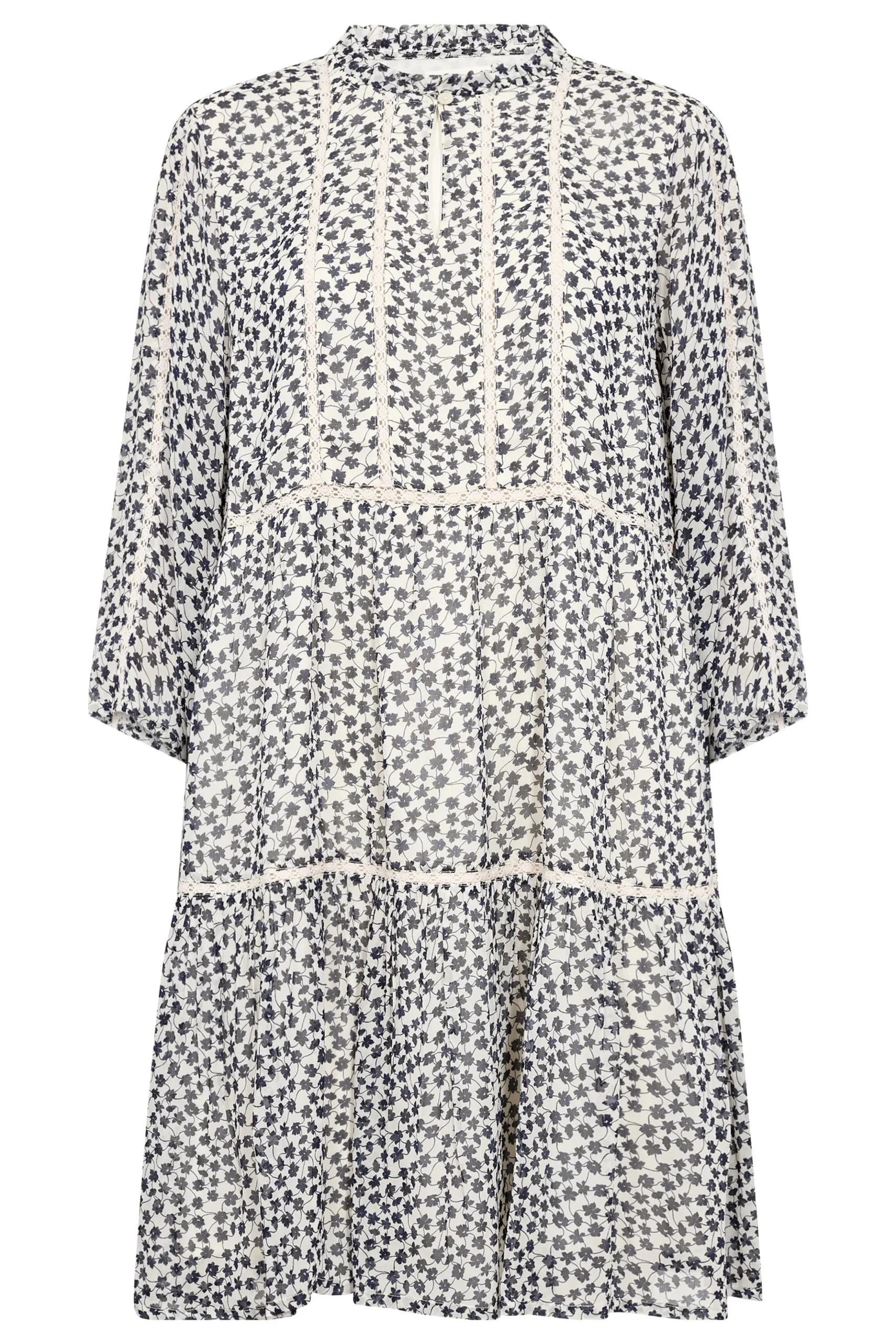 Modellen er 180 cm høj og er iført en størrelse 36.\\n\\nDenne lette kjole med et smukt blomsterprint og delikate blondebånd er et perfekt valg til en feminin og afslappet stil. Med et løst snit og lange ærmer er den både behagelig og elegant. Ideel til hverdag eller hyggelige sammenkomster.\\n\\n