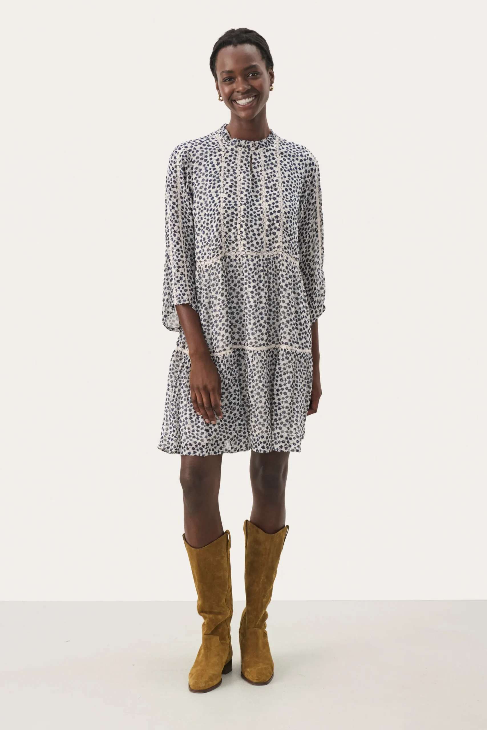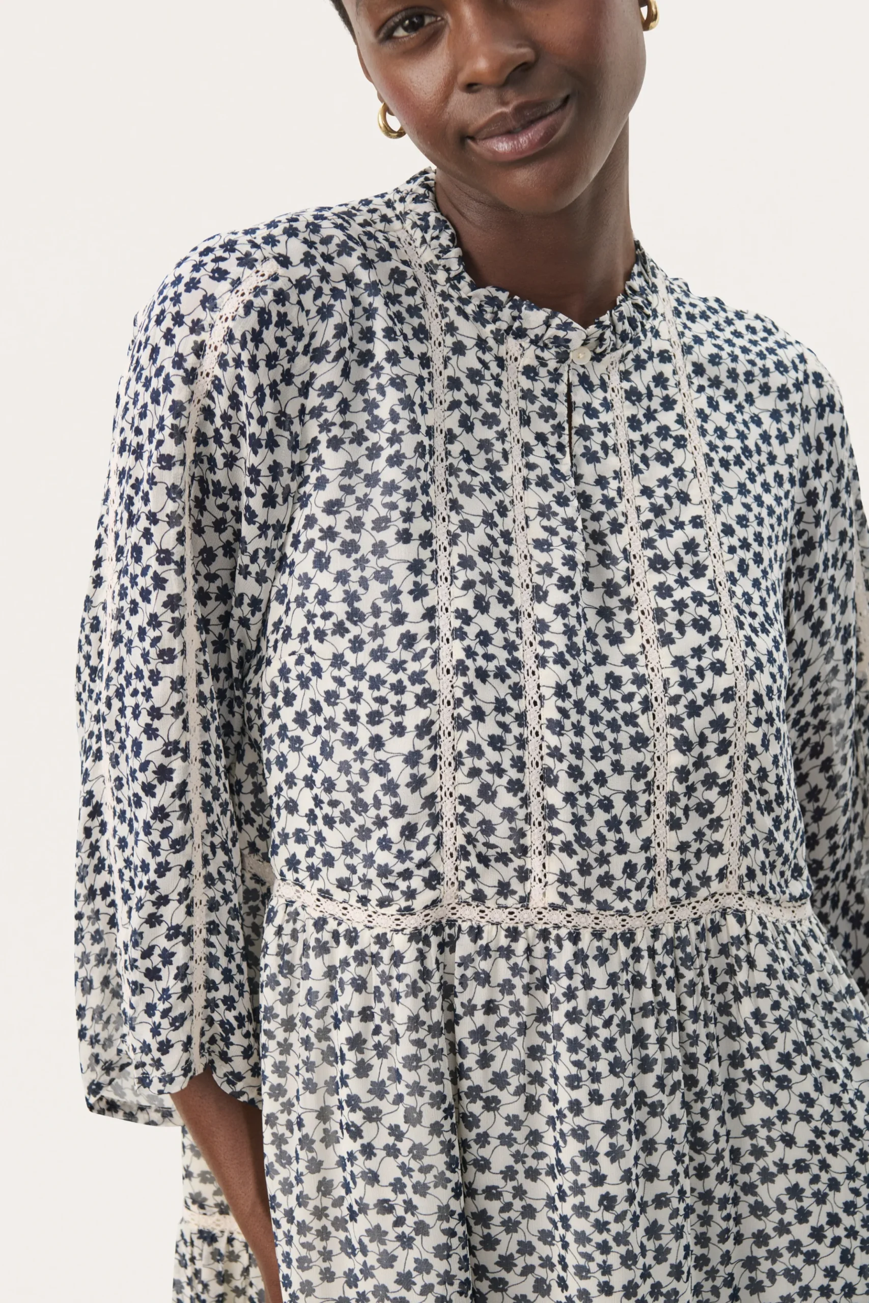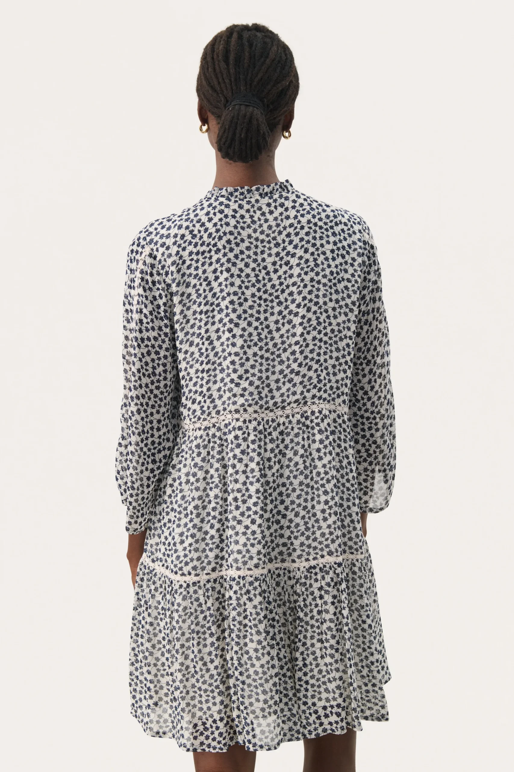 Modellen er 180 cm høj og er iført en størrelse 36.\\n\\nDenne lette kjole med et smukt blomsterprint og delikate blondebånd er et perfekt valg til en feminin og afslappet stil. Med et løst snit og lange ærmer er den både behagelig og elegant. Ideel til hverdag eller hyggelige sammenkomster.\\n\\n