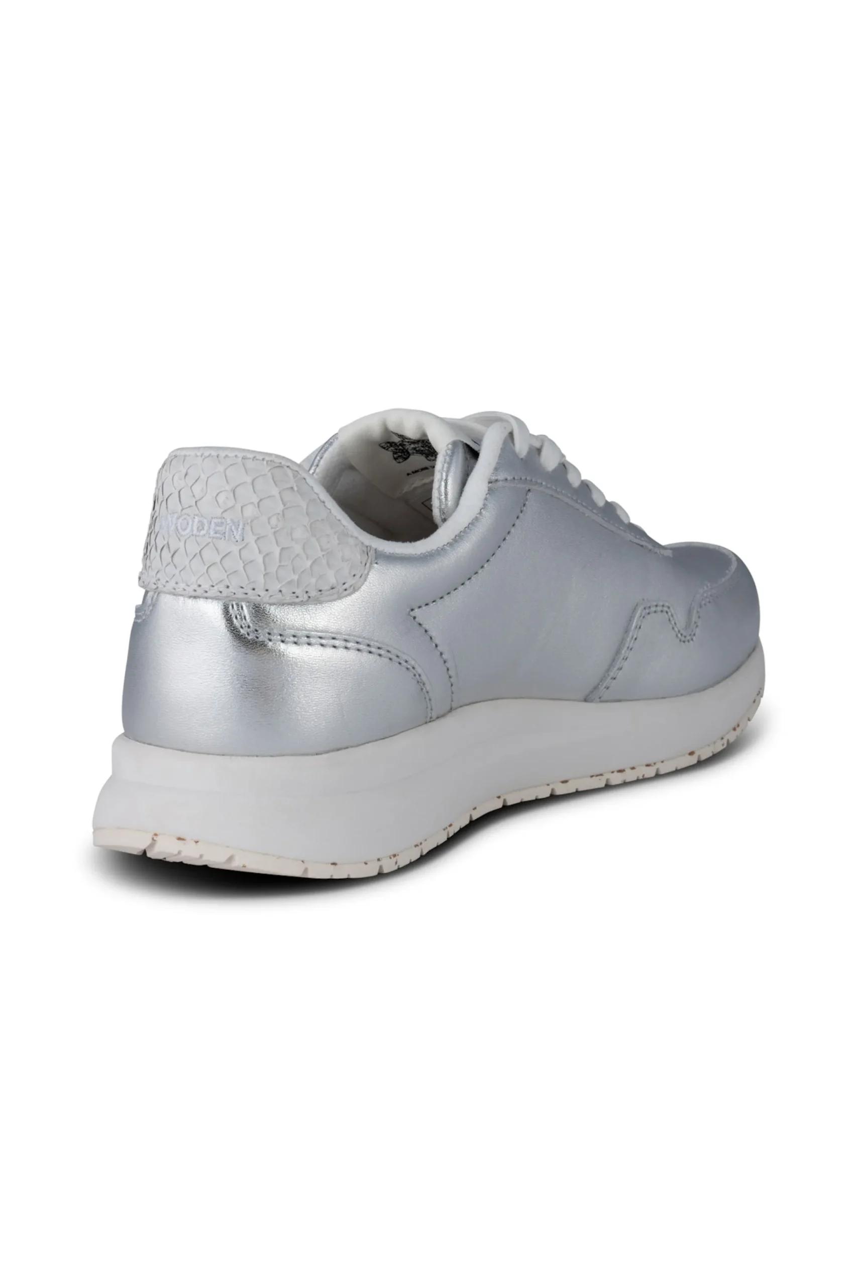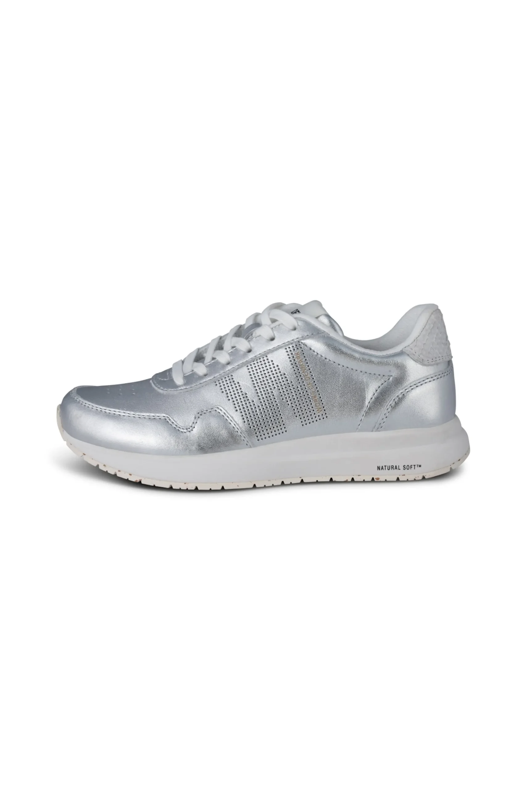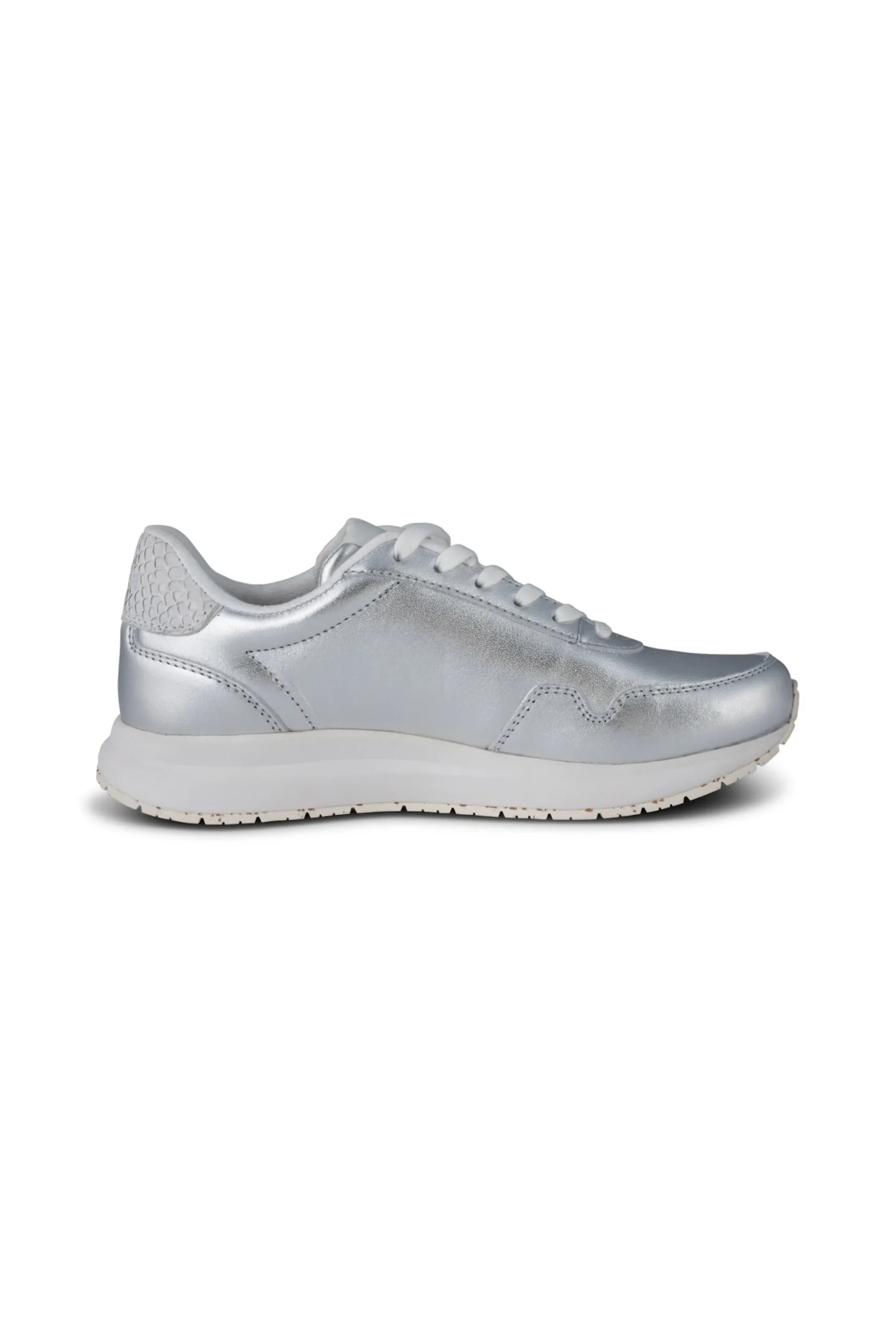 Nora har gennemgået en opgradering og er nu designet med den innovative Natural Soft Technology sål. Nora Metallic blander problemfrit metallic læder, genanvendt fiske-læder og genbrugsgummi for et moderne tvist på et tidløst design. Med sin kombination af materialer og teknologier Nora et ideelt valg af fodtøj til en urban livsstil.\\n\\n- Certificeret læder fra Leather Working Group \\n- Upcyclet fiskelæder med ASC certificering \\n- Formstøbt mellemsål i letvægtsmaterialet EVA \\n- Ydersål i gummi med 10% genanvendt gummi \\n- Woden natural soft technology 邃ød formstøbt indlægssål i PU beklædt med kork \\n- Woden air flow system 邃