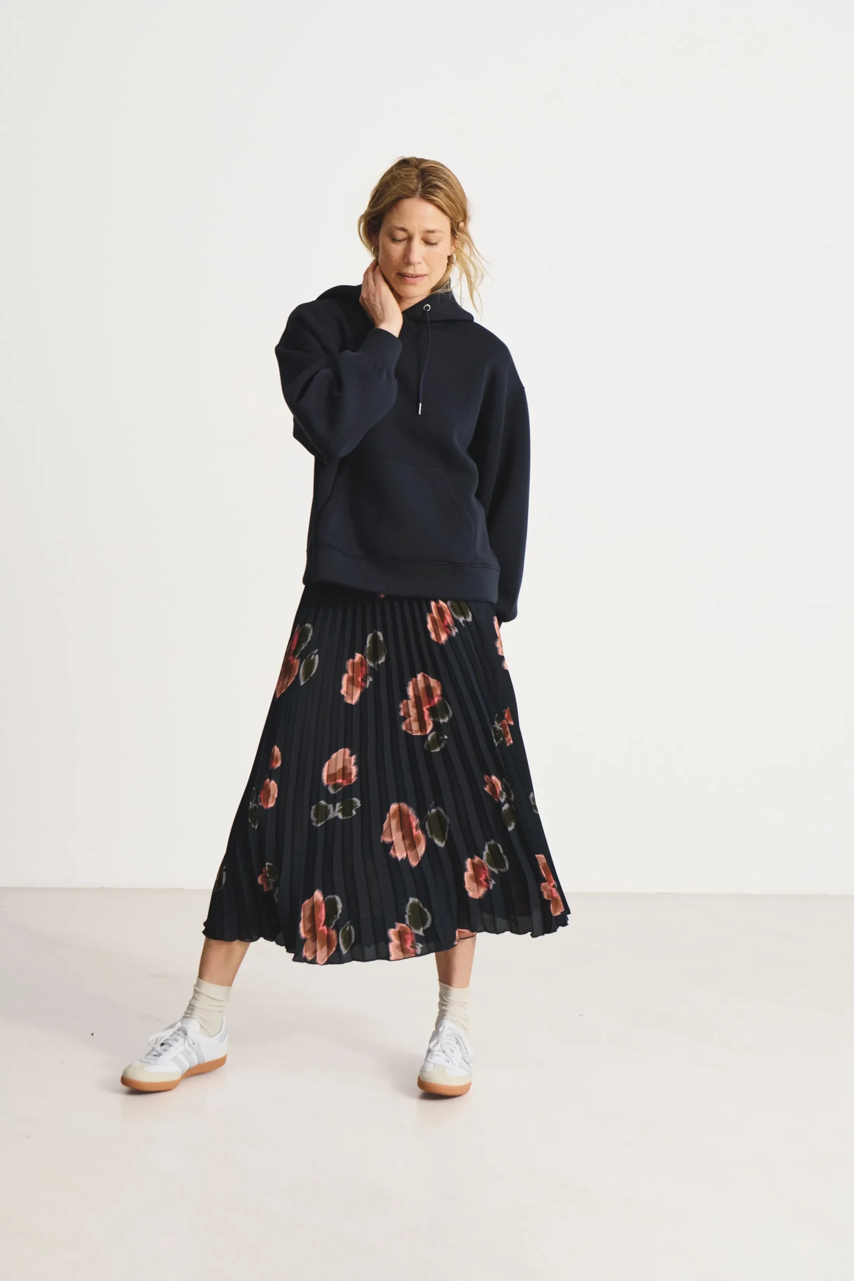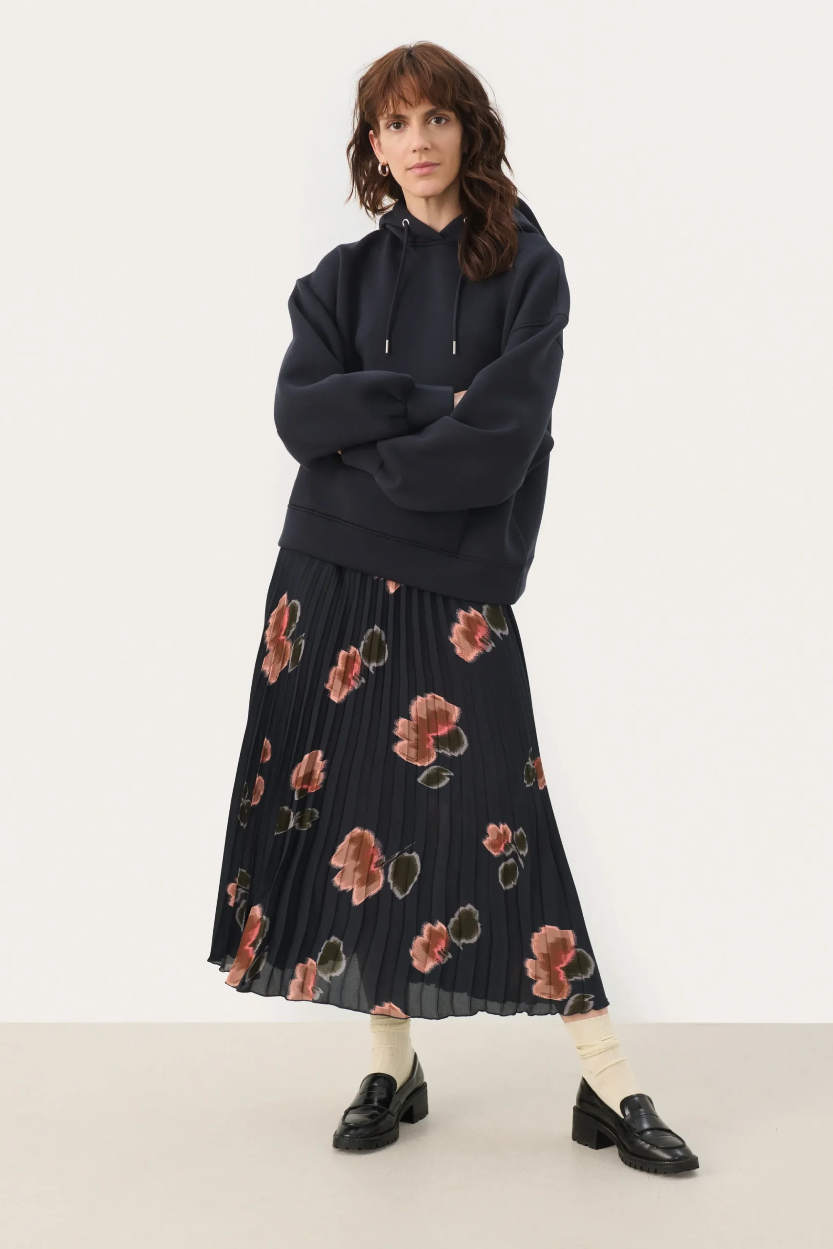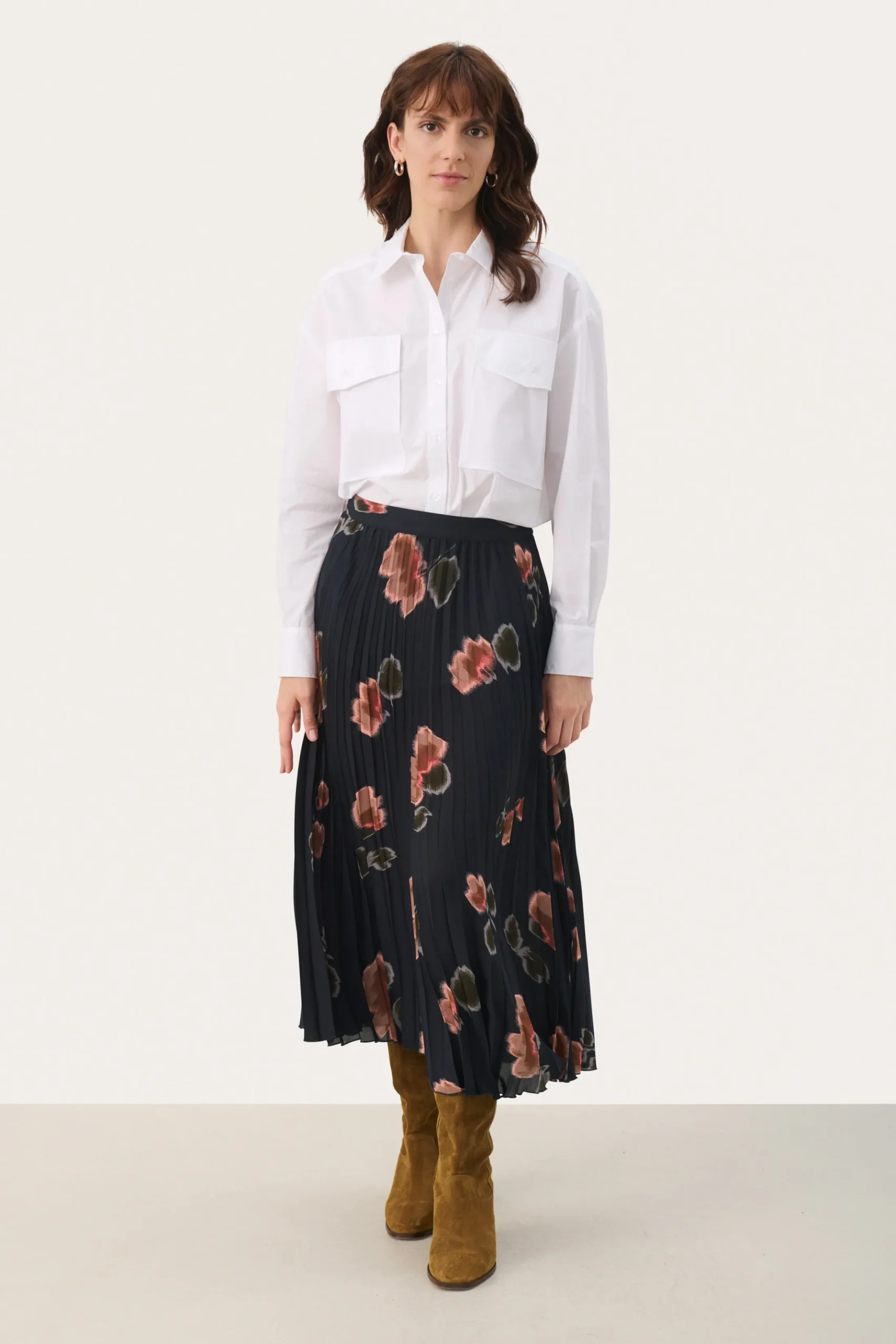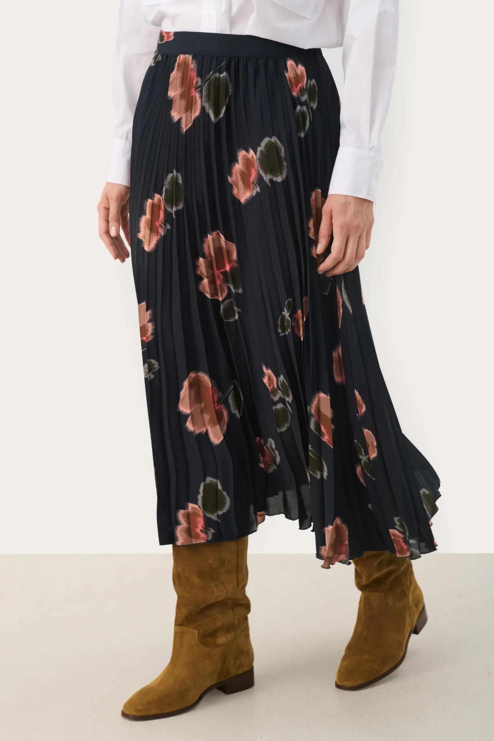 Modellen er 178 cm høj og er iført en størrelse 36.\\n\\nDenne smukke plisserede nederdel med blomsterprint er fremstillet i en let kvalitet, der giver et elegant fald. Den elastiske talje sikrer en komfortabel pasform, perfekt til både hverdag og festlige anledninger. Style den med en bluse eller striktrøje for et feminint look.\\n\\n