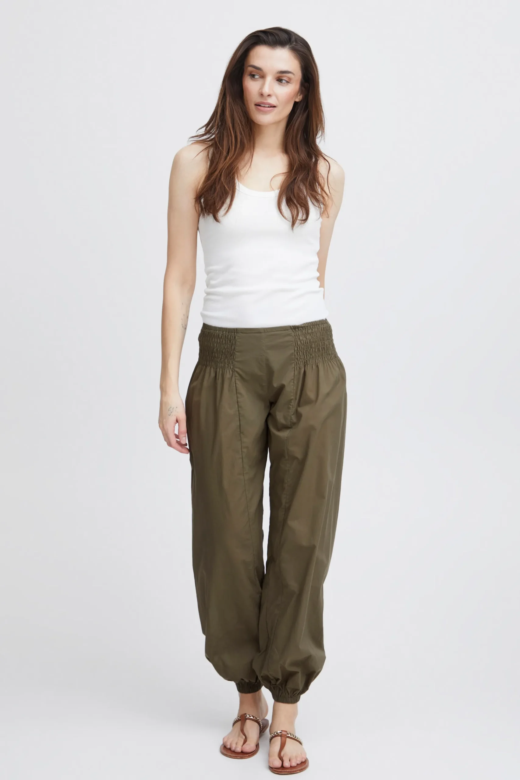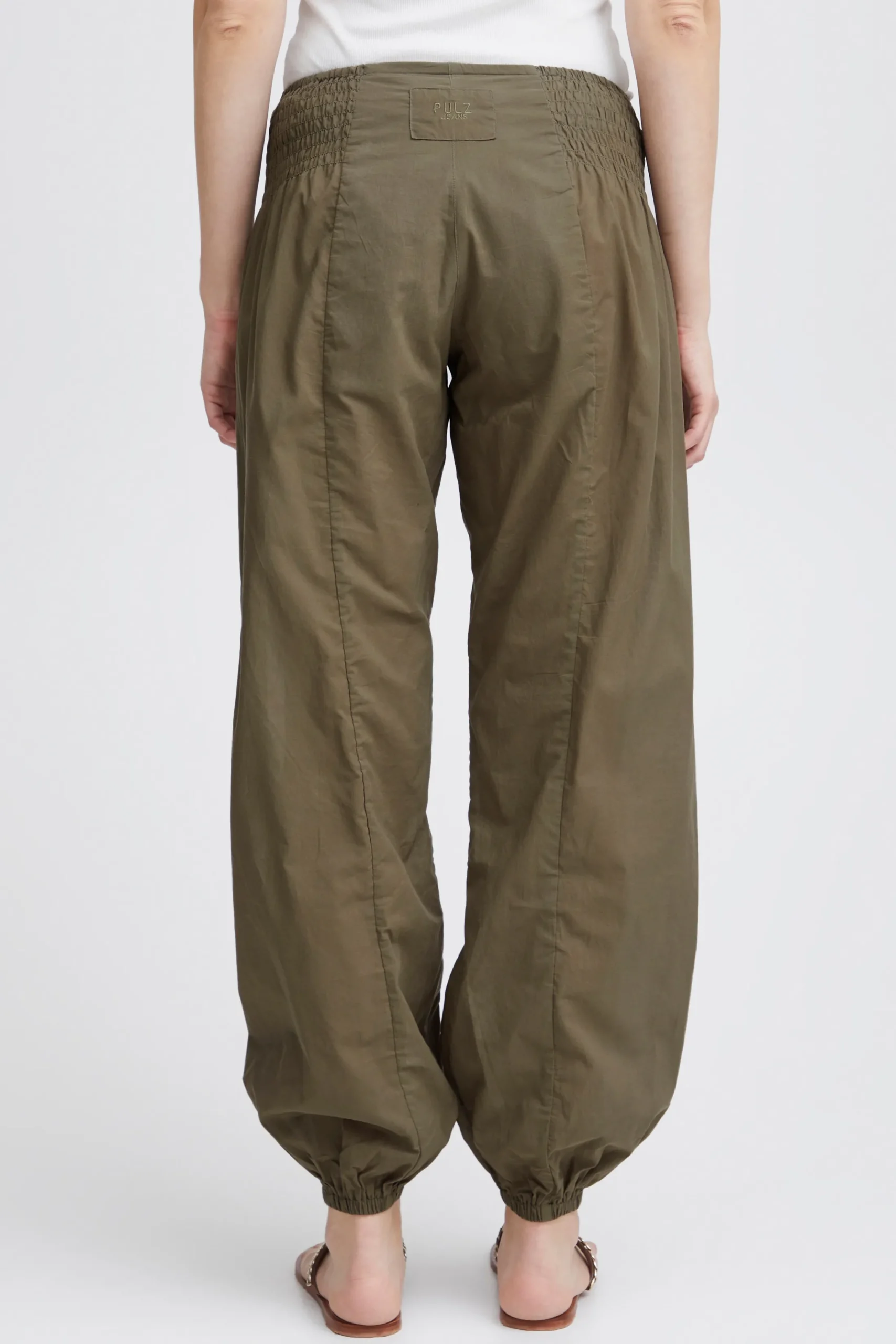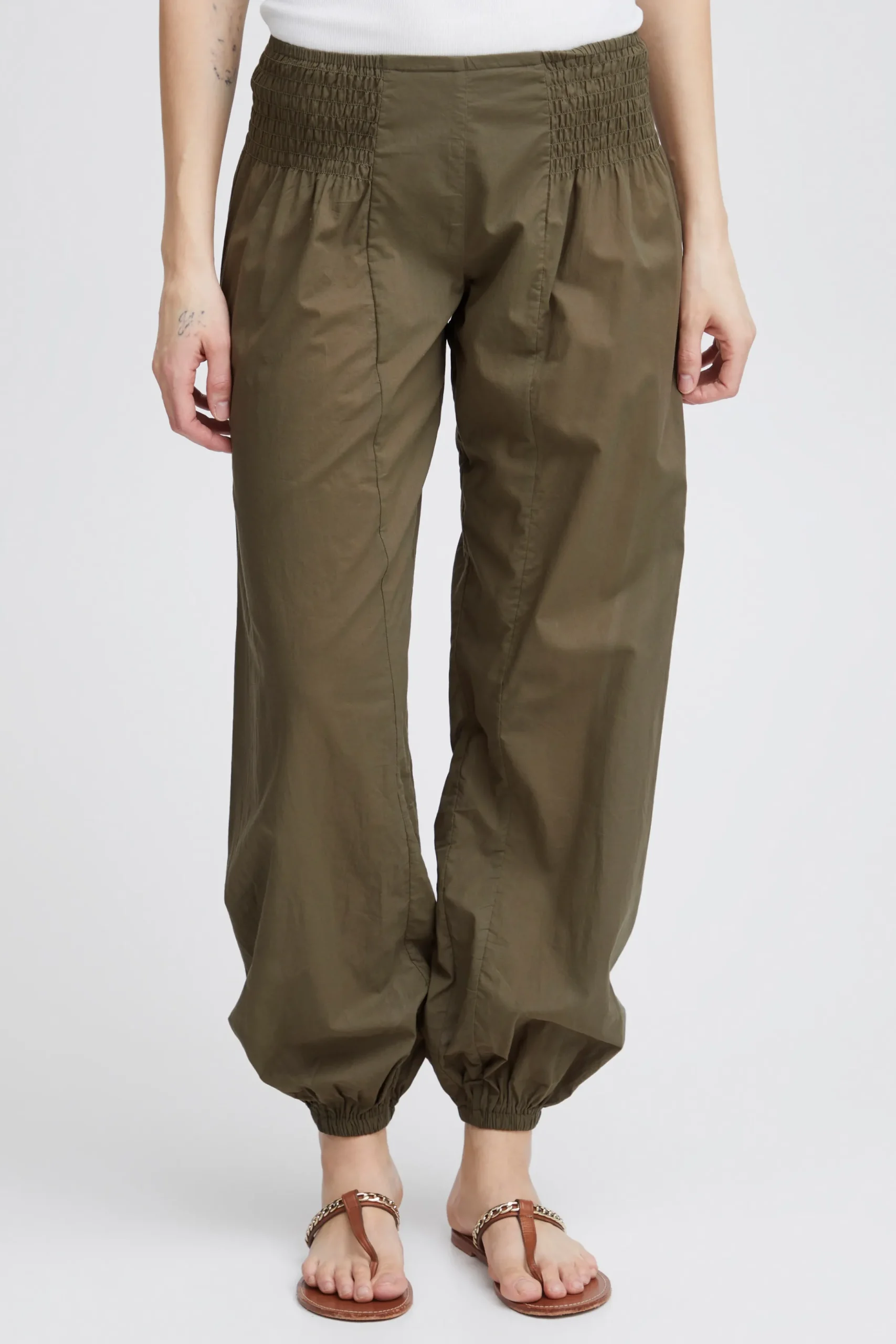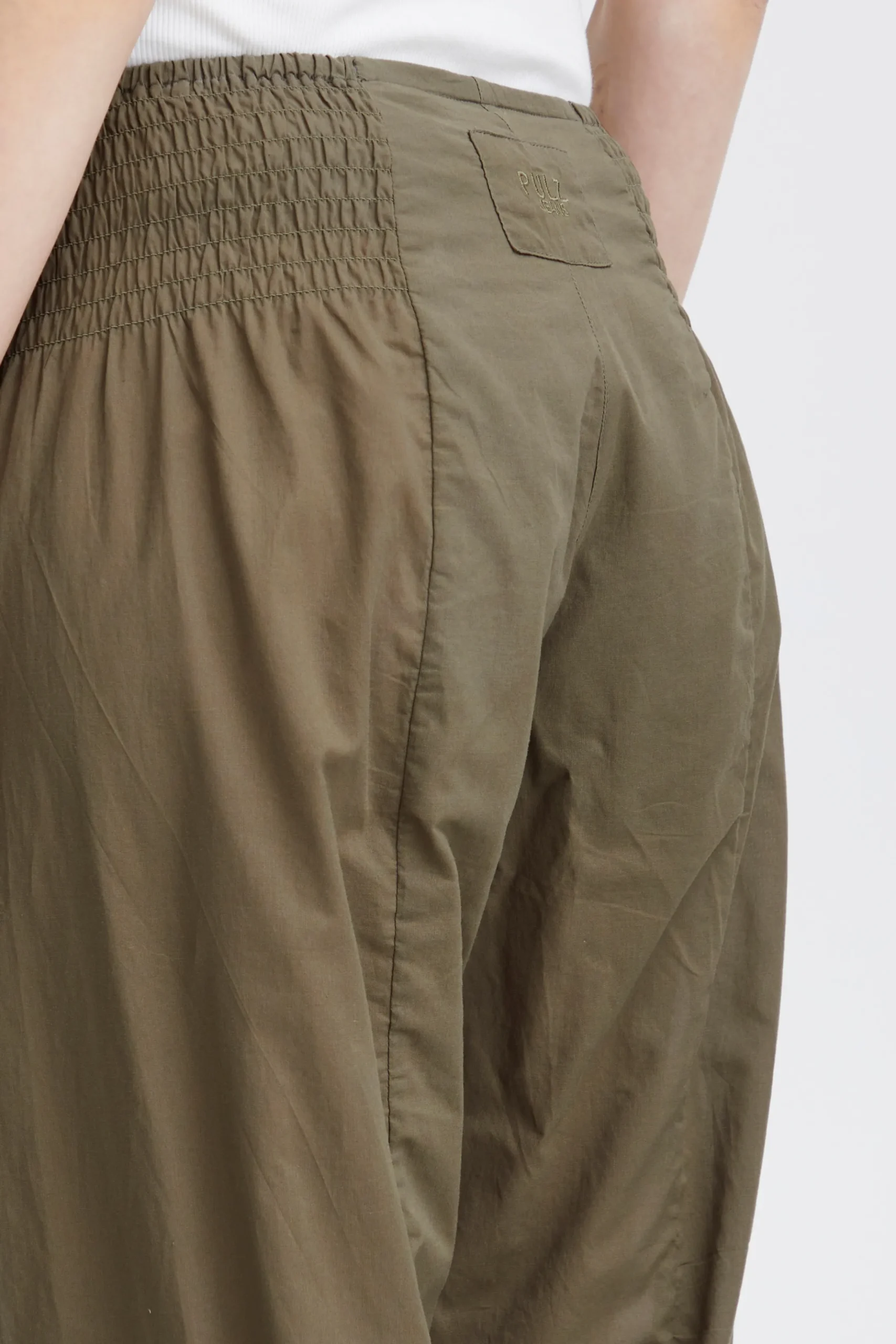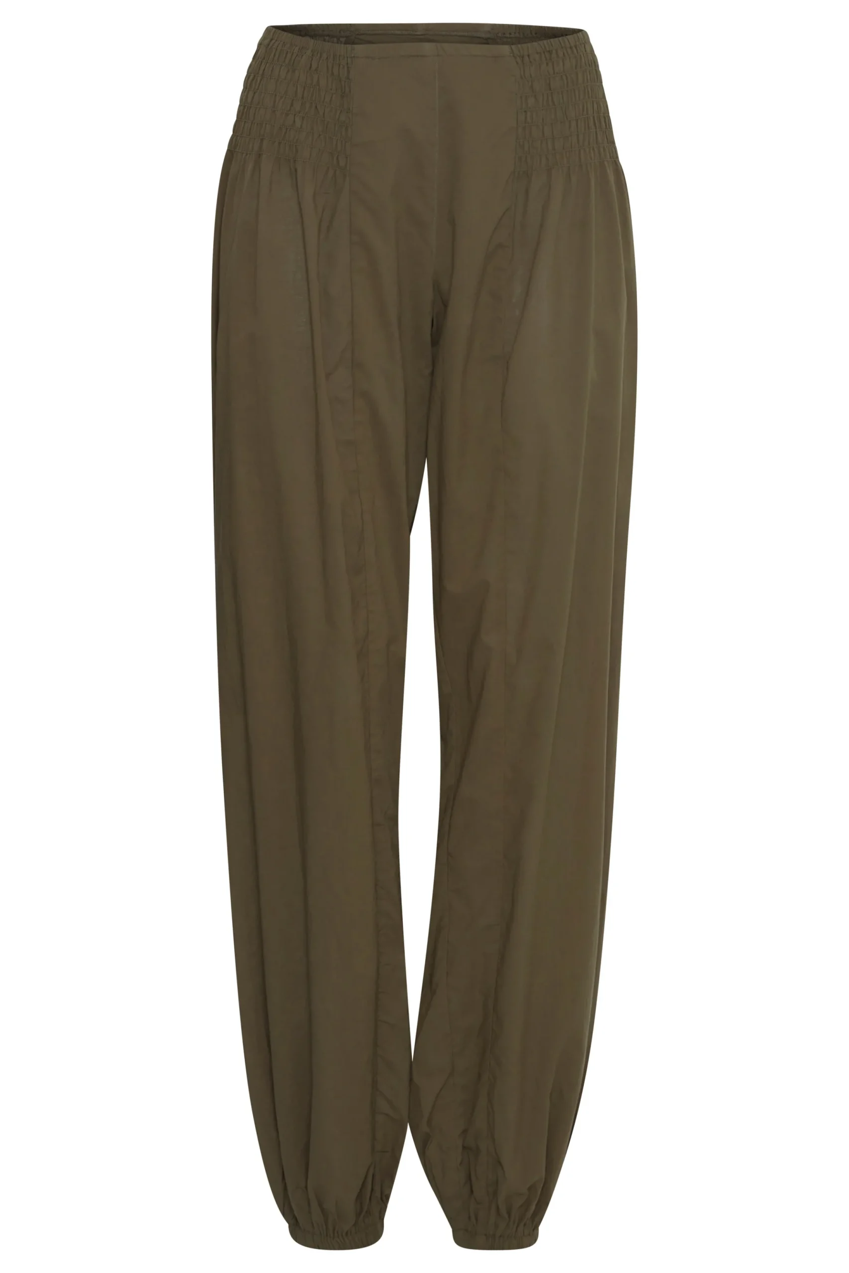 Løstsiddende buks med oversize pasform og haremseffekt. Bred smockeffekt i taljen. Elastik i bukseben. Brug dem med en T-shirt for et casual udtryk eller en fin bluse for et feminint udtryk med et råt twist.