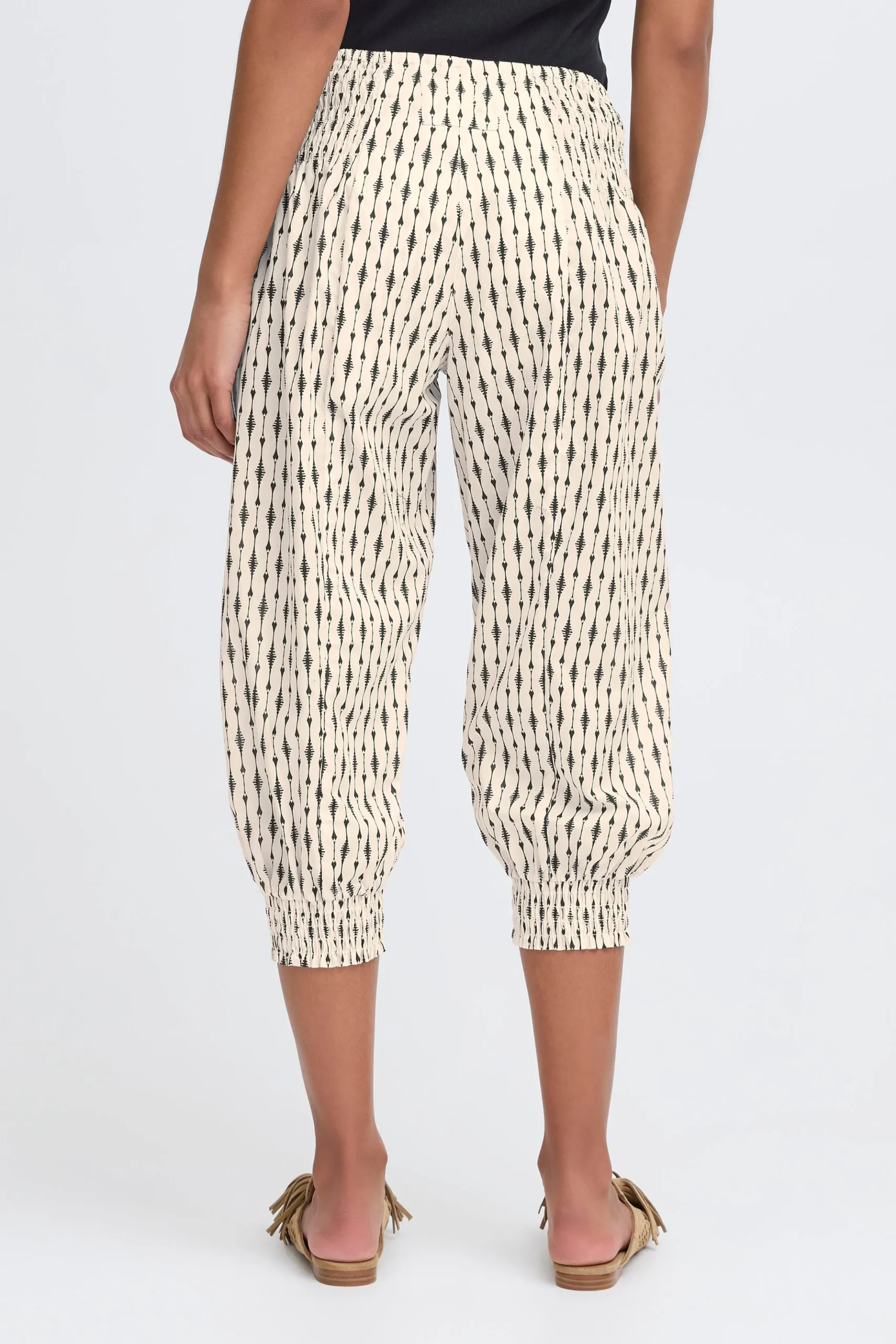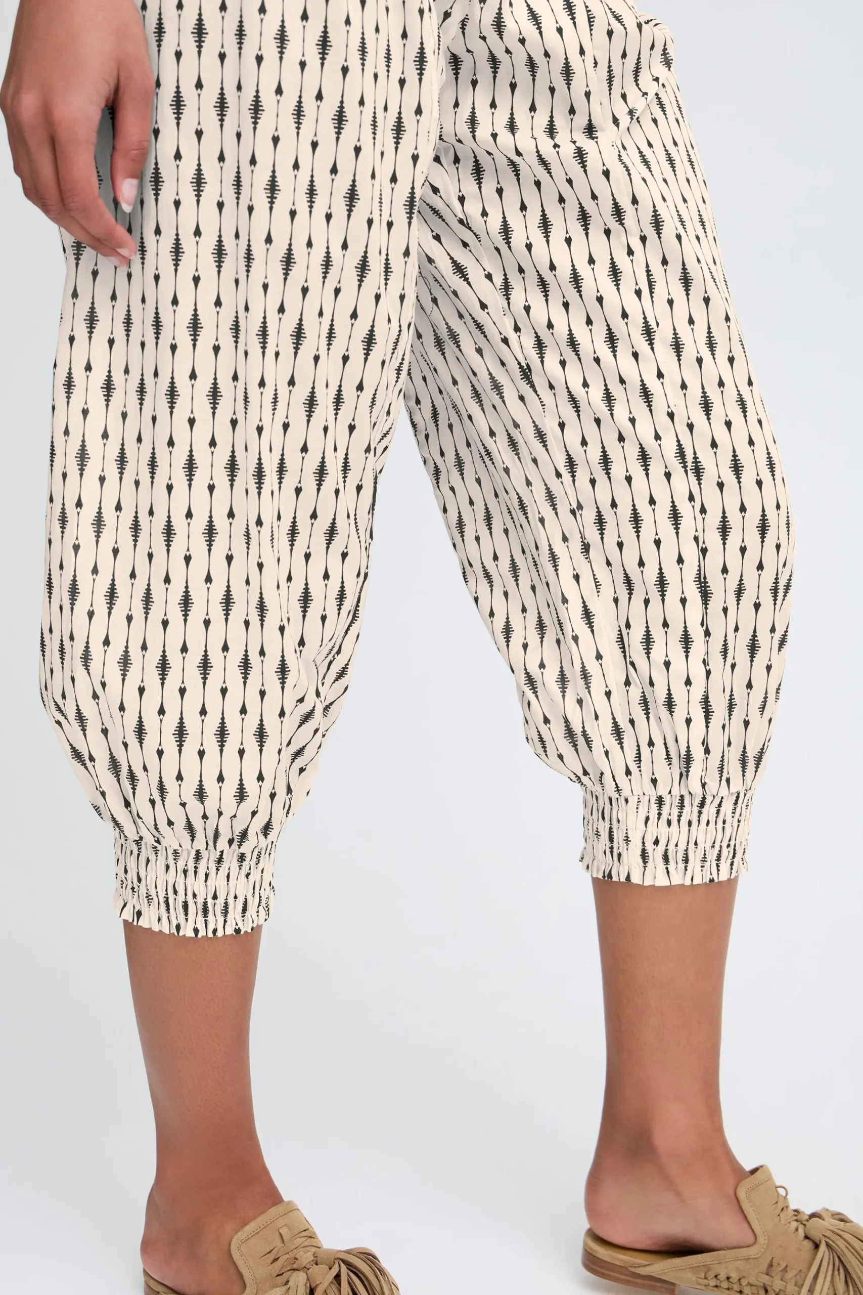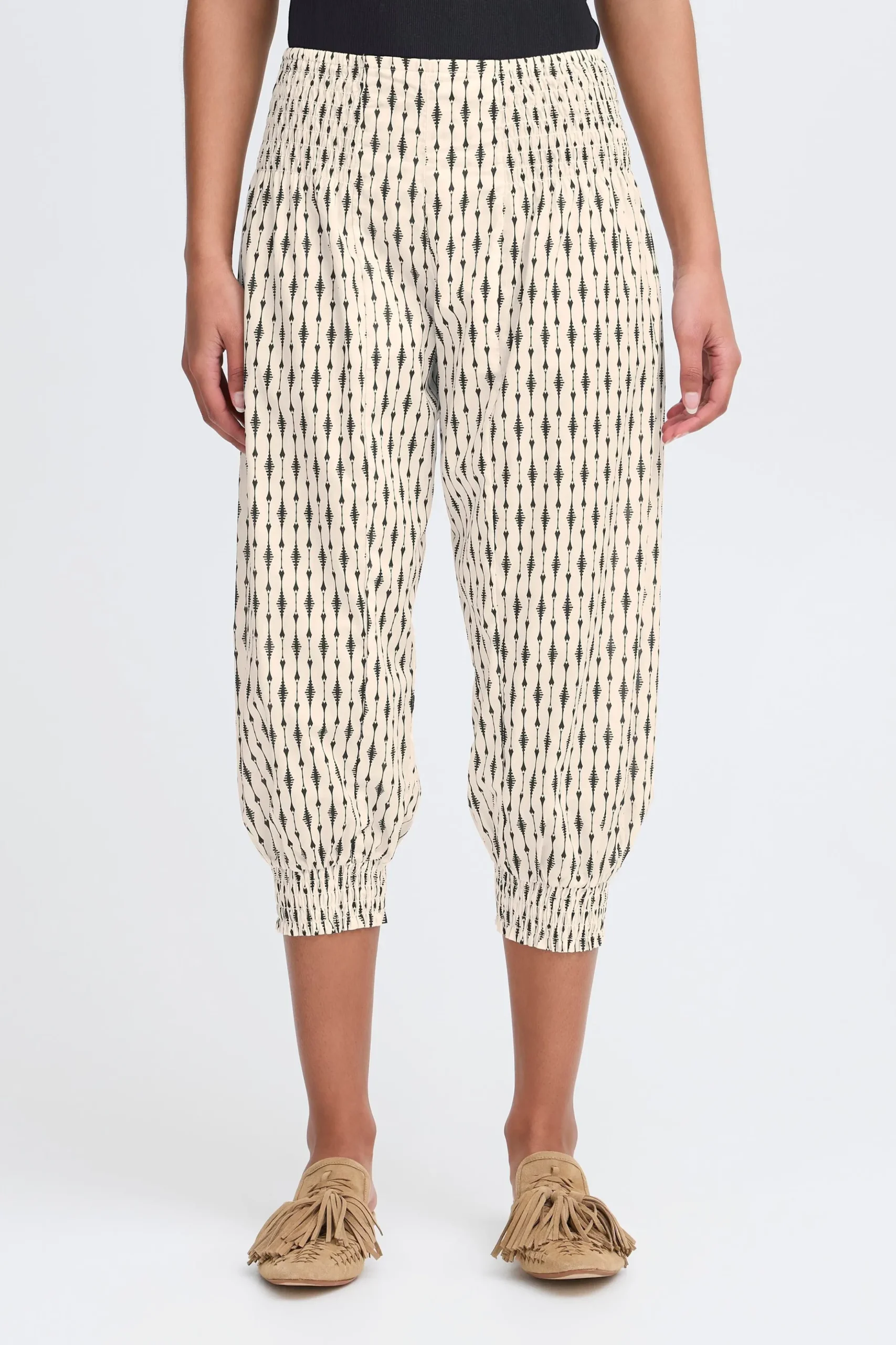 Løse capribukser i let kvalitet med oversize pasform og haremseffekt. Bred smockeffekt i taljen. Elastik i bukseben. Brug dem med en T-shirt for et casual udtryk eller en fin bluse for et feminint udtryk med et råt twist.