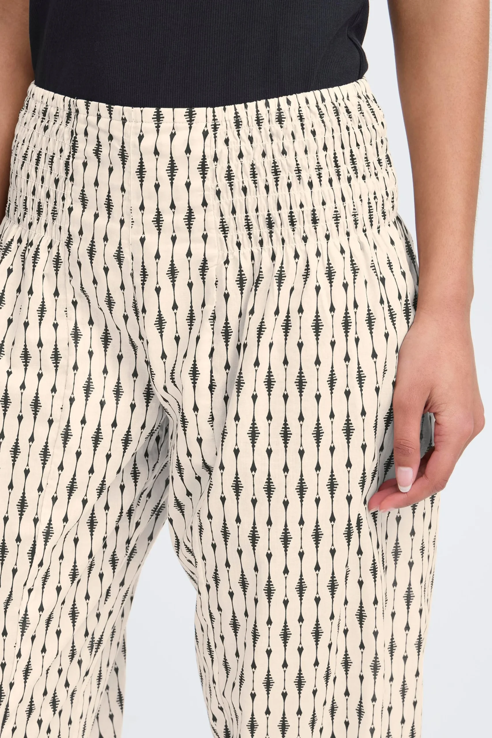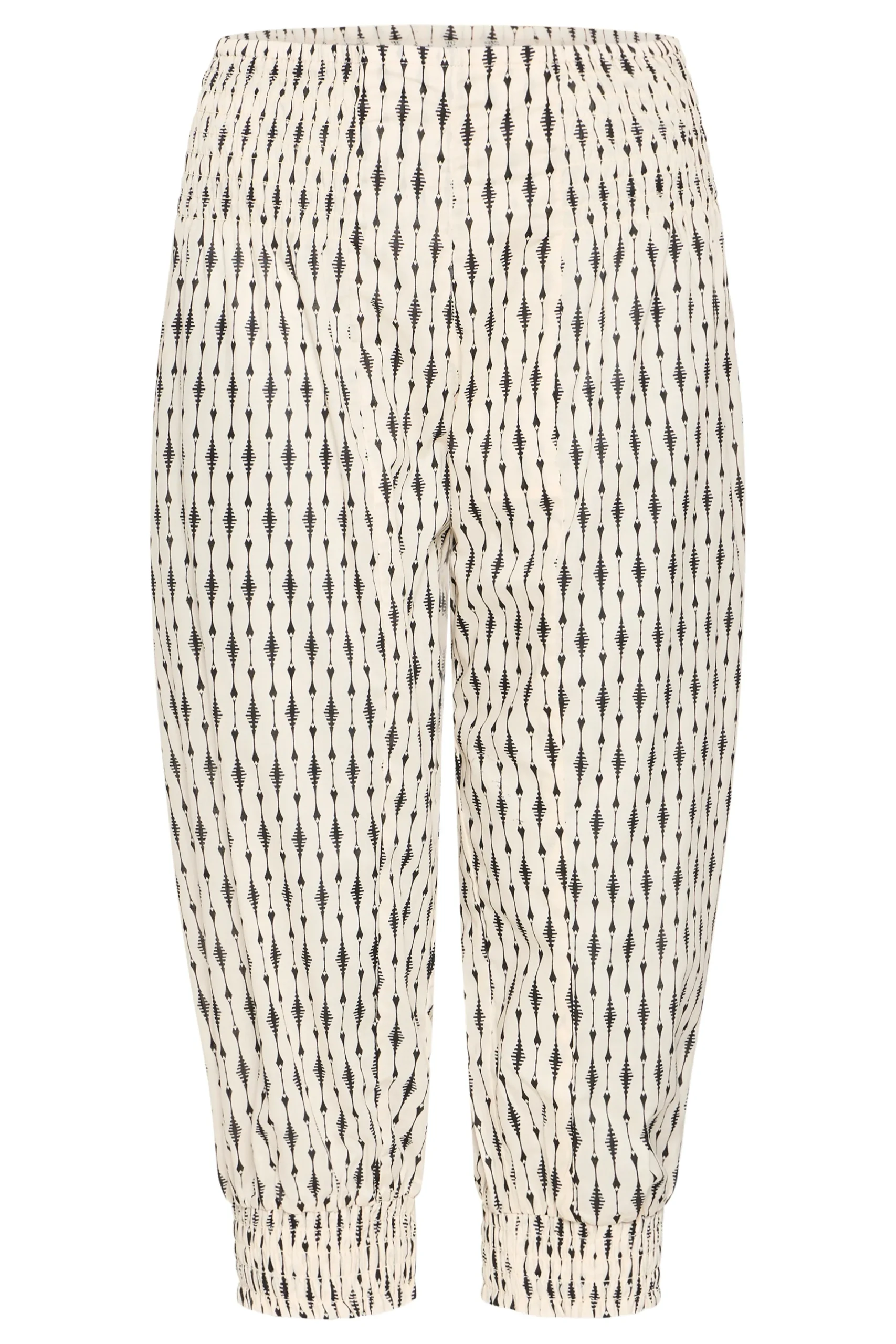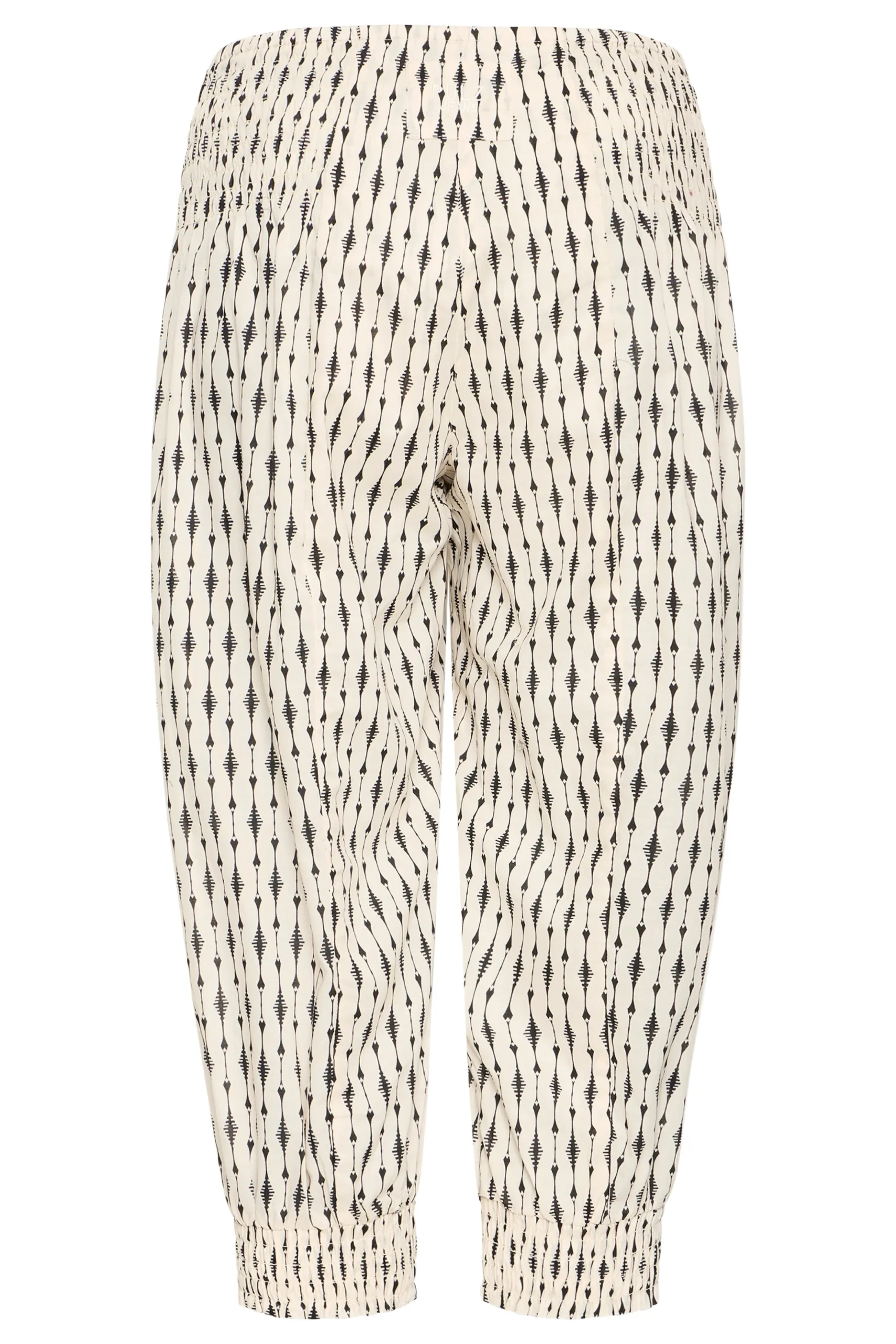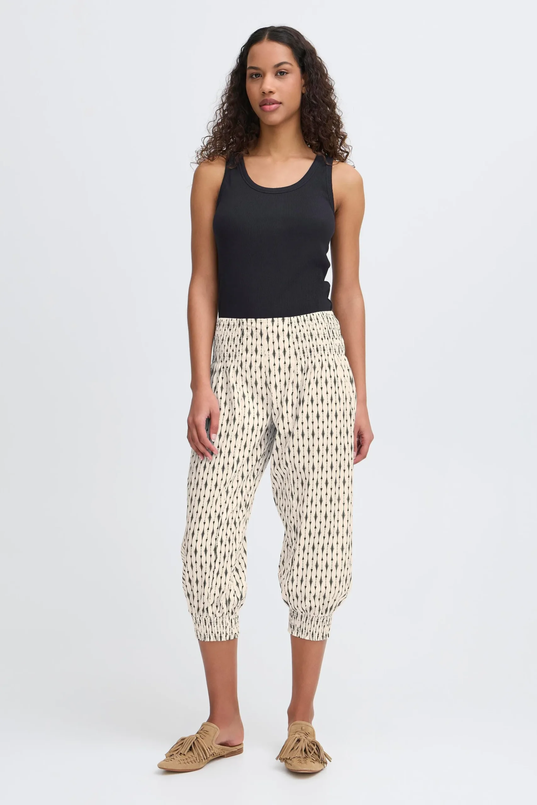 Løse capribukser i let kvalitet med oversize pasform og haremseffekt. Bred smockeffekt i taljen. Elastik i bukseben. Brug dem med en T-shirt for et casual udtryk eller en fin bluse for et feminint udtryk med et råt twist.