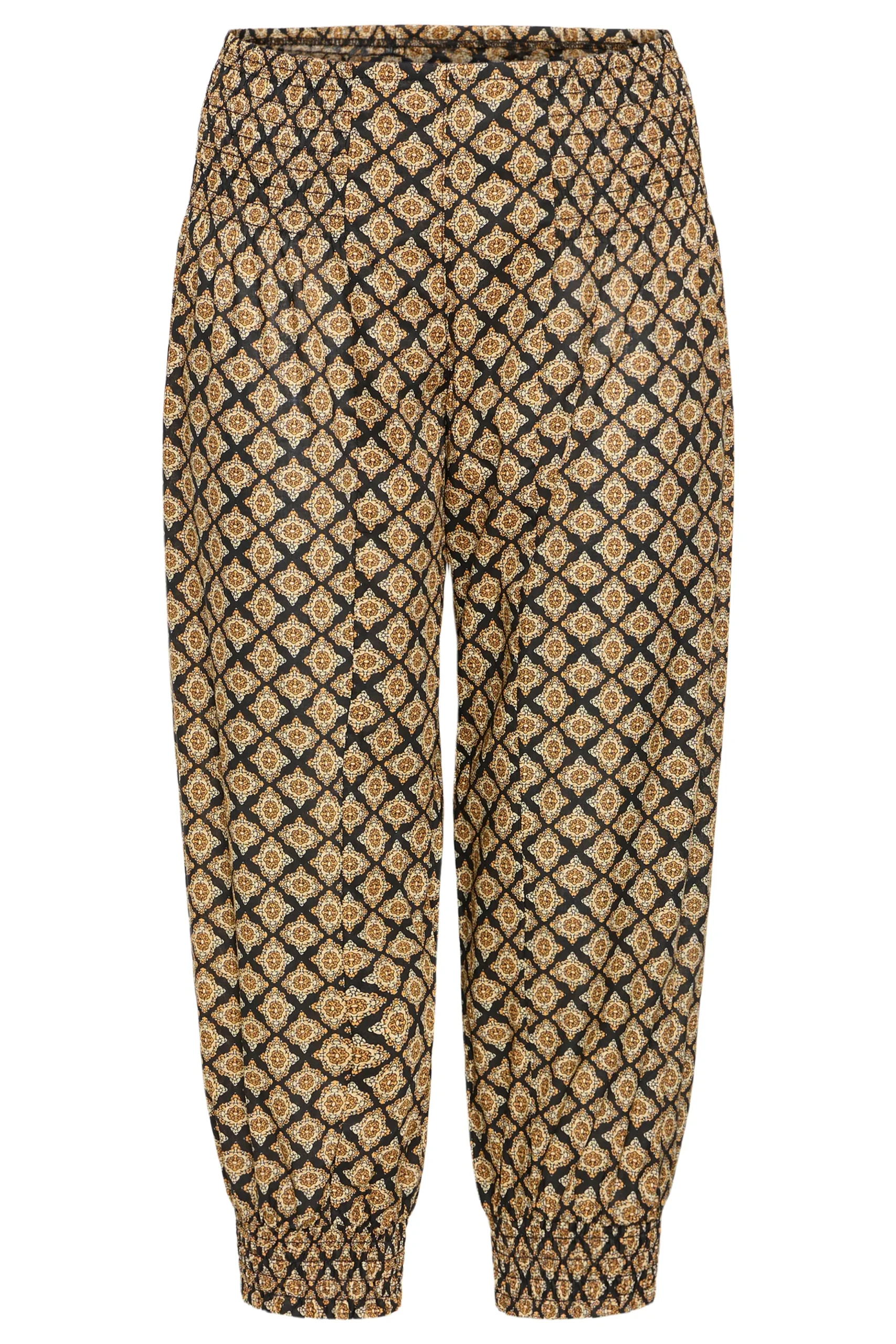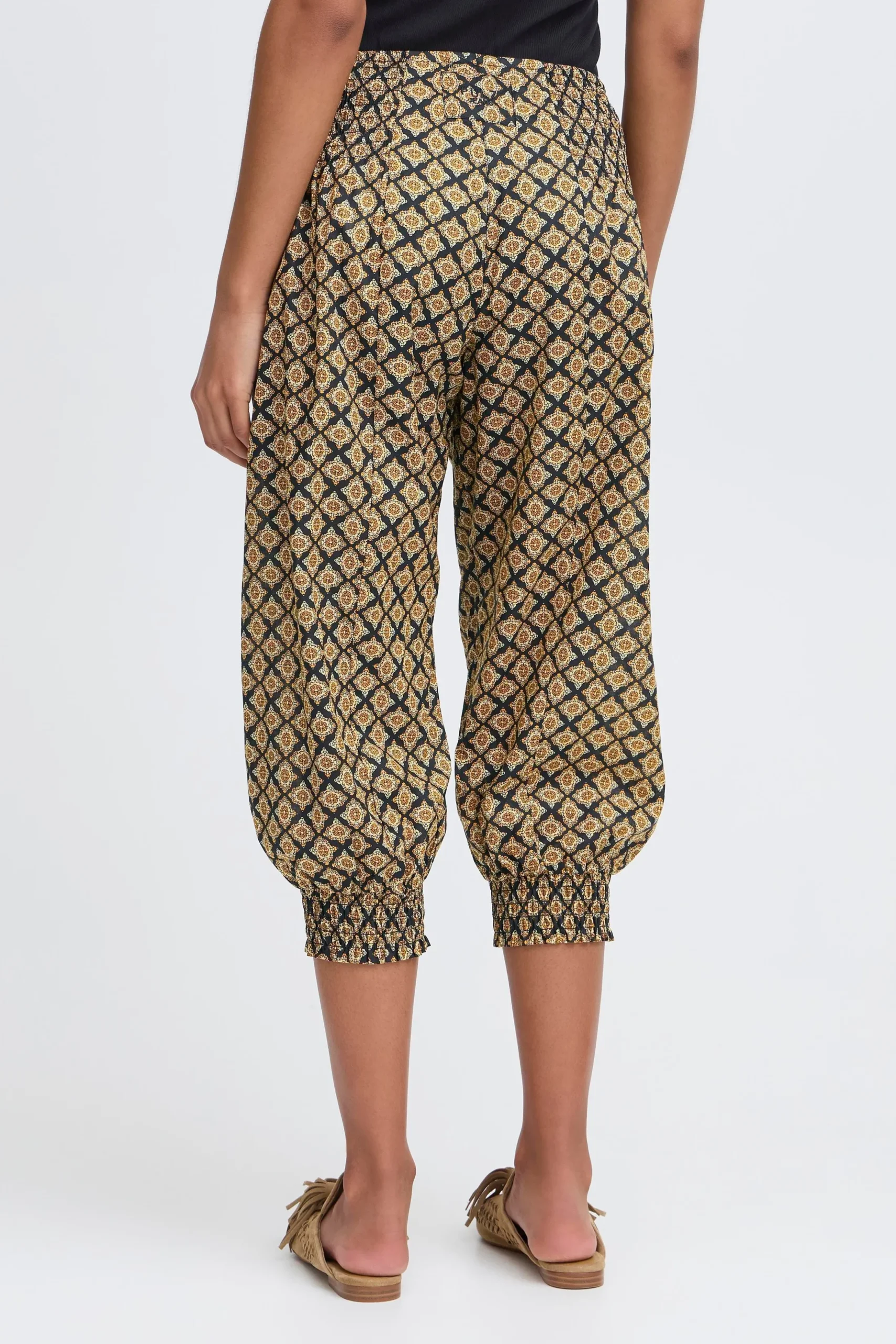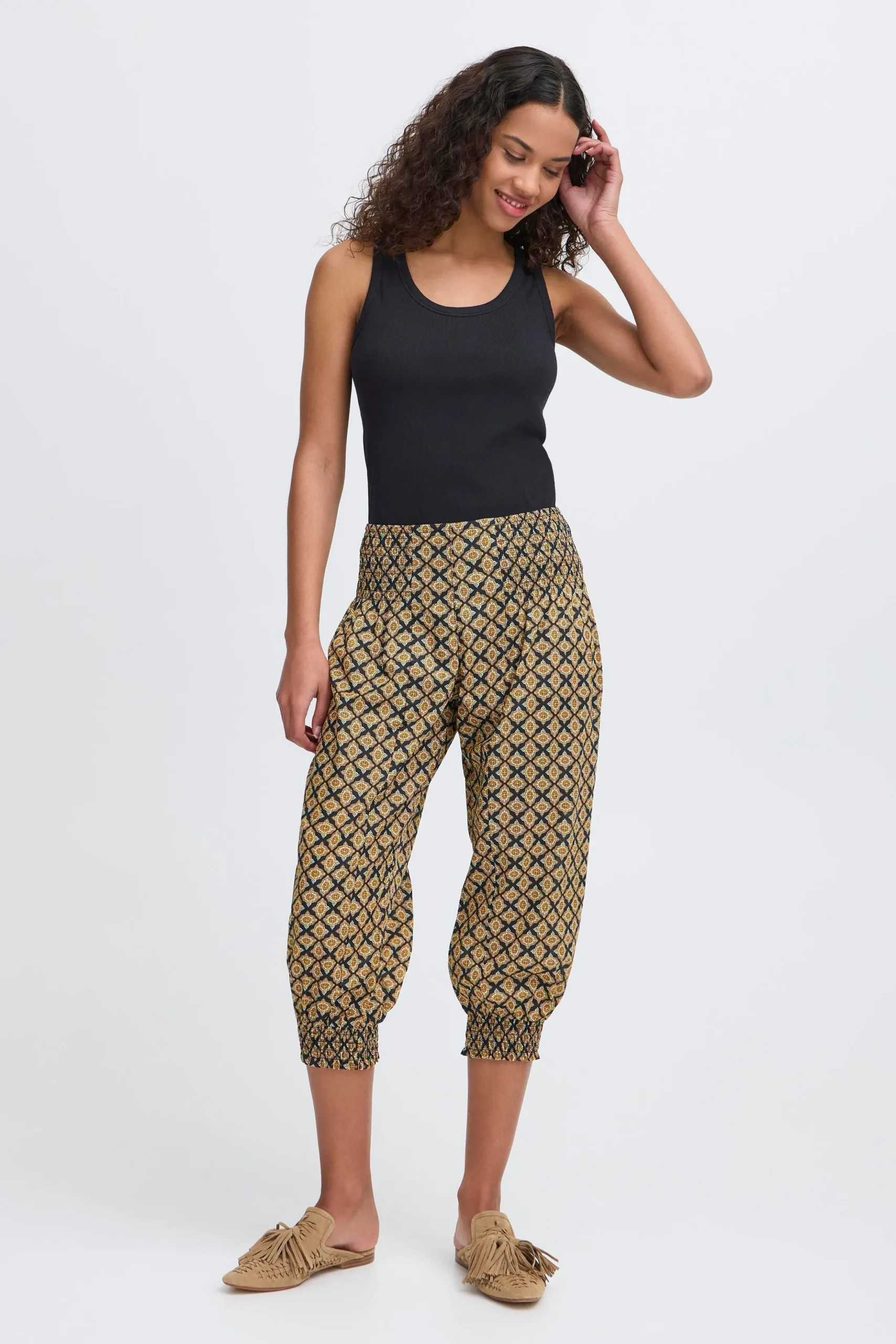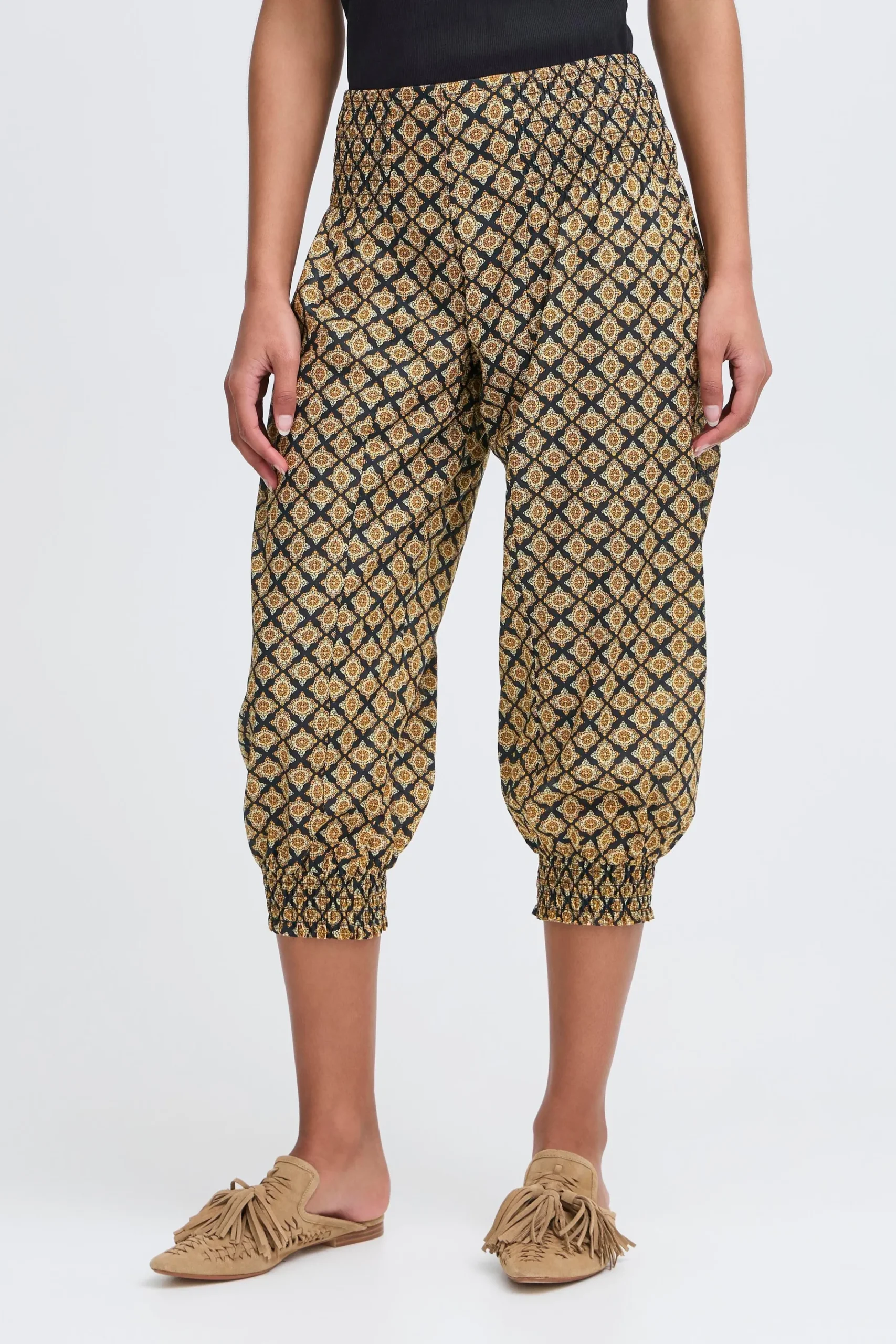Løse capribukser i let kvalitet med oversize pasform og haremseffekt. Bred smockeffekt i taljen. Elastik i bukseben. Brug dem med en T-shirt for et casual udtryk eller en fin bluse for et feminint udtryk med et råt twist.