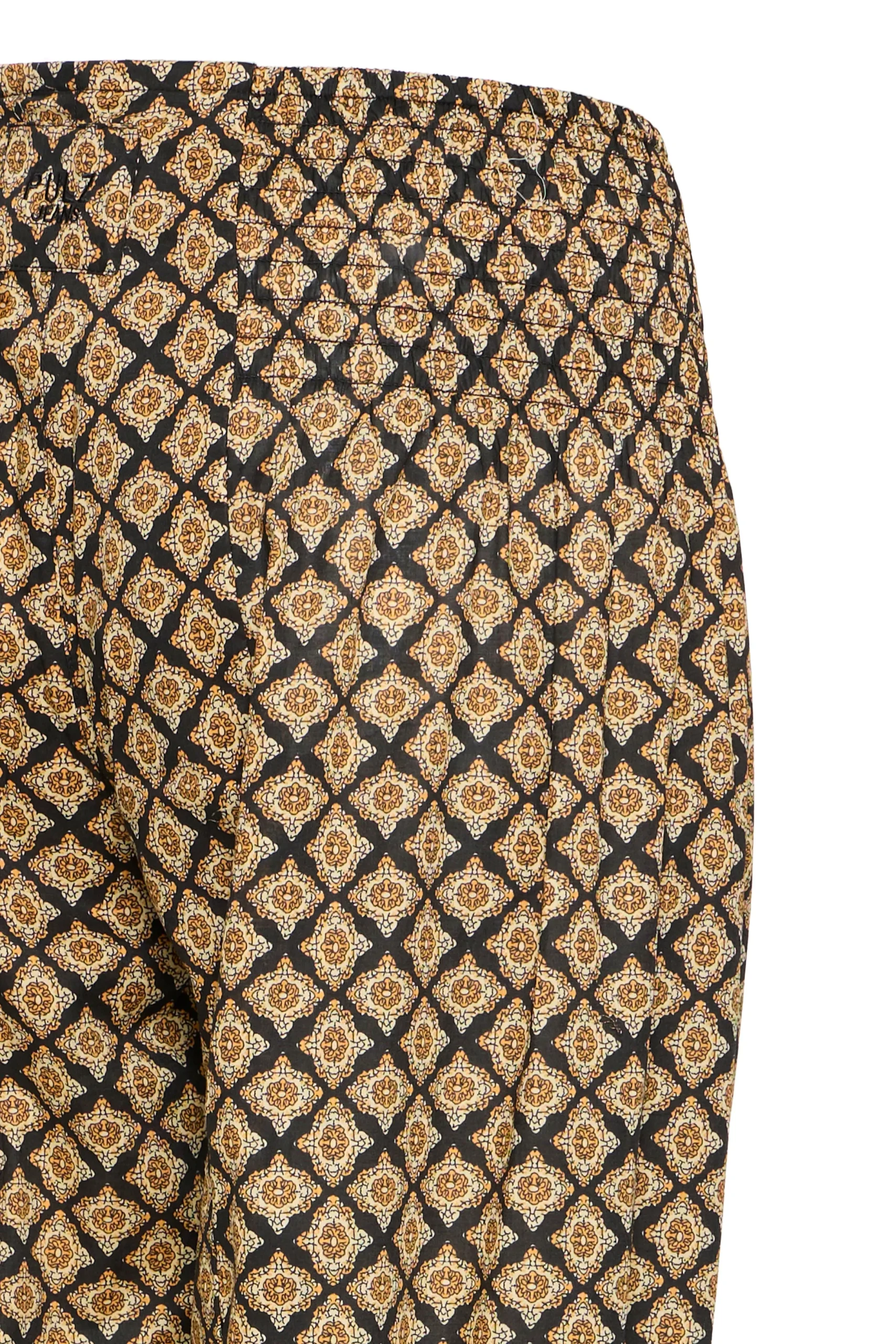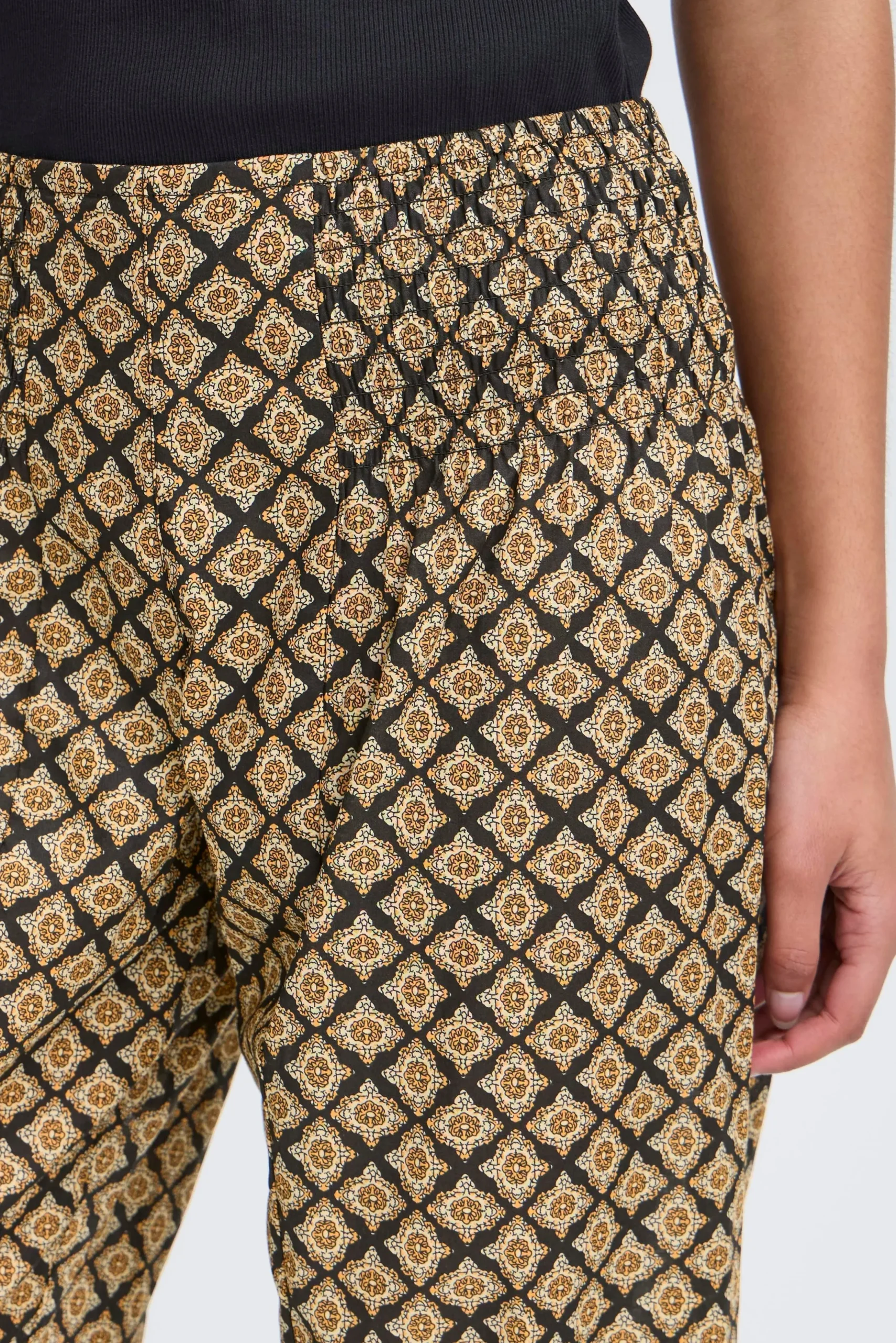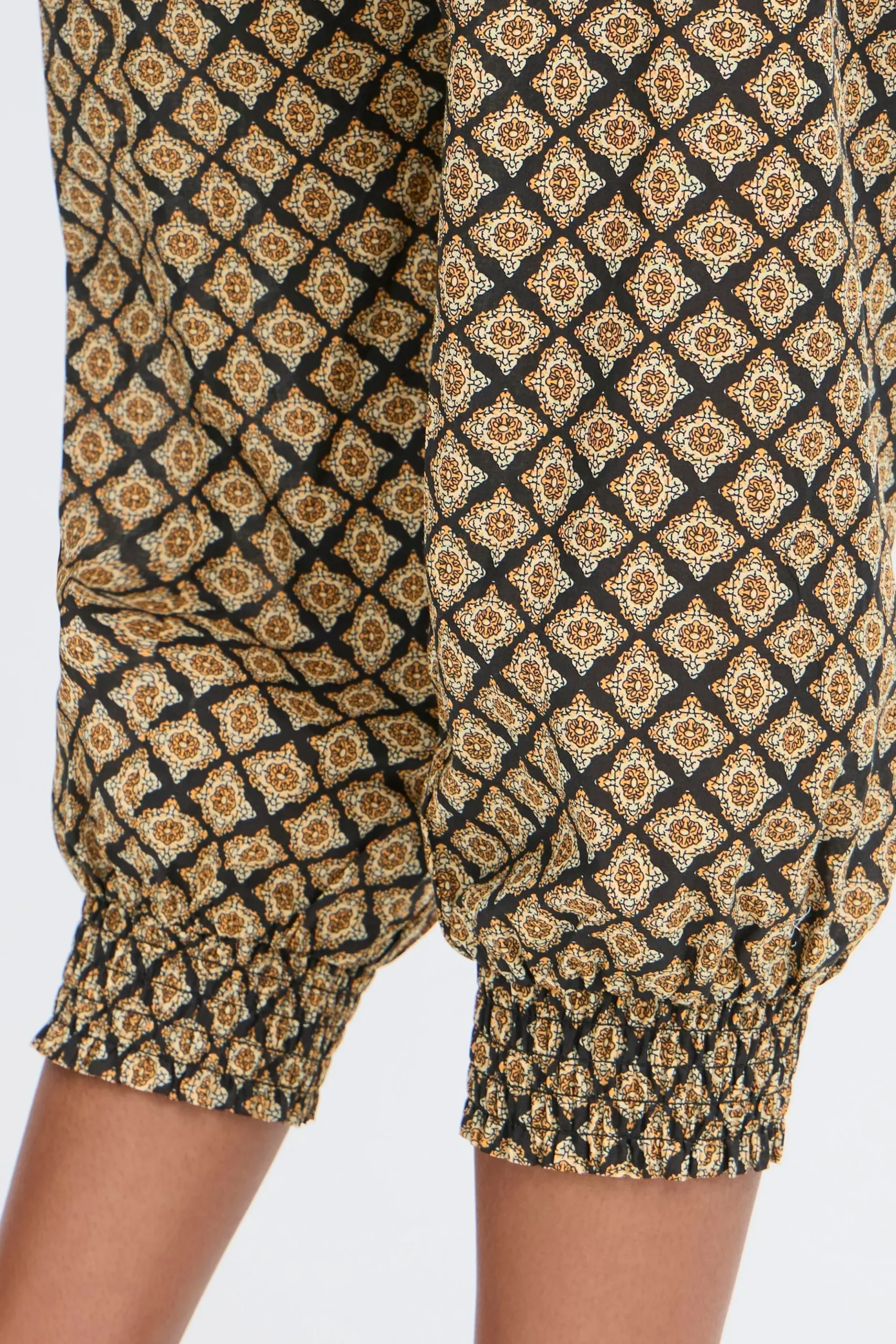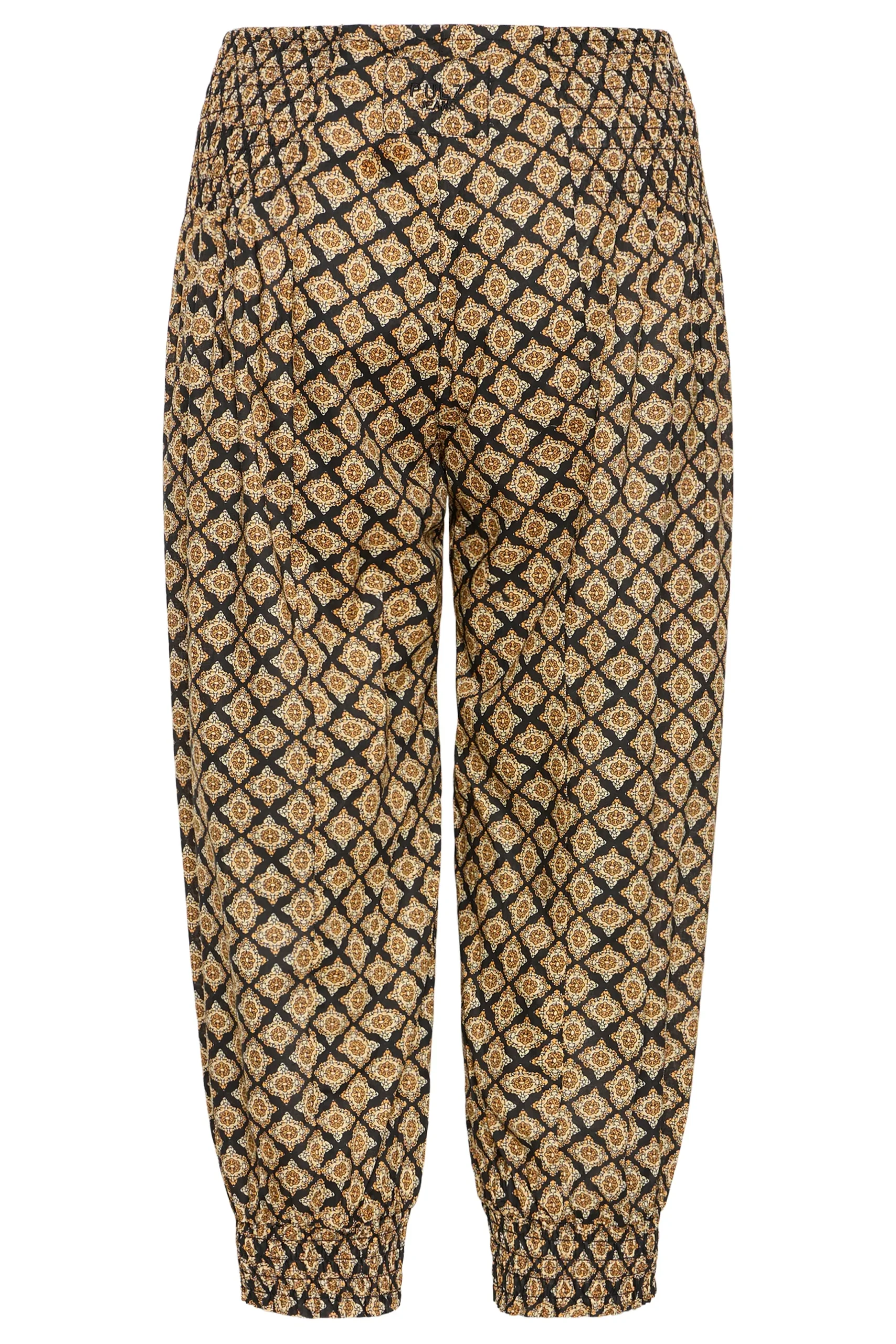 Løse capribukser i let kvalitet med oversize pasform og haremseffekt. Bred smockeffekt i taljen. Elastik i bukseben. Brug dem med en T-shirt for et casual udtryk eller en fin bluse for et feminint udtryk med et råt twist.