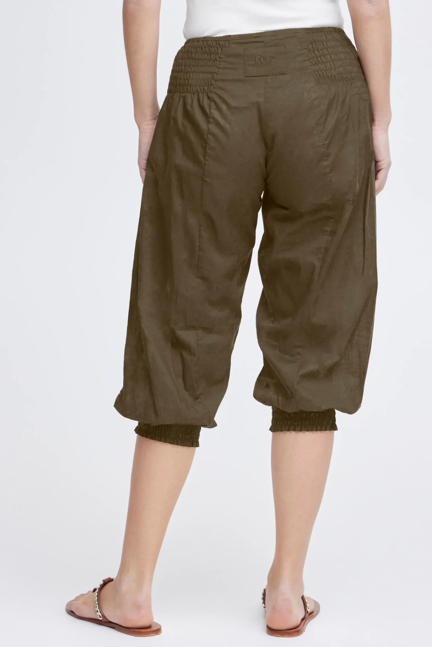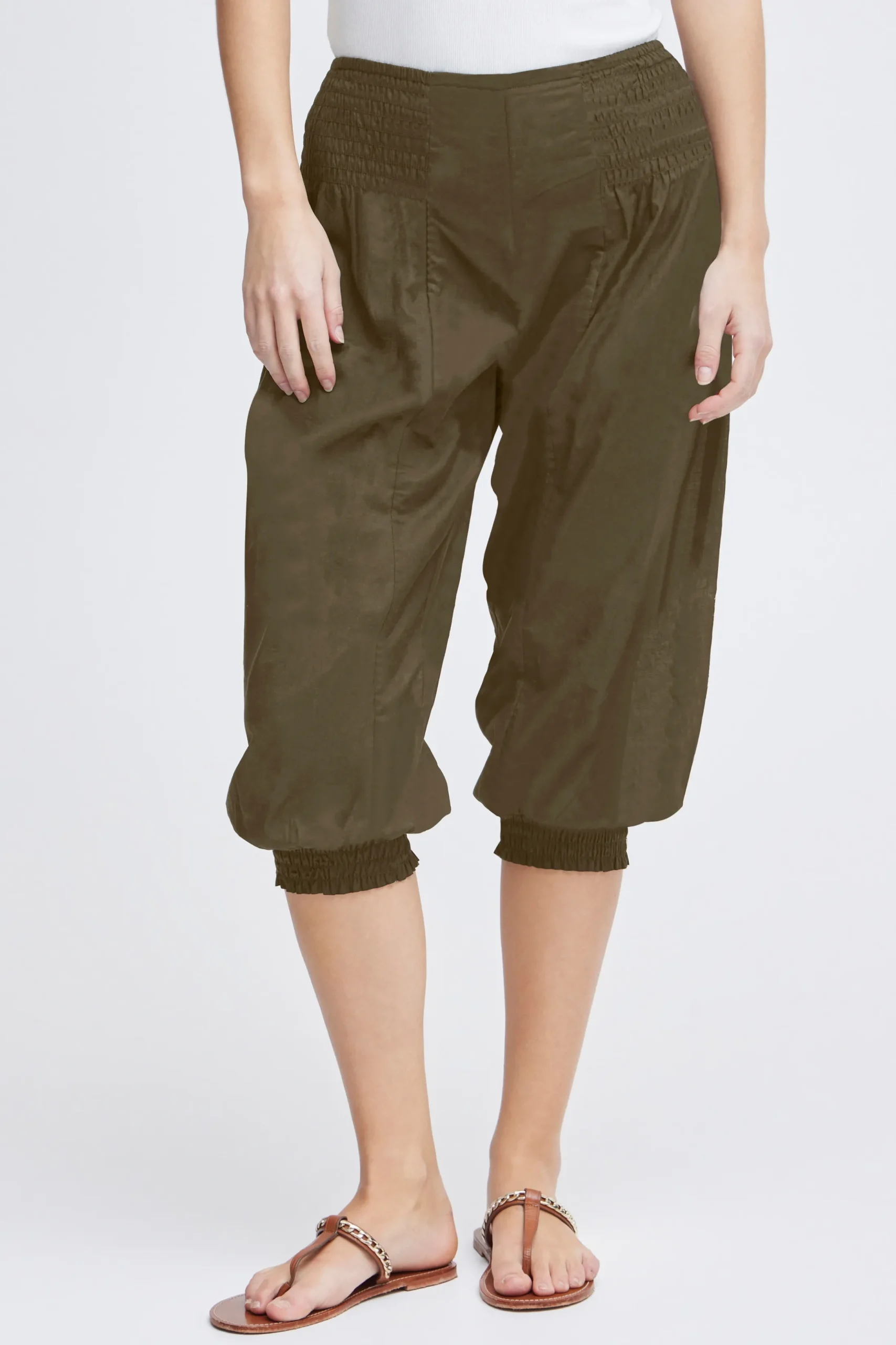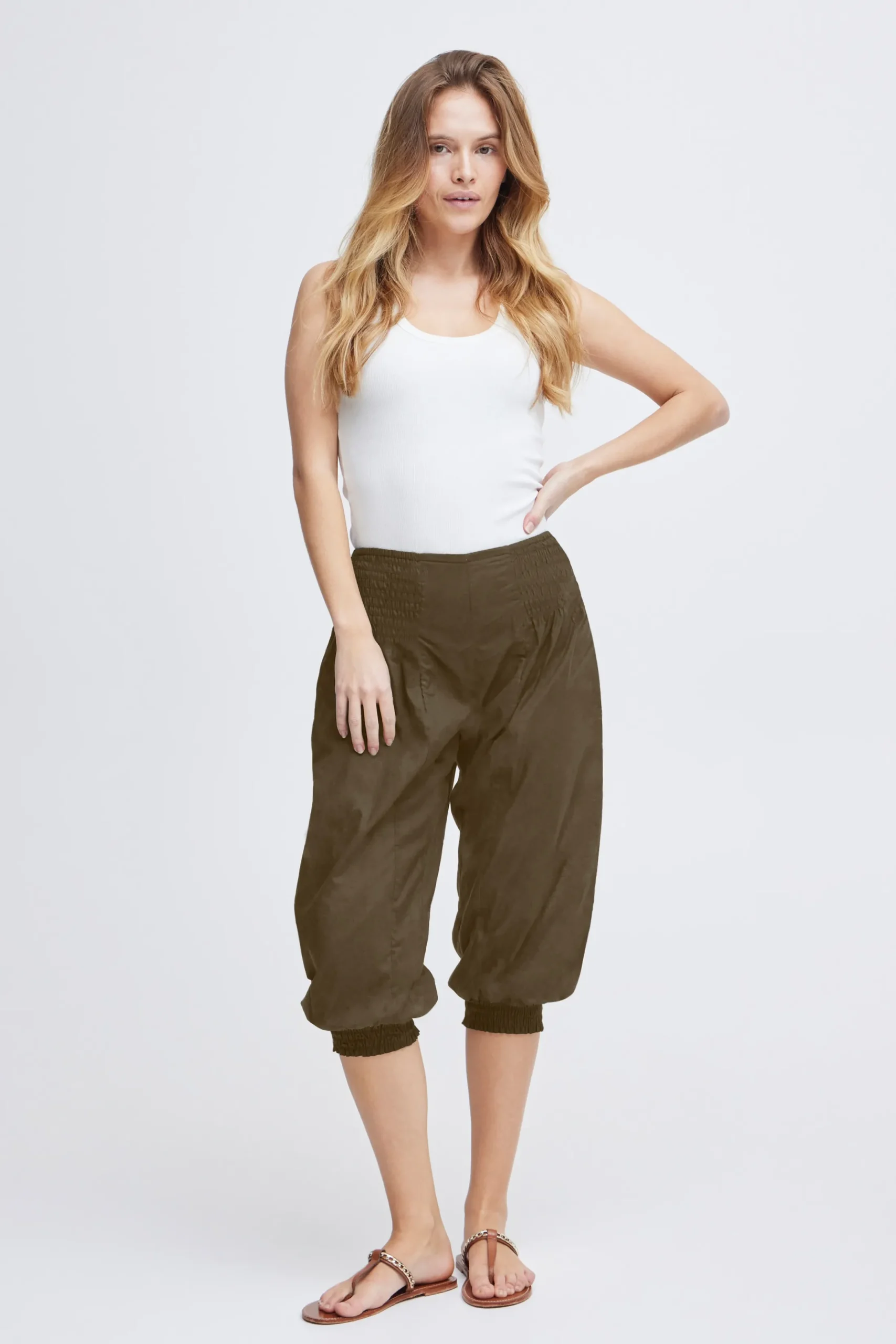 Løse capribukser i let kvalitet med oversize pasform og haremseffekt. Bred smockeffekt i taljen. Elastik i bukseben. Brug dem med en T-shirt for et casual udtryk eller en fin bluse for et feminint udtryk med et råt twist.