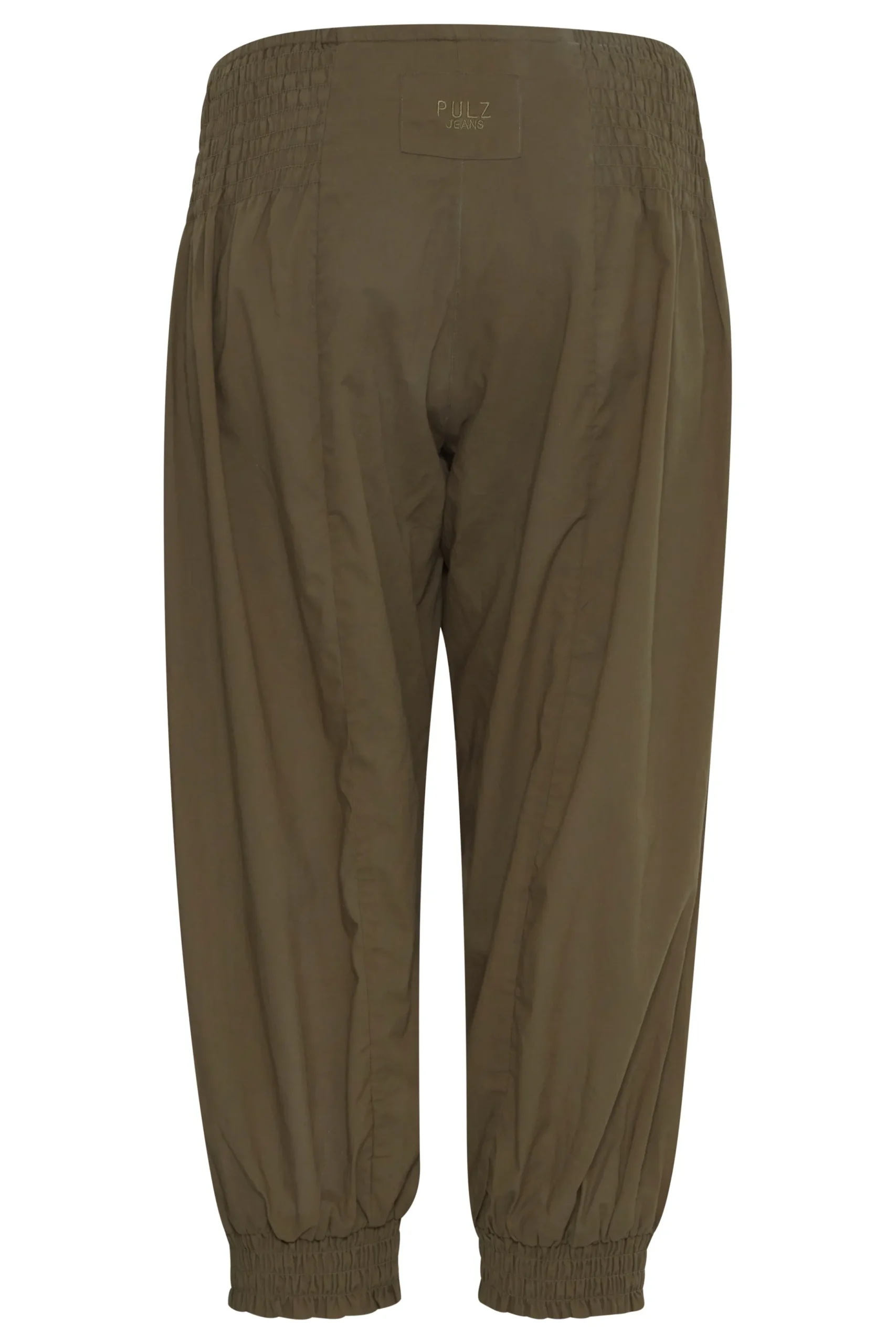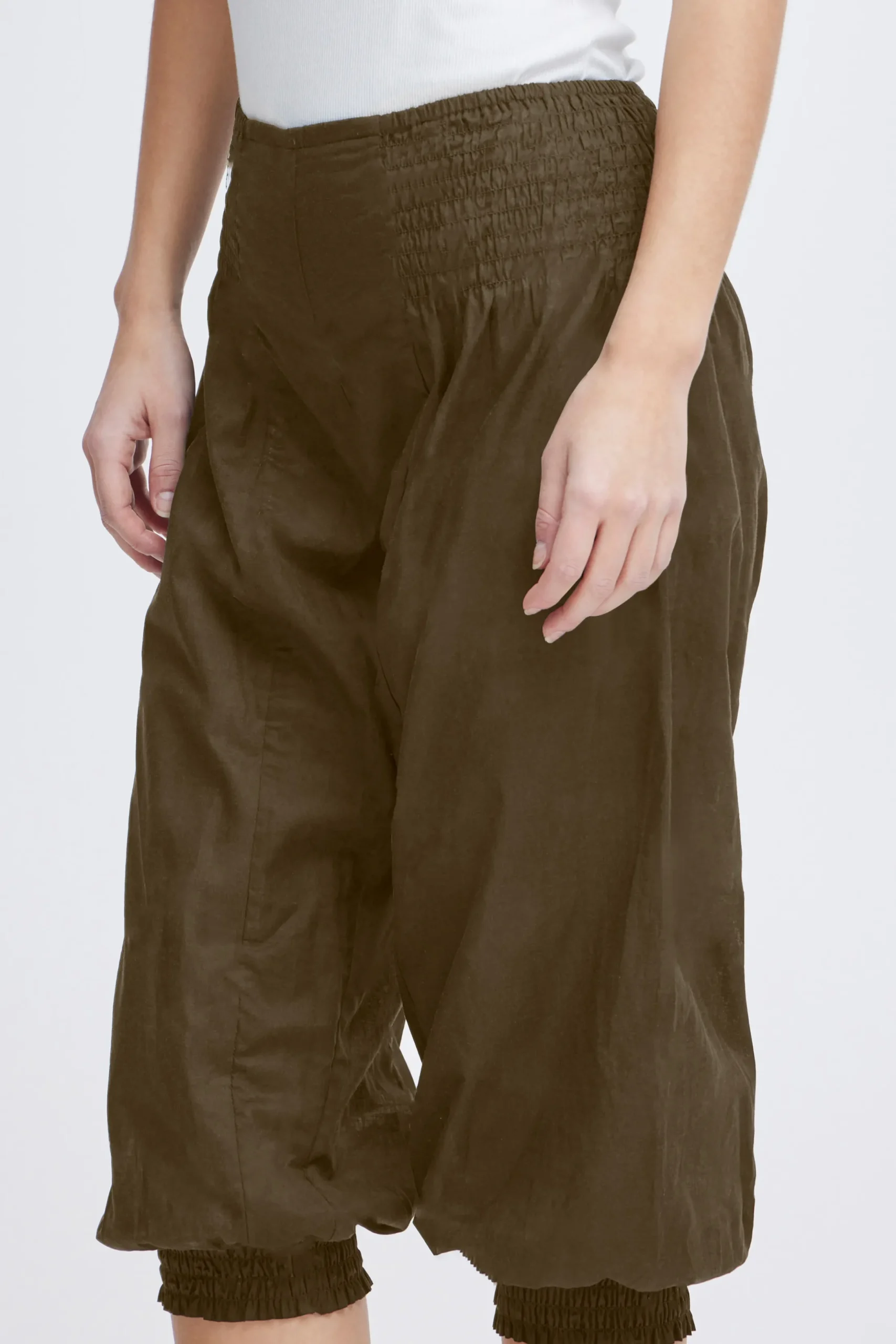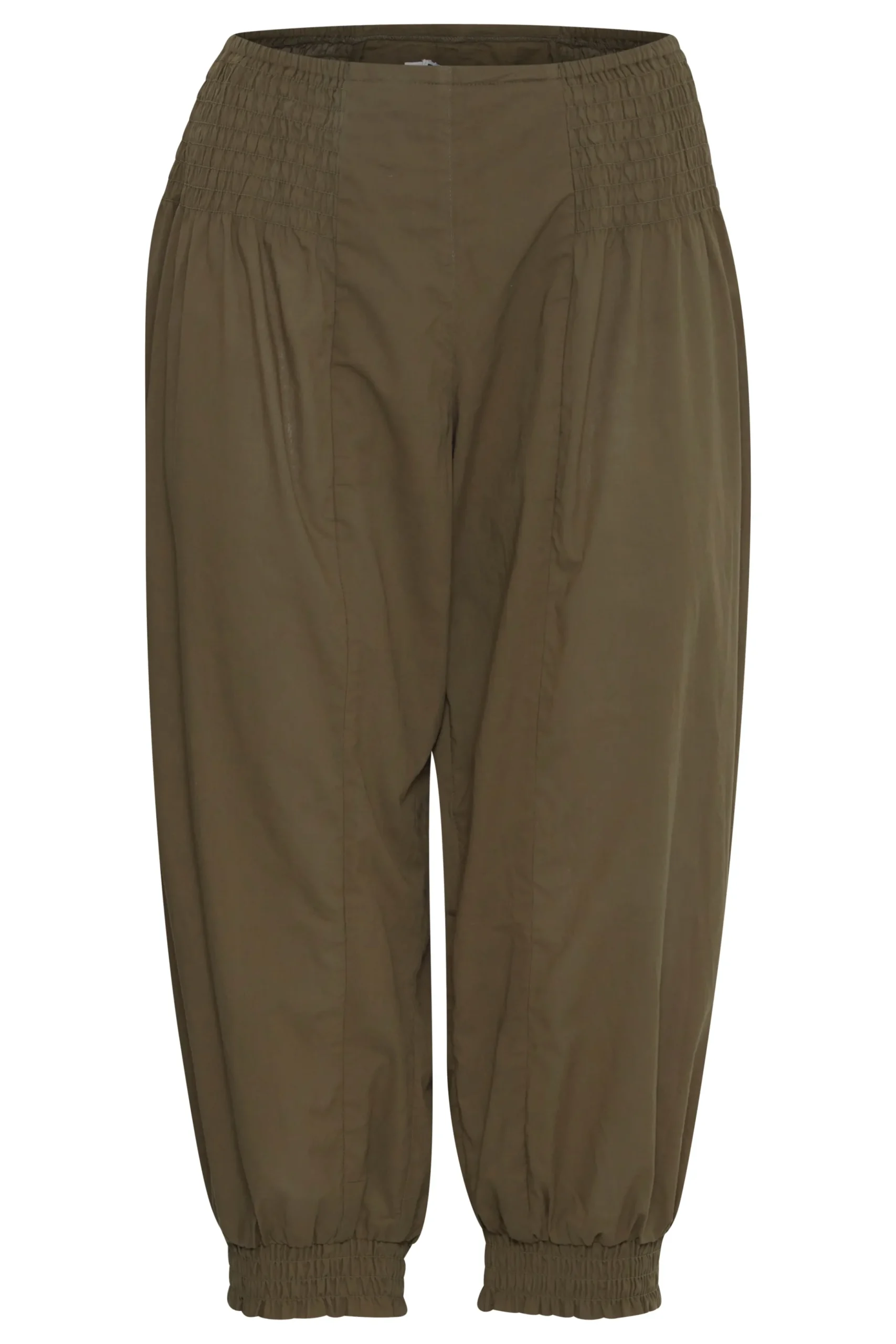 Løse capribukser i let kvalitet med oversize pasform og haremseffekt. Bred smockeffekt i taljen. Elastik i bukseben. Brug dem med en T-shirt for et casual udtryk eller en fin bluse for et feminint udtryk med et råt twist.