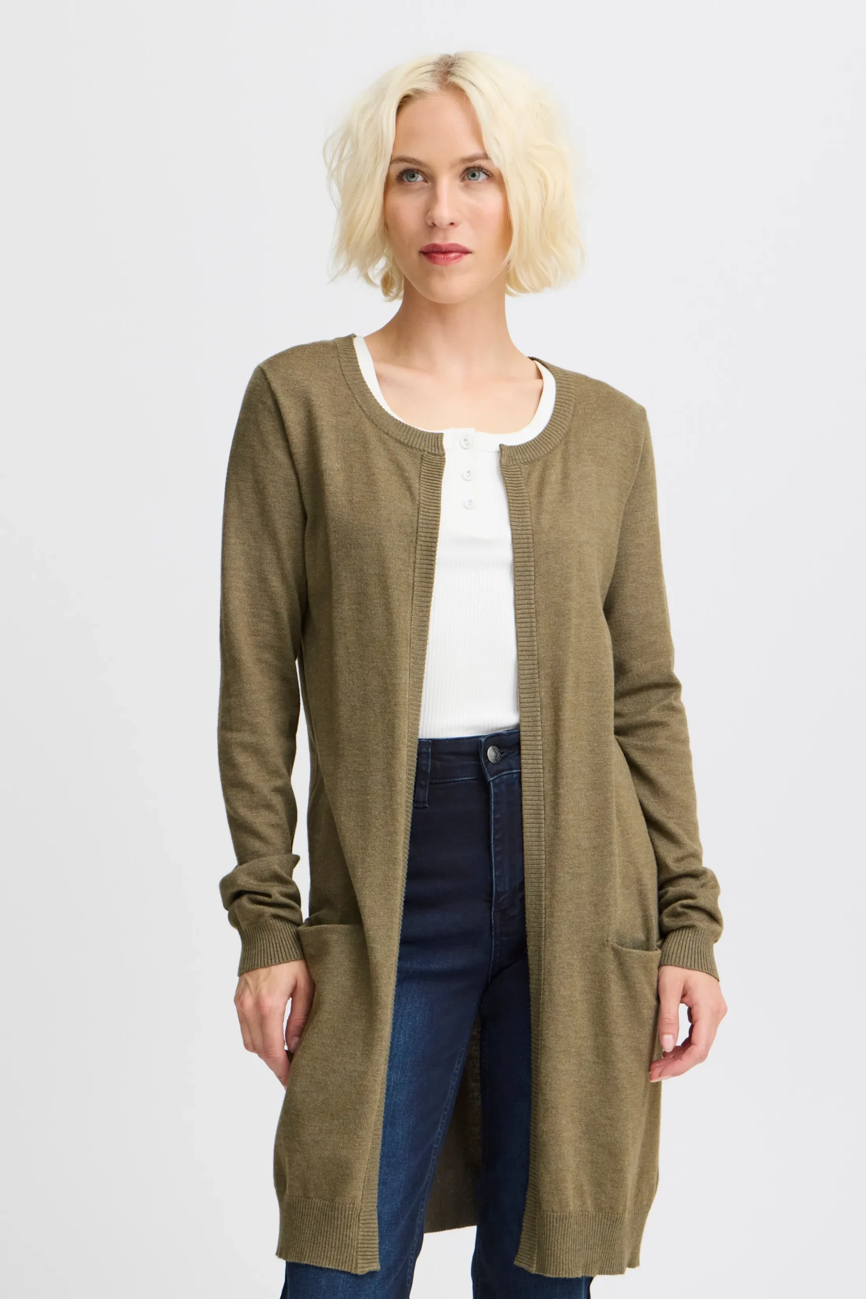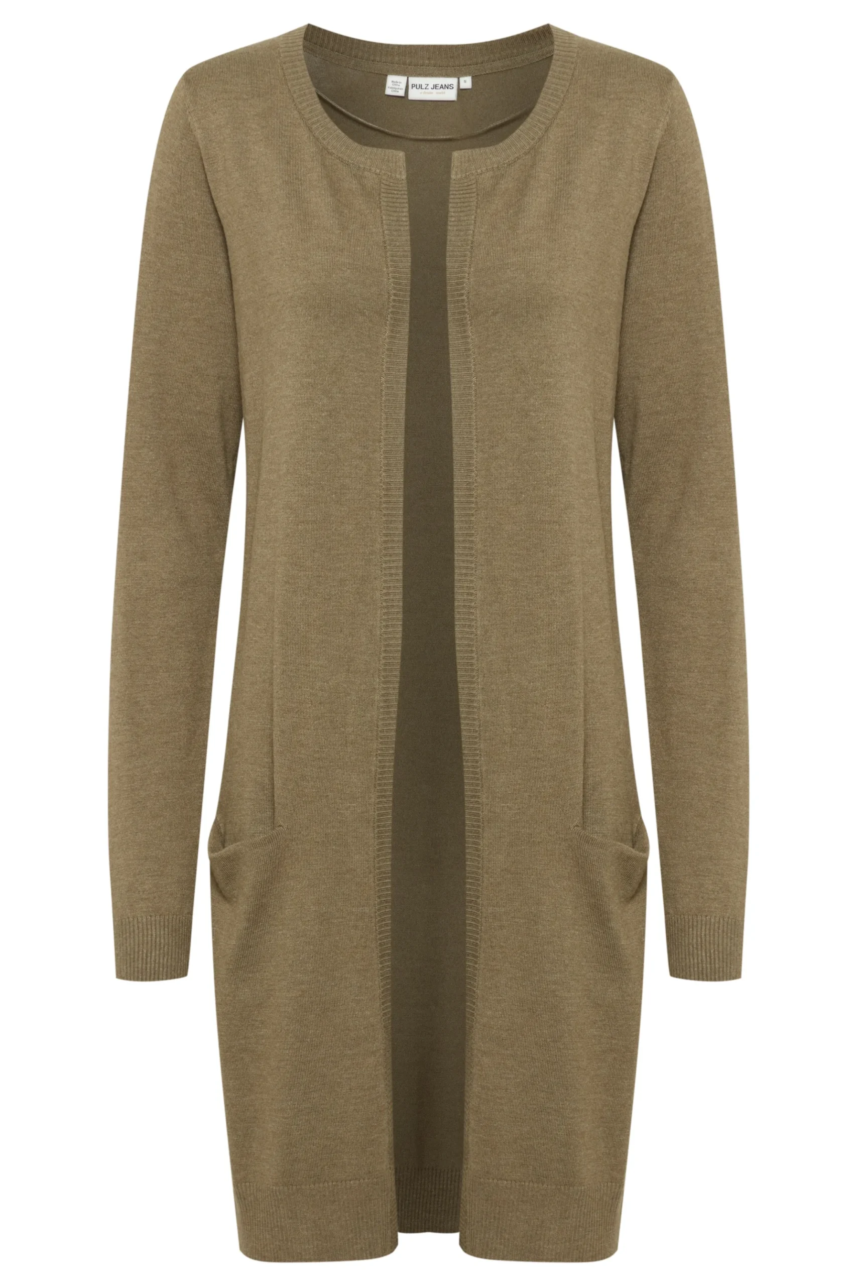 PULZ: Åbenstående lang cardigan i blød jersey kvalitet. Lange ærmer med bred ribkant på ærmerne. Lommer foran. Hiv denne skønhed ud af skabet når den korte cardigan ikke luner nok. Style med et par tætsiddende jeans og en fin bluse – den kan blive din i dag.