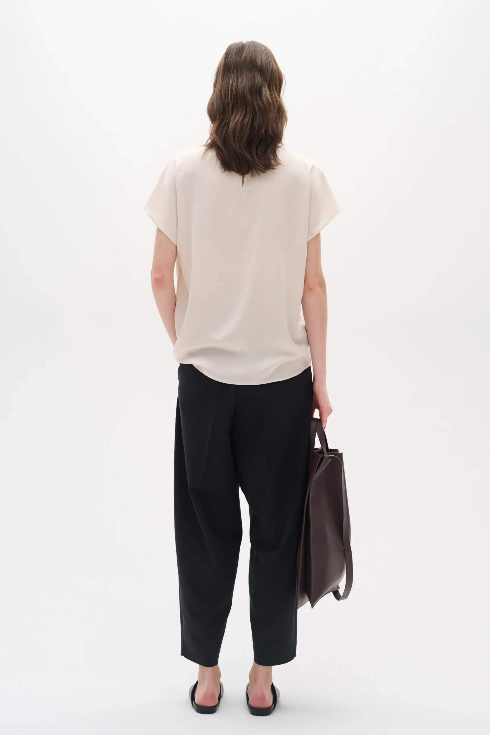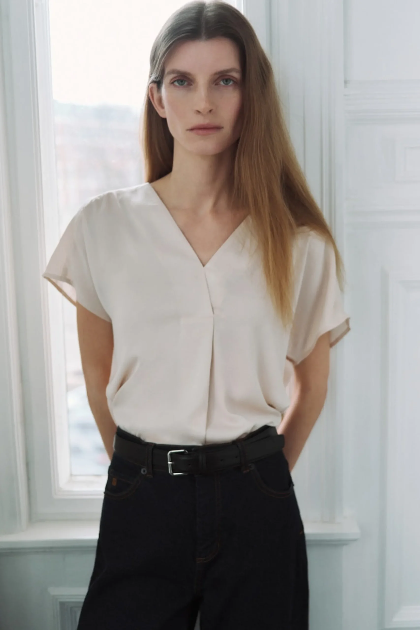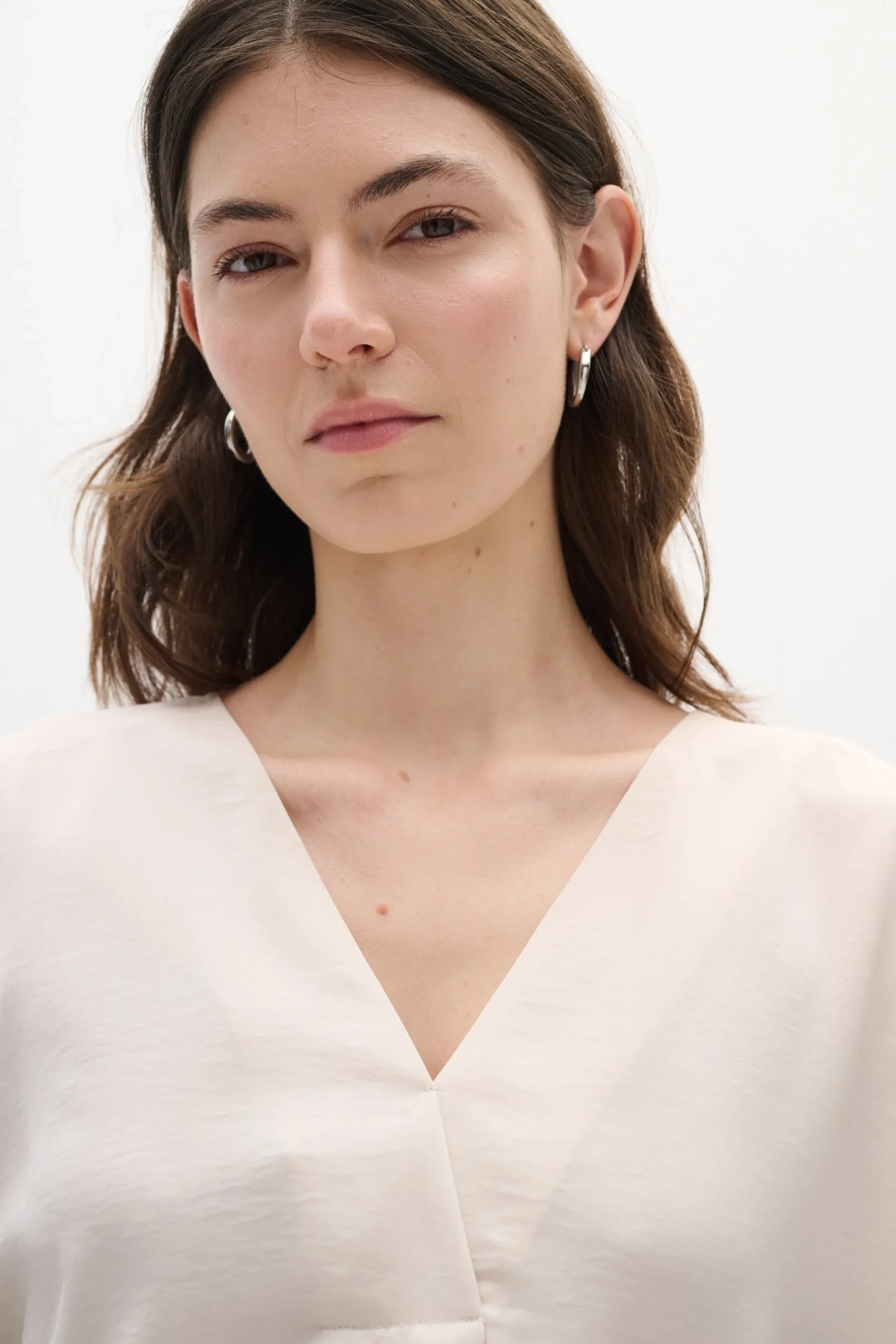 Bluse fra InWear med V-hals. Korte ærmer. Slids i nakke med knap. Afrundet forneden. Vævet kvalitet. Løstsiddende pasform.