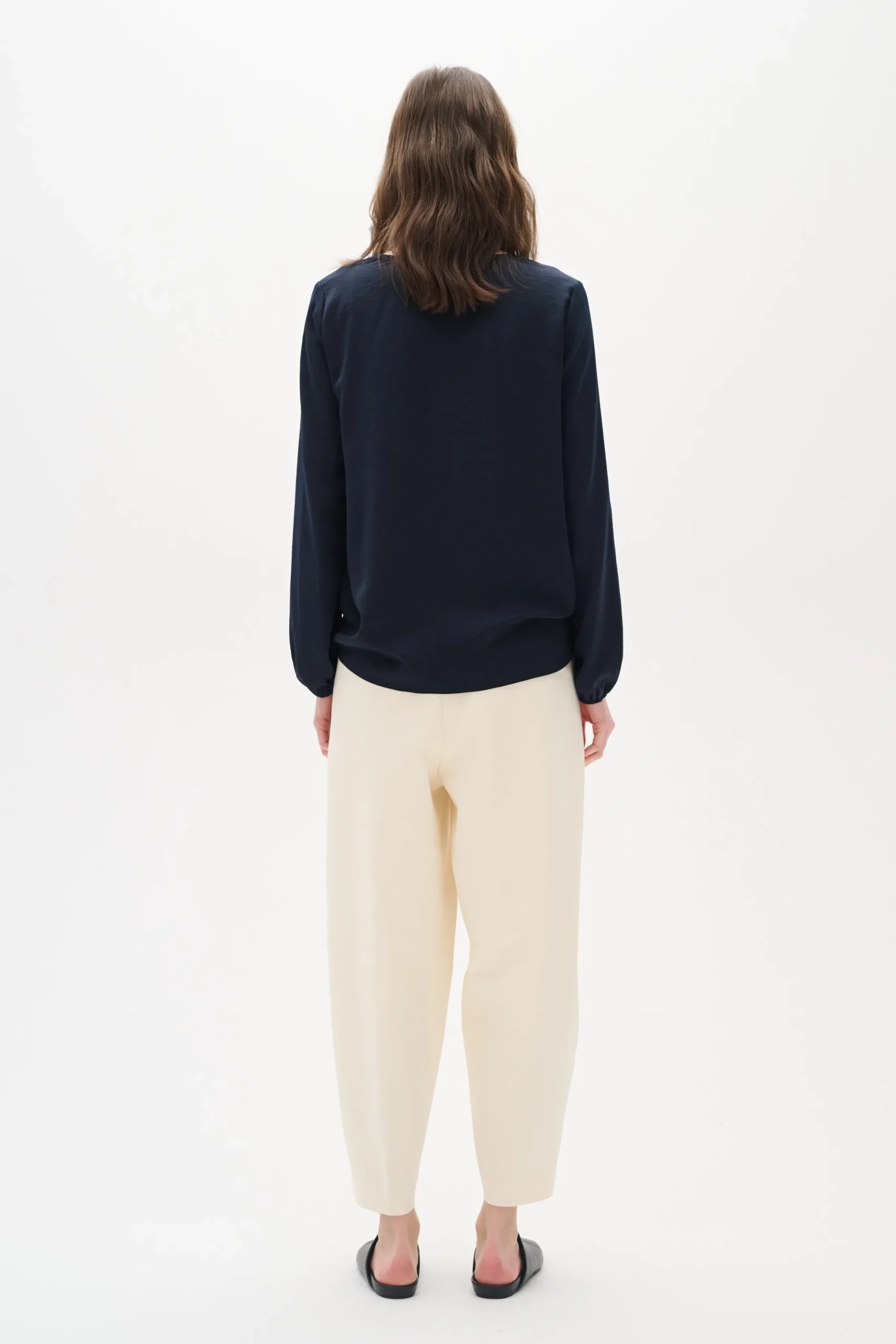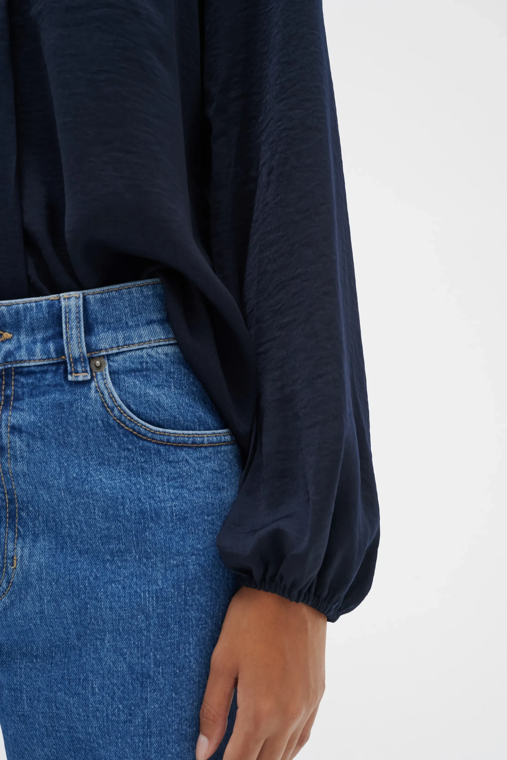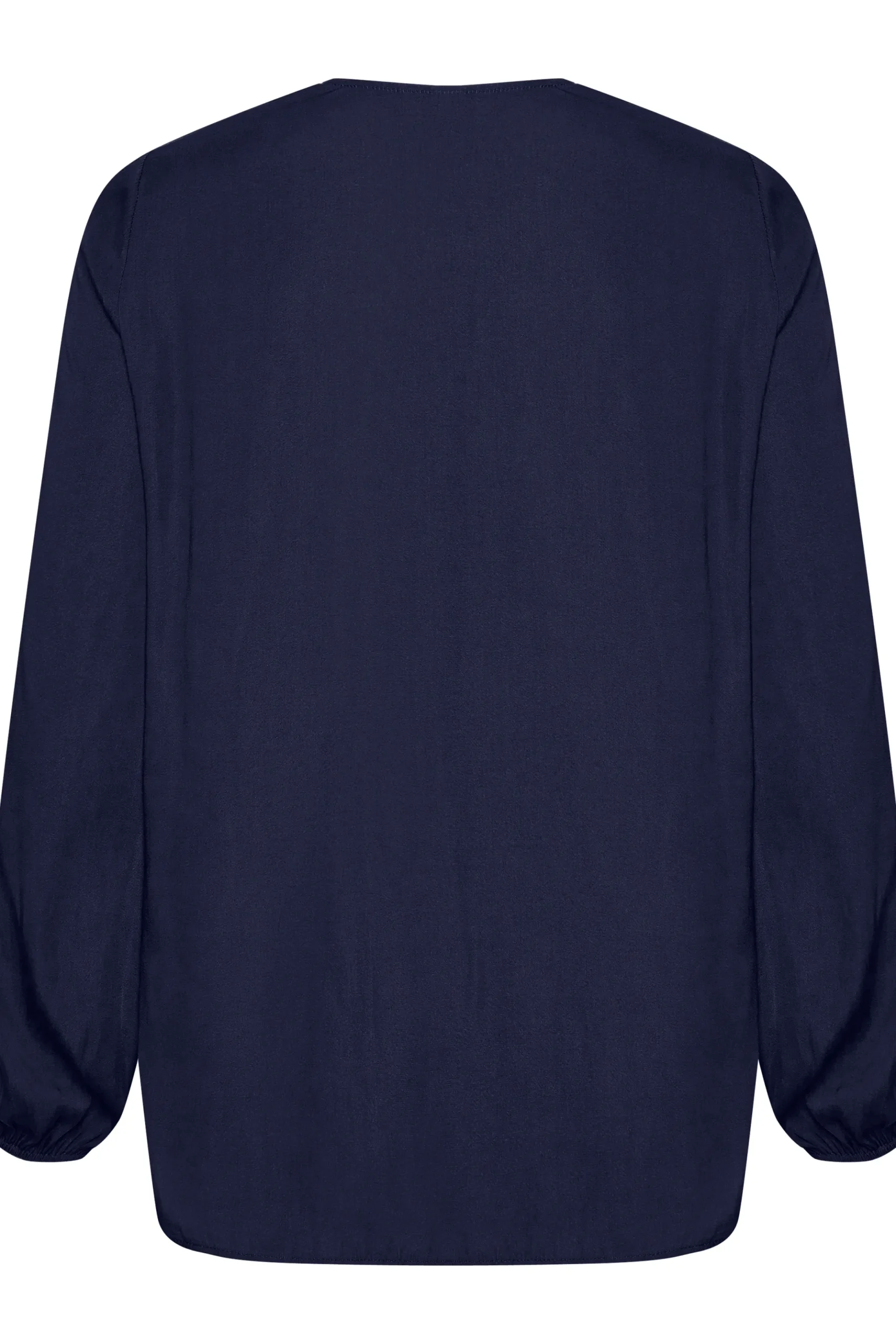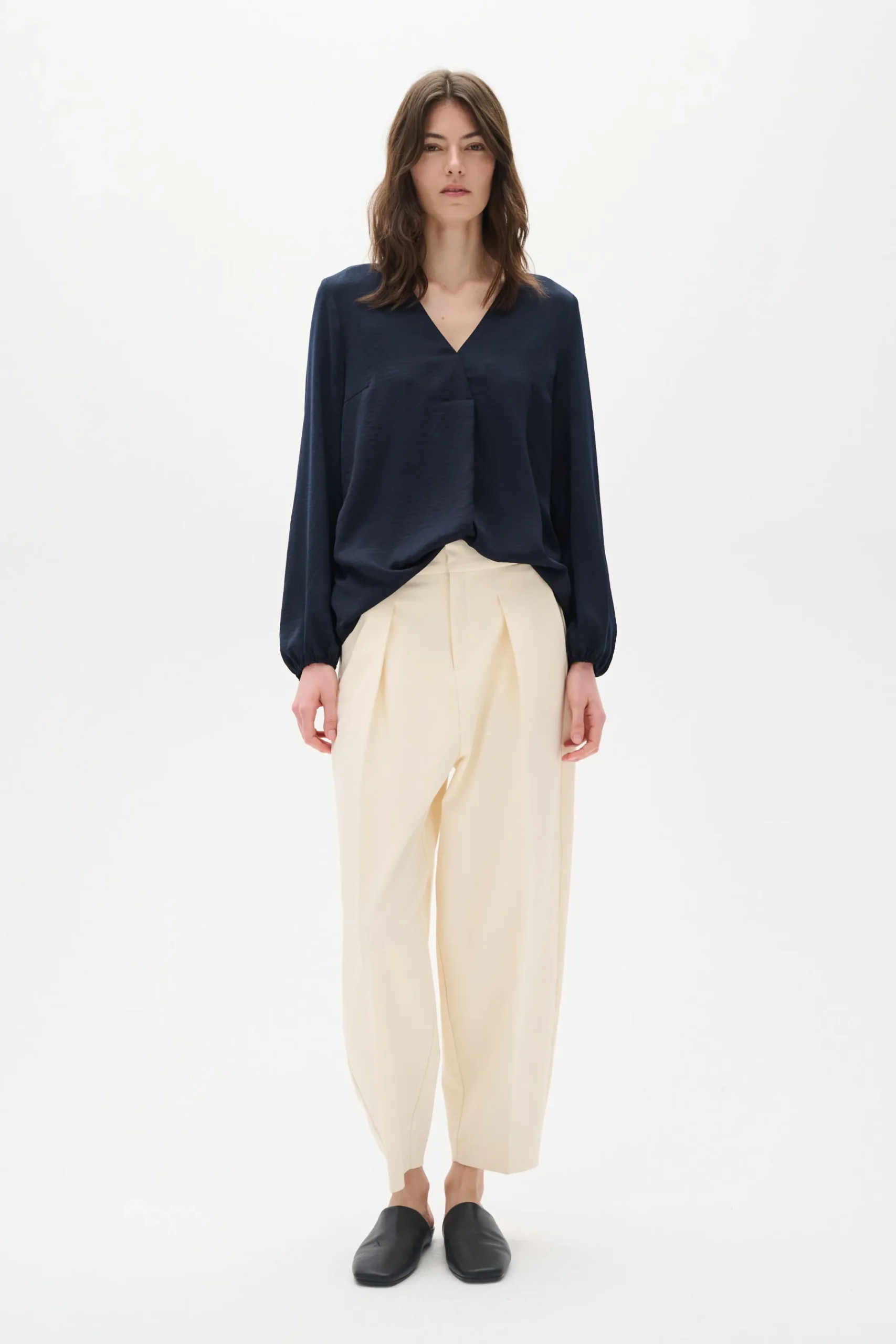 Bluse fra InWear med V-hals. Lange ærmer med elastikkant. Afrundet forneden. Læg med overskæring foran. Vævet kvalitet. Normal pasform.