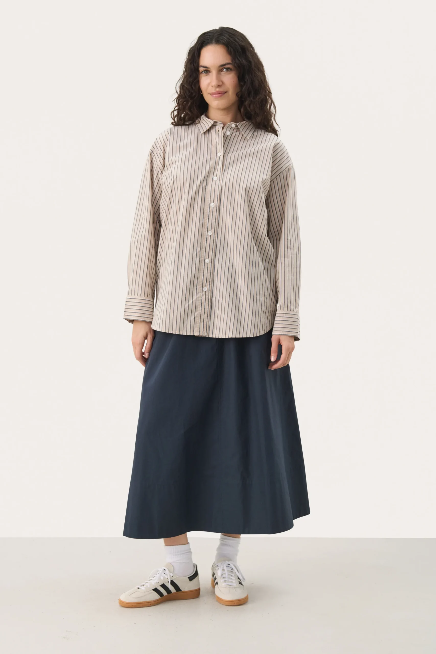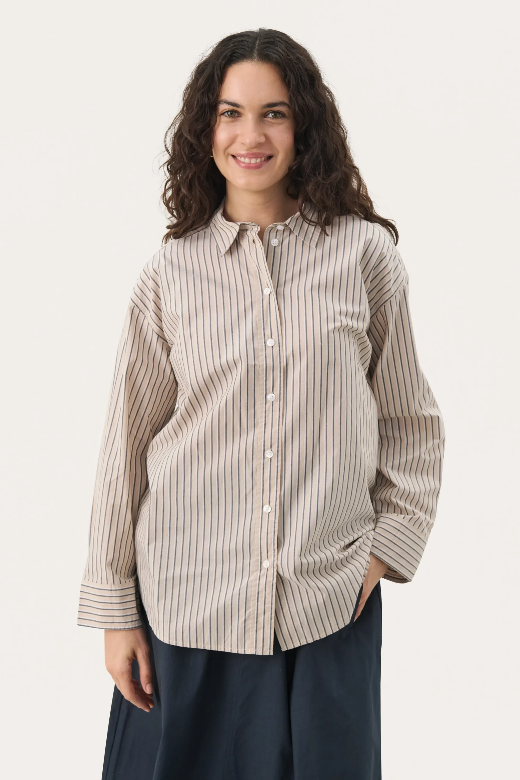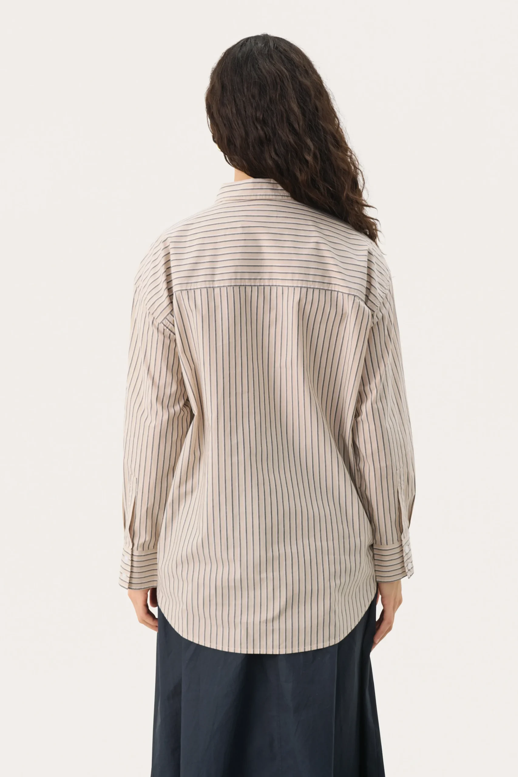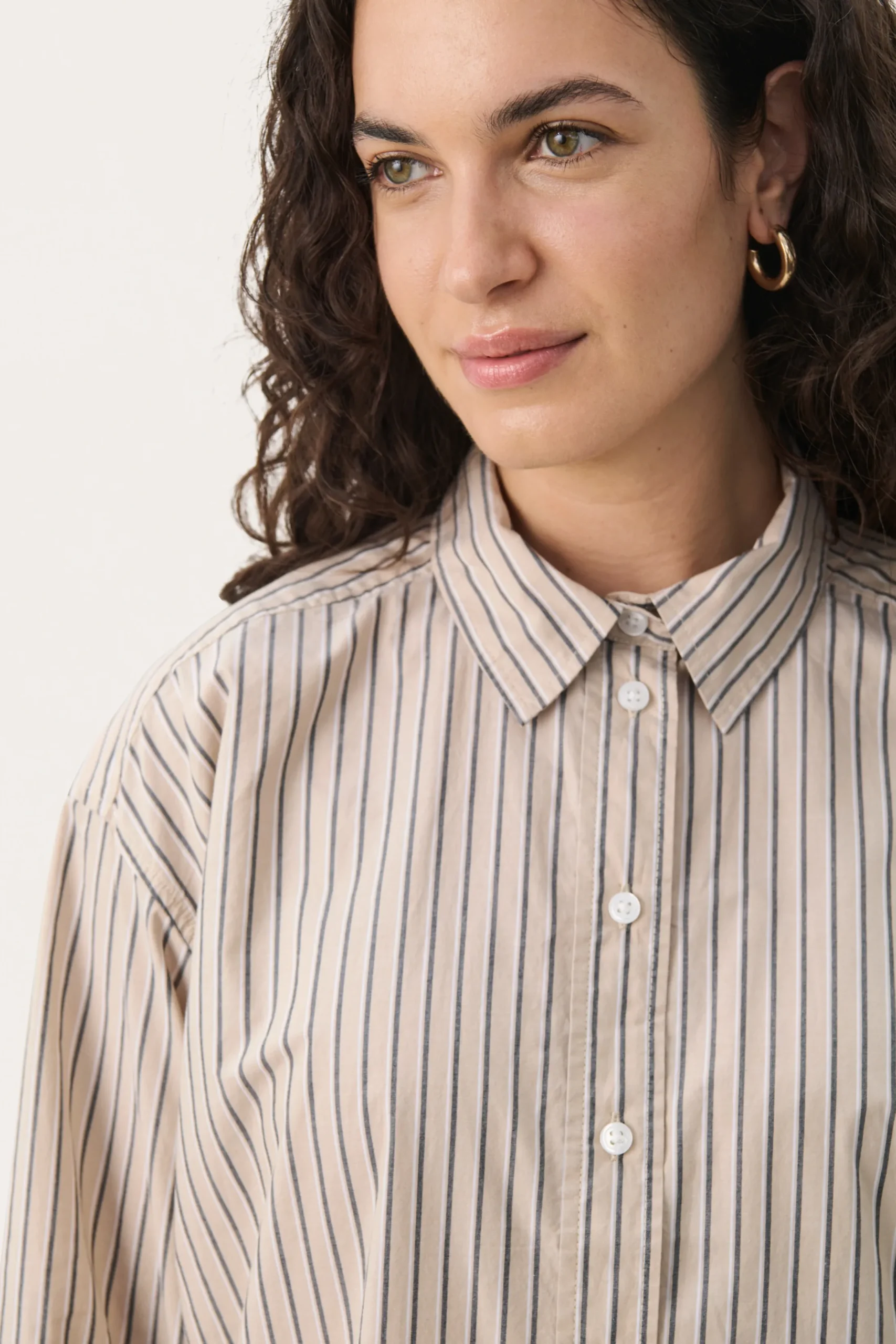 Modellen er 178 cm høj og er iført en størrelse 36.\\n\\nDenne stribede skjorte i en let og blød bomuldskvalitet er et stilfuldt valg til hverdagen. Designet med klassisk krave, gennemgående knaplukning og en afslappet pasform. Style med jeans eller chinos for et moderne og afslappet look.\\n\\n