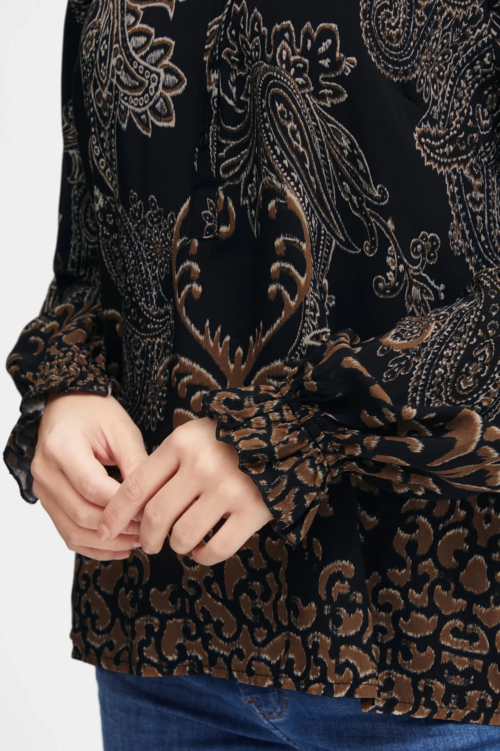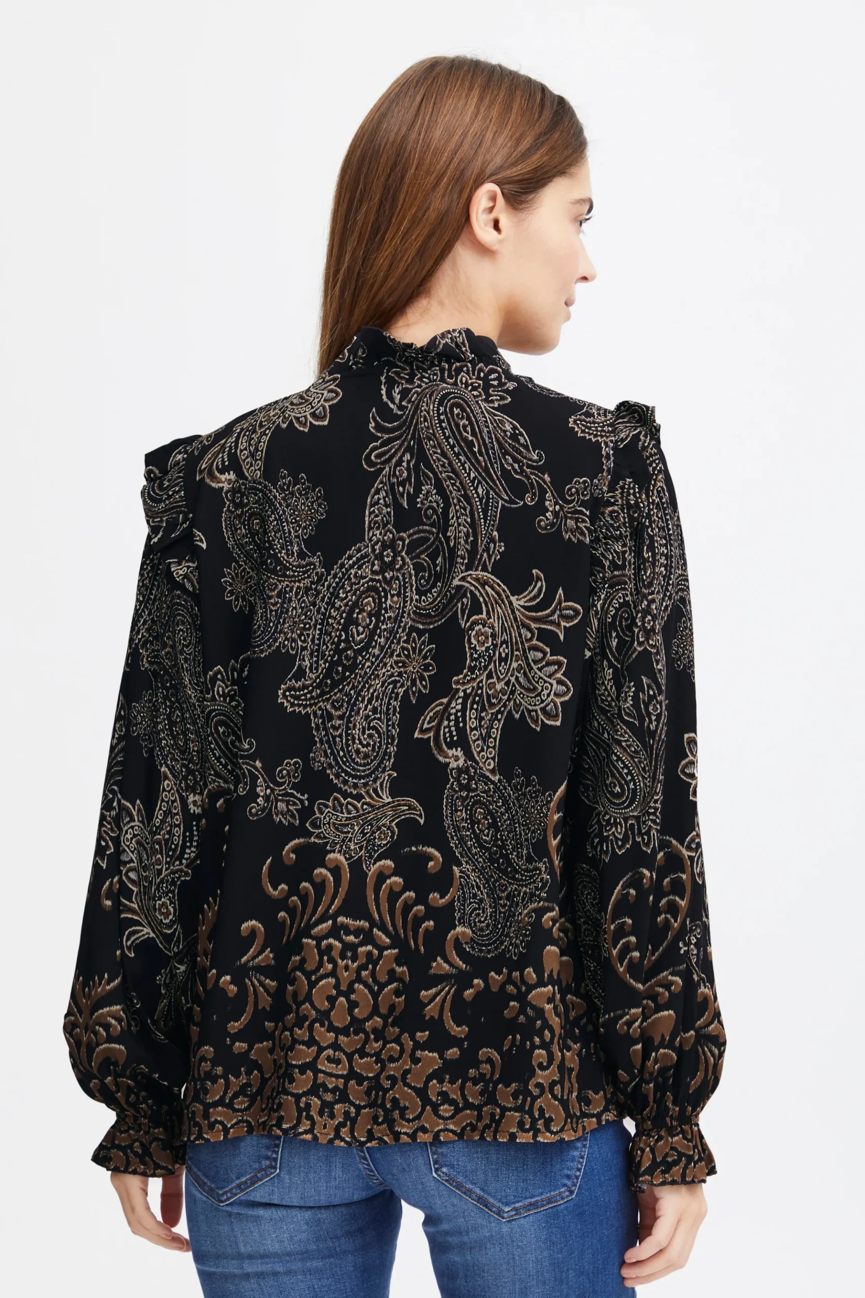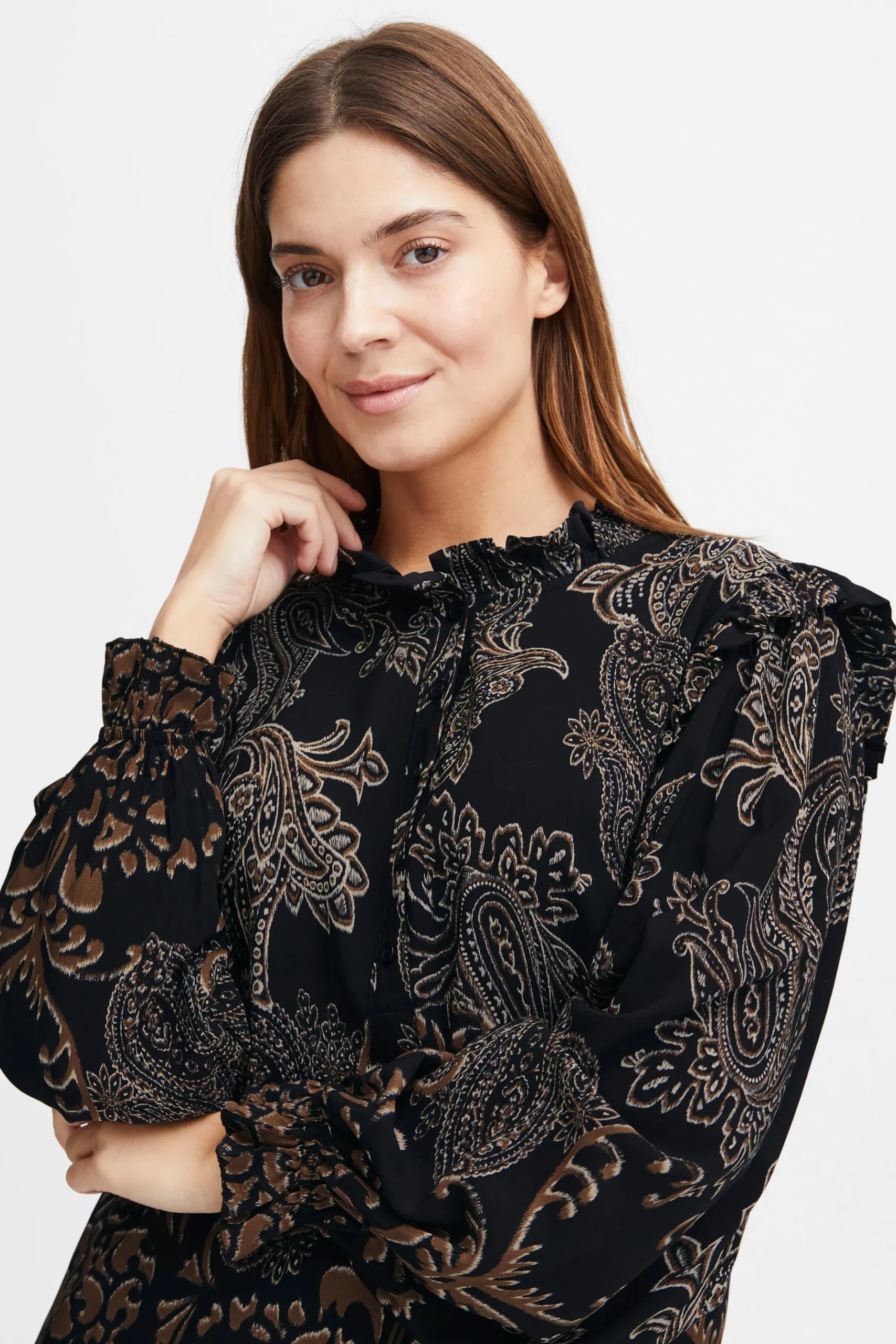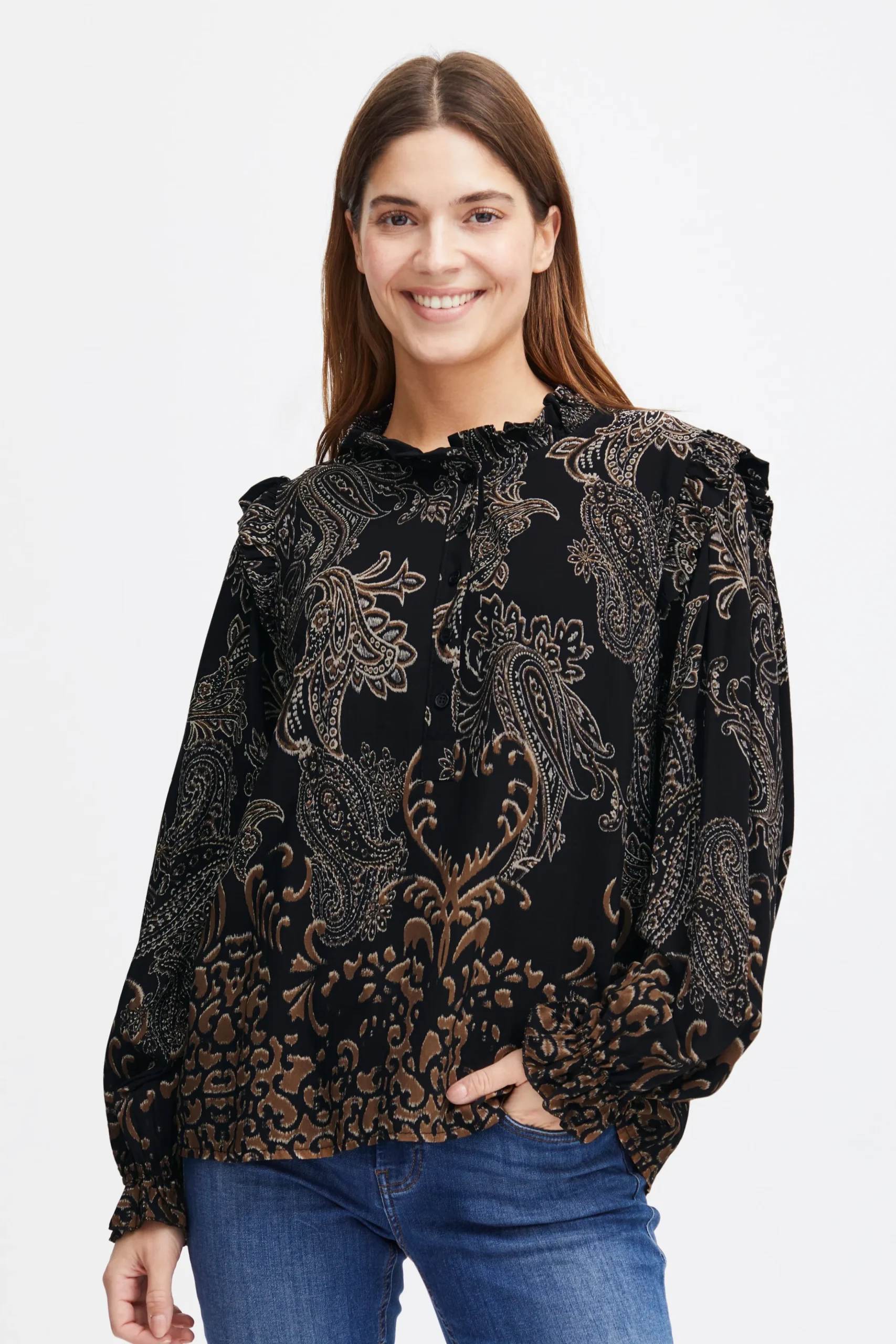 Denne langærmede bluse er den perfekte blanding af komfort og stil. Lavet af fin vævet kvalitet, vil du elske at have denne bluse på. Den føles behagelig mod huden og giver dig mulighed for at bevæge dig frit. Blusen er lavet af 100% viskose, hvilket giver den en let og luftig følelse. Du kan style denne bluse på utallige måder – sæt den ind i et par højtaljede bukser for et sofistikeret look eller bær den ud over nederdele eller jeans for et mere afslappet outfit. Denne bluse er alsidig og passer perfekt til både hverdagsbrug og ved mere formelle lejligheder. For at fuldende dit look, foreslår vi at du kombinerer denne bluse med et par bukser og et par stilfulde støvler.