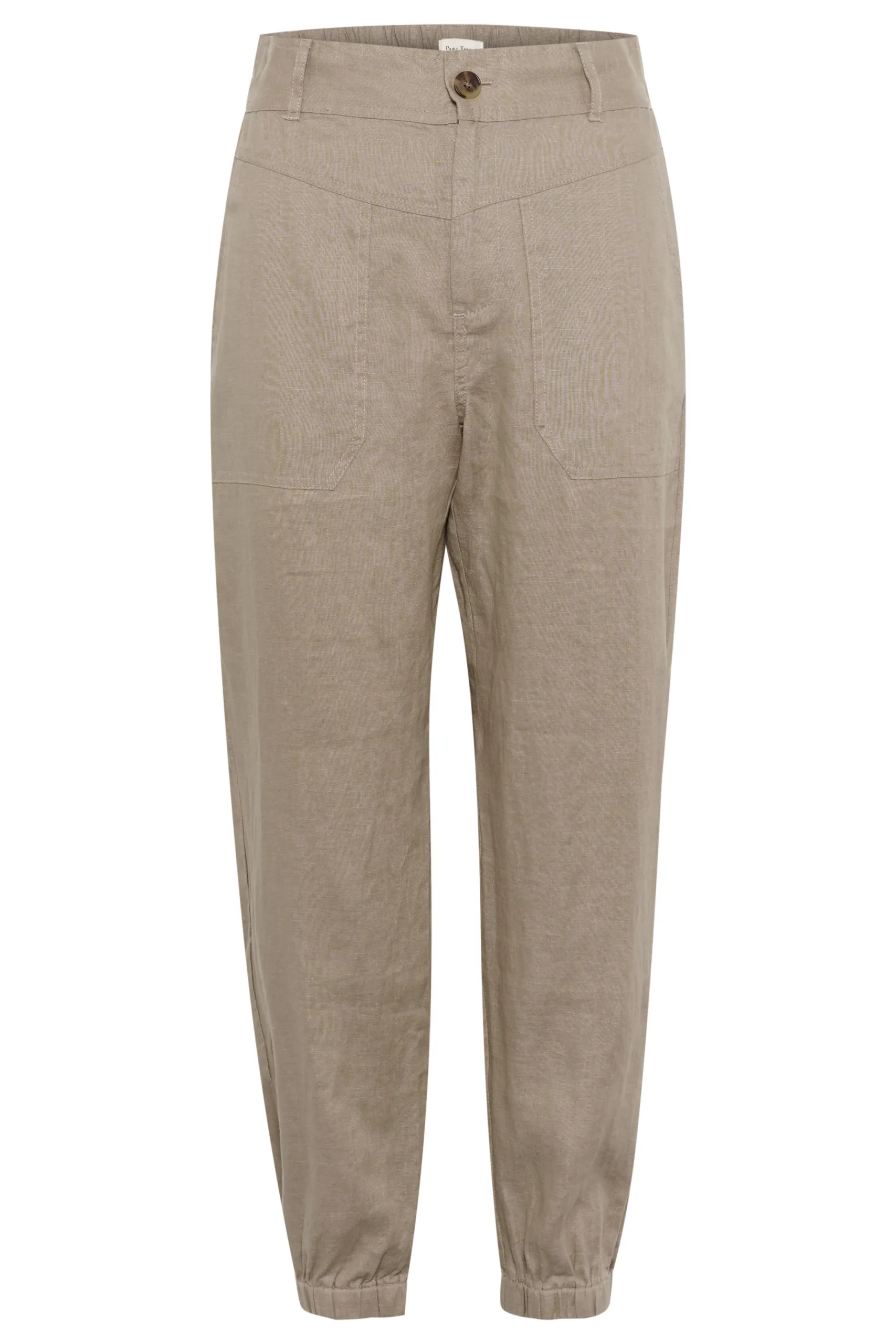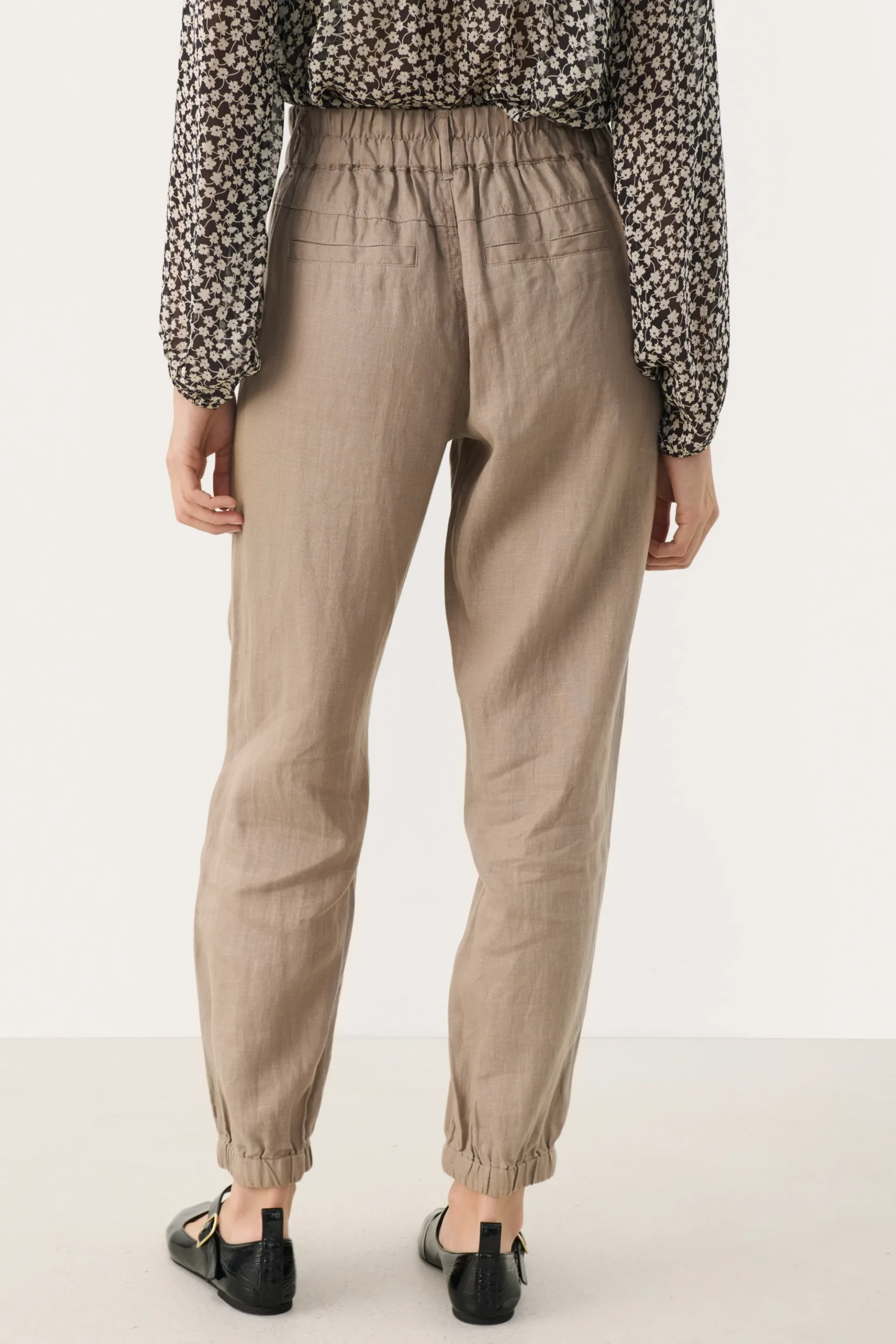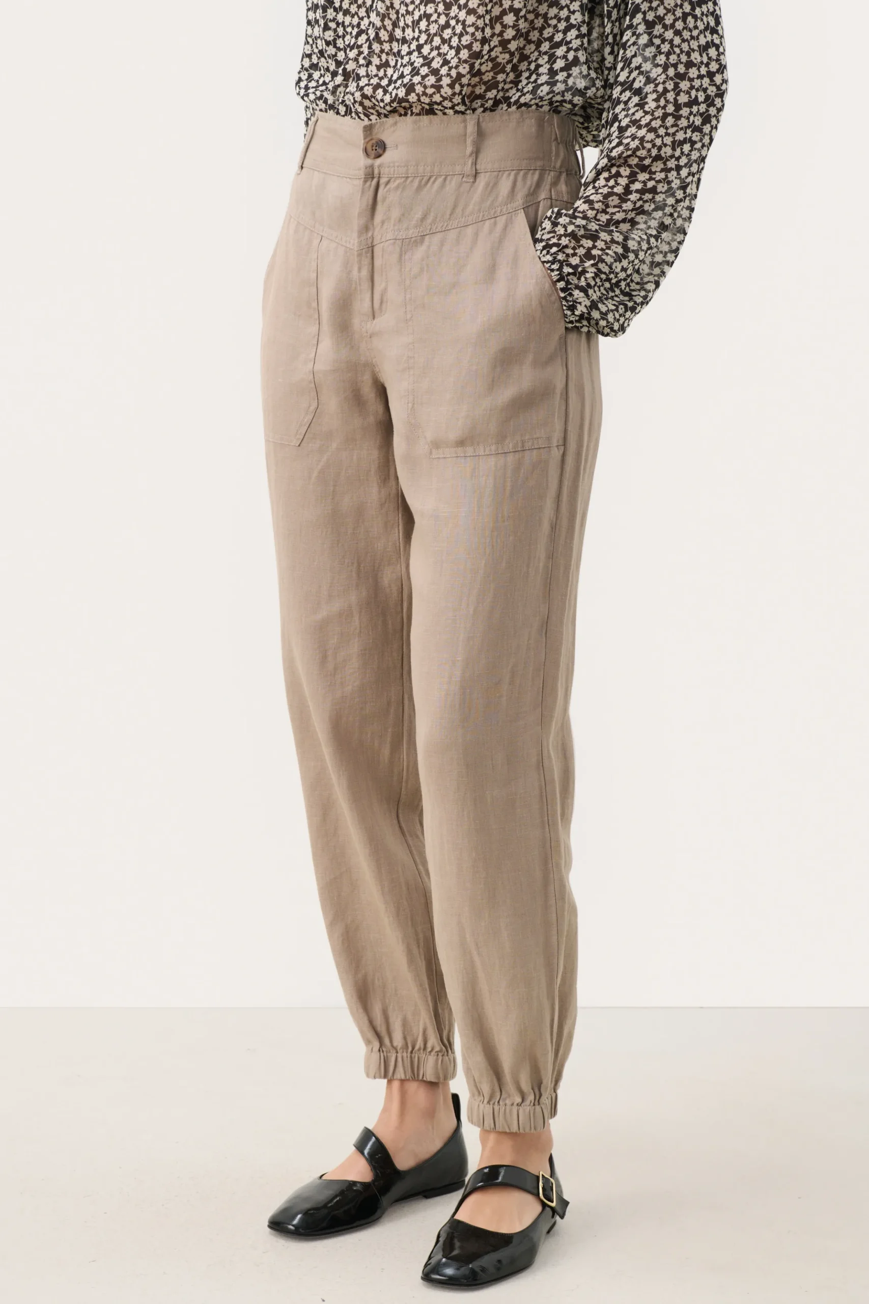Modellen er 178 cm høj og er iført en størrelse 36.\\n\\nDisse bukser i 100 % hør har en afslappet pasform med store frontlommer, elastik i anklerne og lukning med lynlås og knap. Den lette kvalitet gør dem ideelle til varme dage. Style dem med en enkel T-shirt eller en skjorte for et ubesværet, cool look.\\n\\n