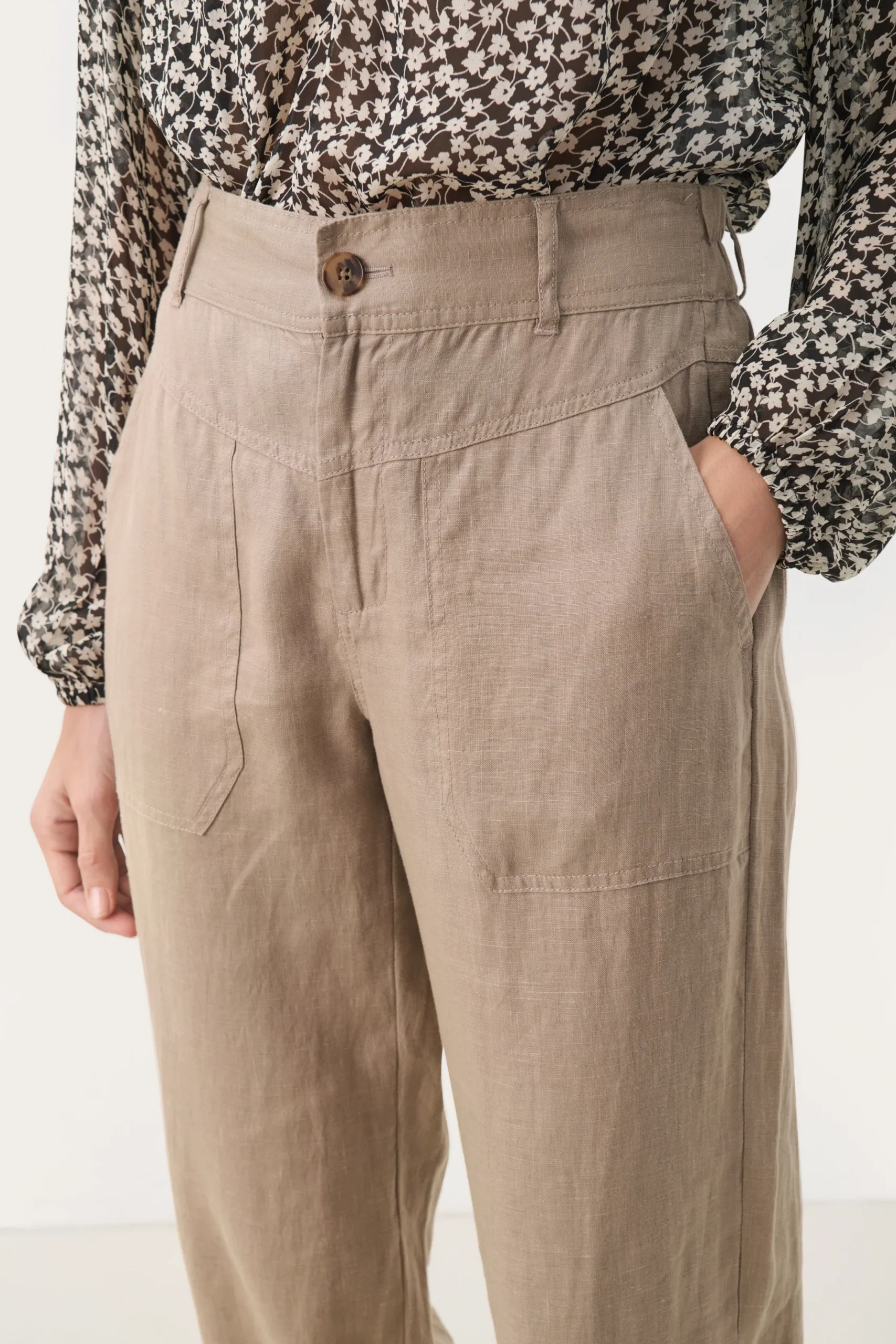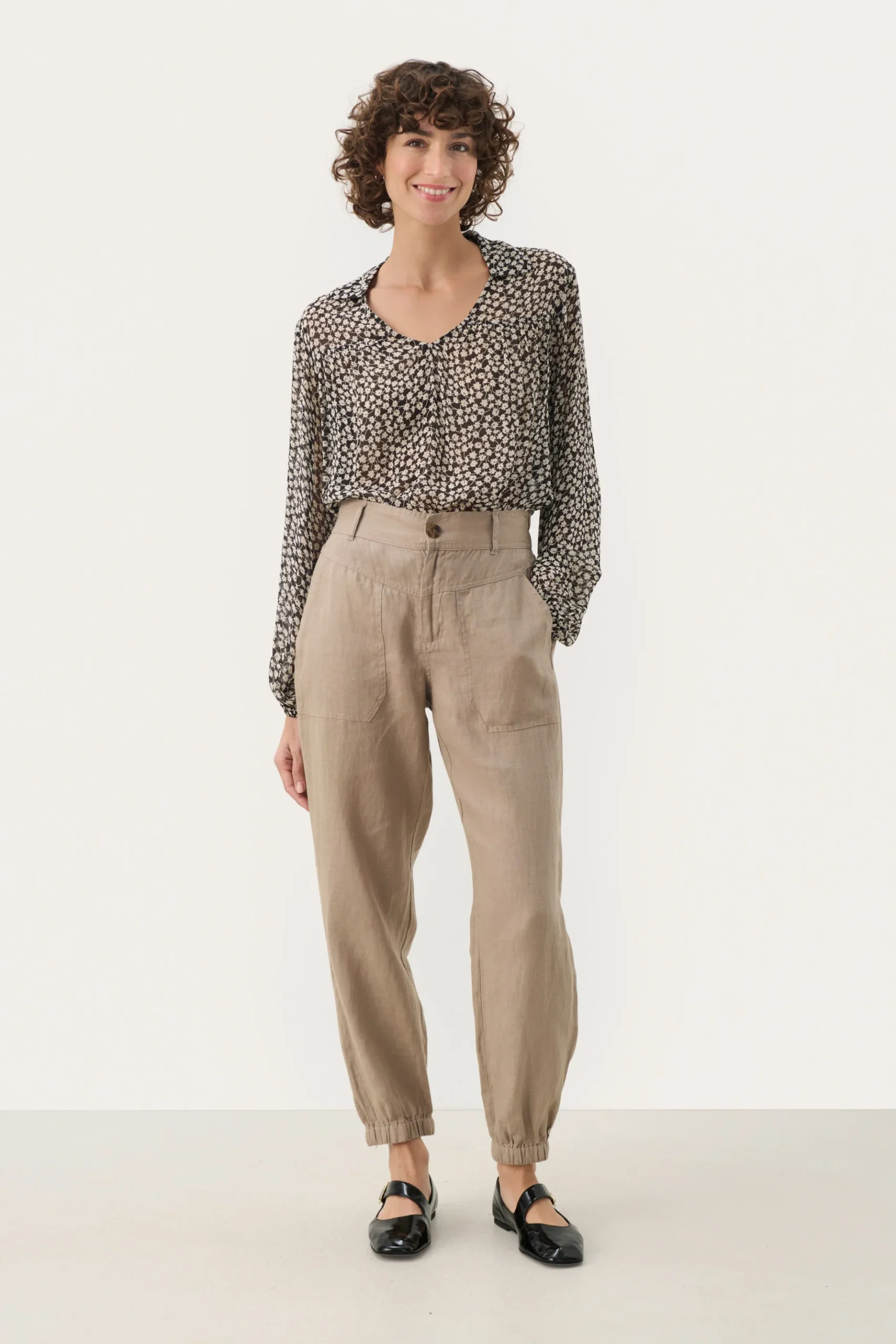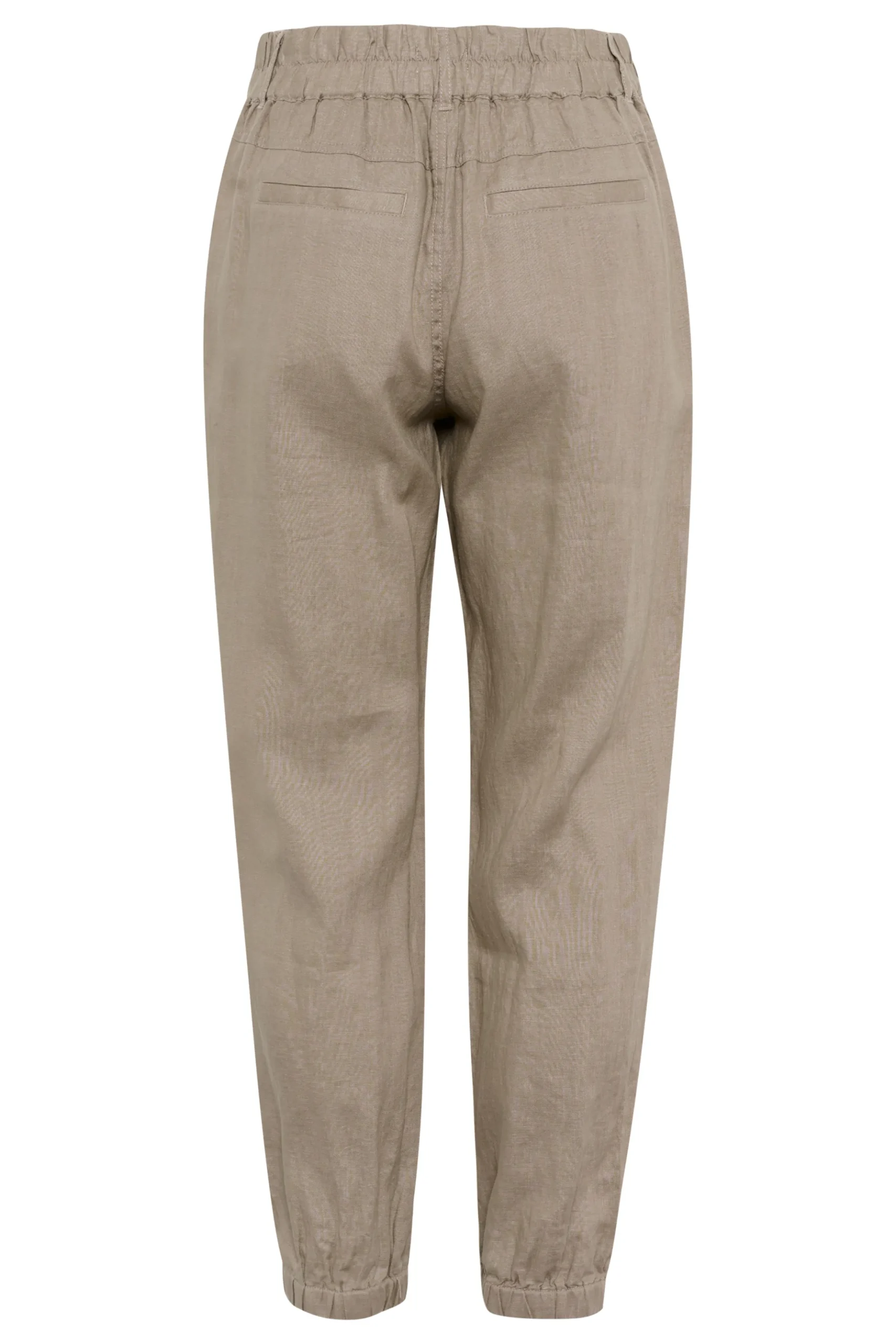 Modellen er 178 cm høj og er iført en størrelse 36.\\n\\nDisse bukser i 100 % hør har en afslappet pasform med store frontlommer, elastik i anklerne og lukning med lynlås og knap. Den lette kvalitet gør dem ideelle til varme dage. Style dem med en enkel T-shirt eller en skjorte for et ubesværet, cool look.\\n\\n