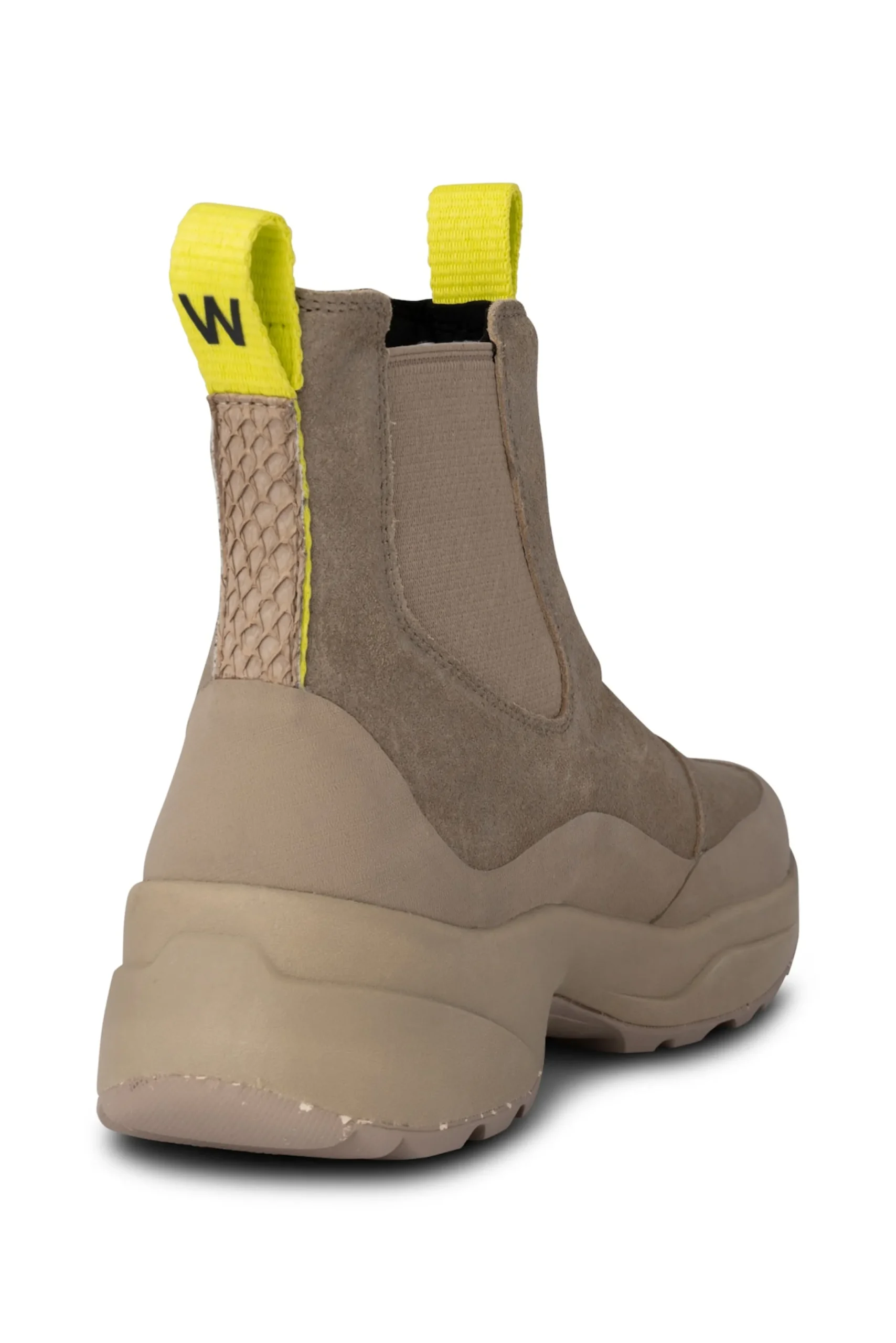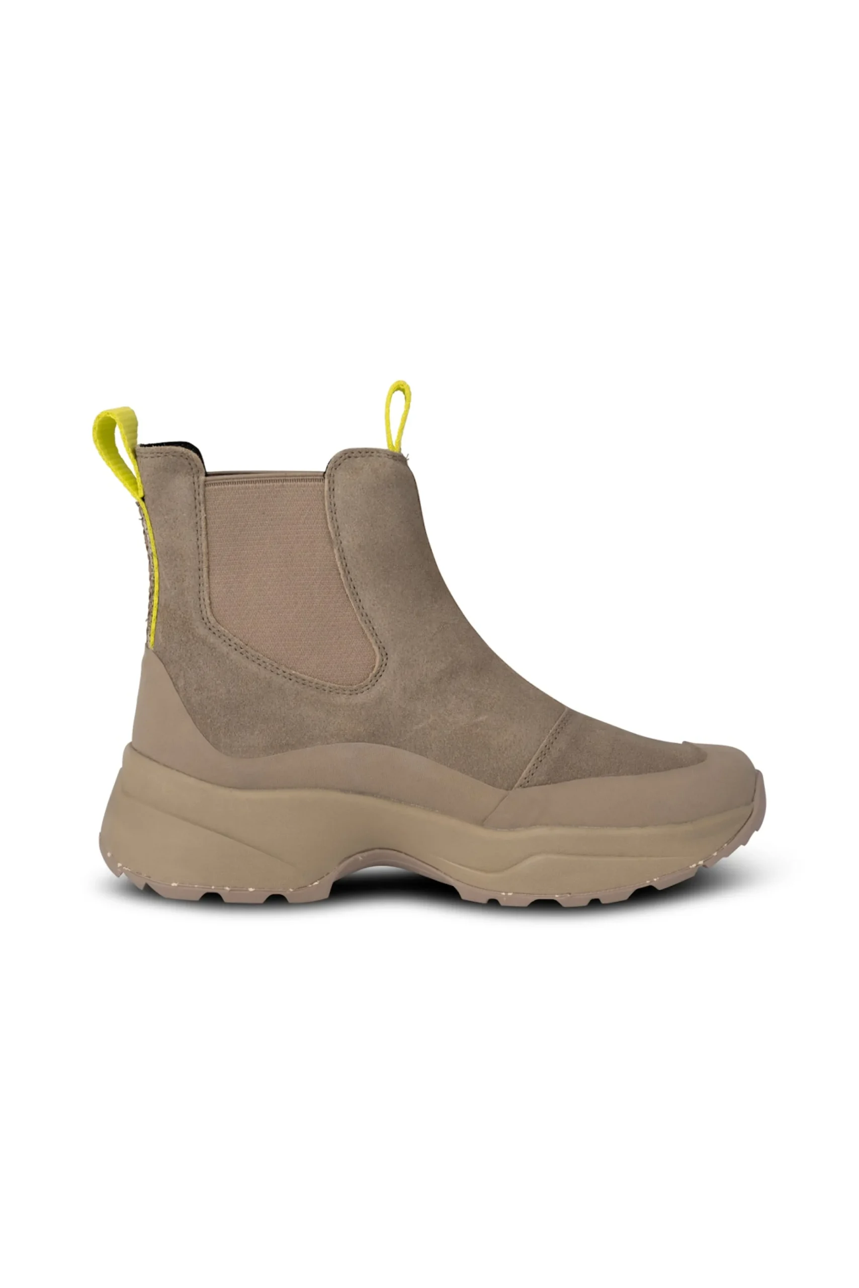 Oplev Solveig Suede, vores vandtætte Chelsea city boot fra WODEN. Solveig er fremstillet af certificeret voksbehandlet ruskind og har en unik gummikant for ekstra beskyttelse, som kombinerer den urbane stil med funktionalitet. Med sit vandtætte design og Natural Soft-teknologi sikrer Solveig både trend og komfort til alle lejligheder.\\n\\n- Certificeret ruskind fra LWG \\n- Upcyclet fiskelæder med ASC certificering\\n- Vandtæt med Cosmo邃øbt mellemsål i letvægtsmaterialet EVA \\n- Ydersål i gummi med 10% genanvendt gummi\\n- WODEN Natural soft technology 邃