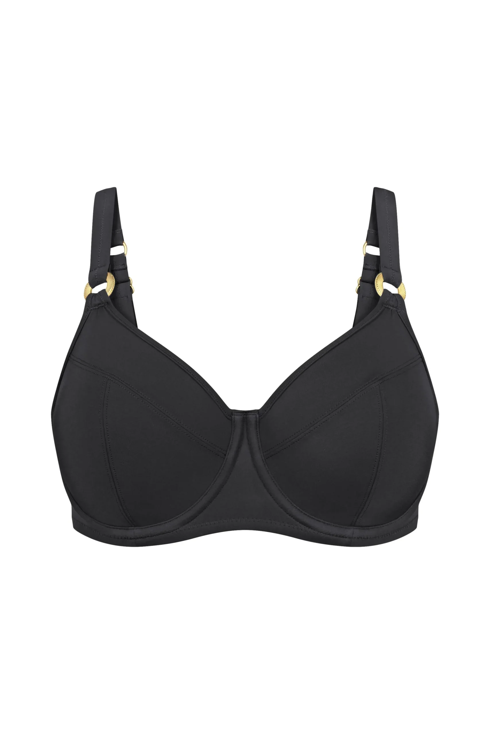 Bikinioverdelen med bøjle og minimizer effekt er ideel til større skålstørrelser og giver visuel reduktion uden at gå på kompromis med komforten. Elegante dekorative ringe pryder stropperne og giver et strejf af stil. Den er fremstillet af delvist genanvendt polyamid. Blød mod huden med et slidstærkt design.