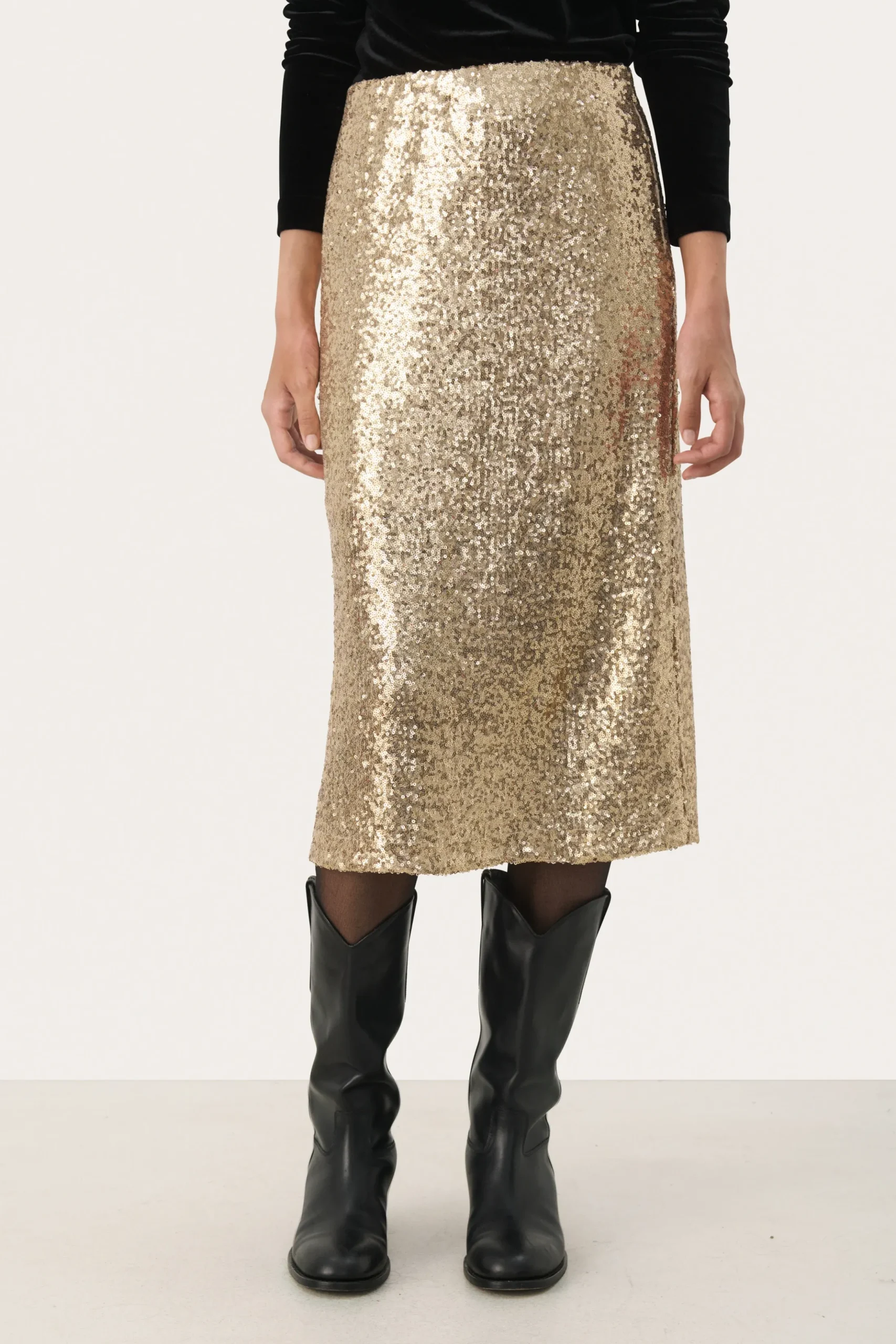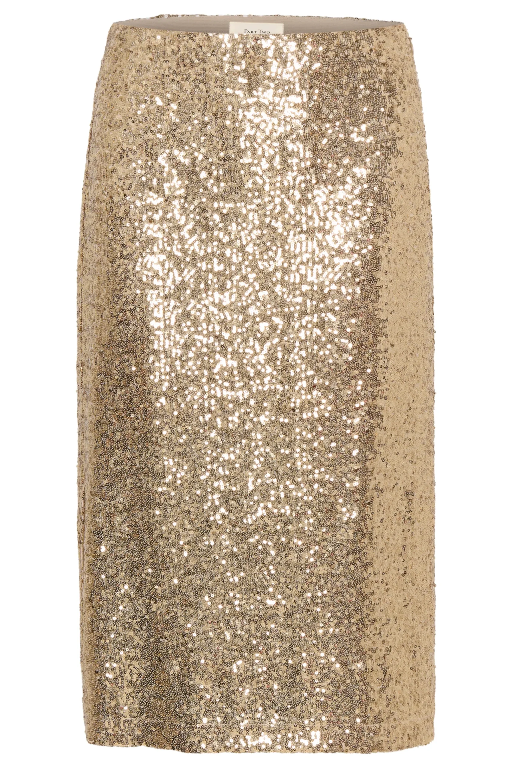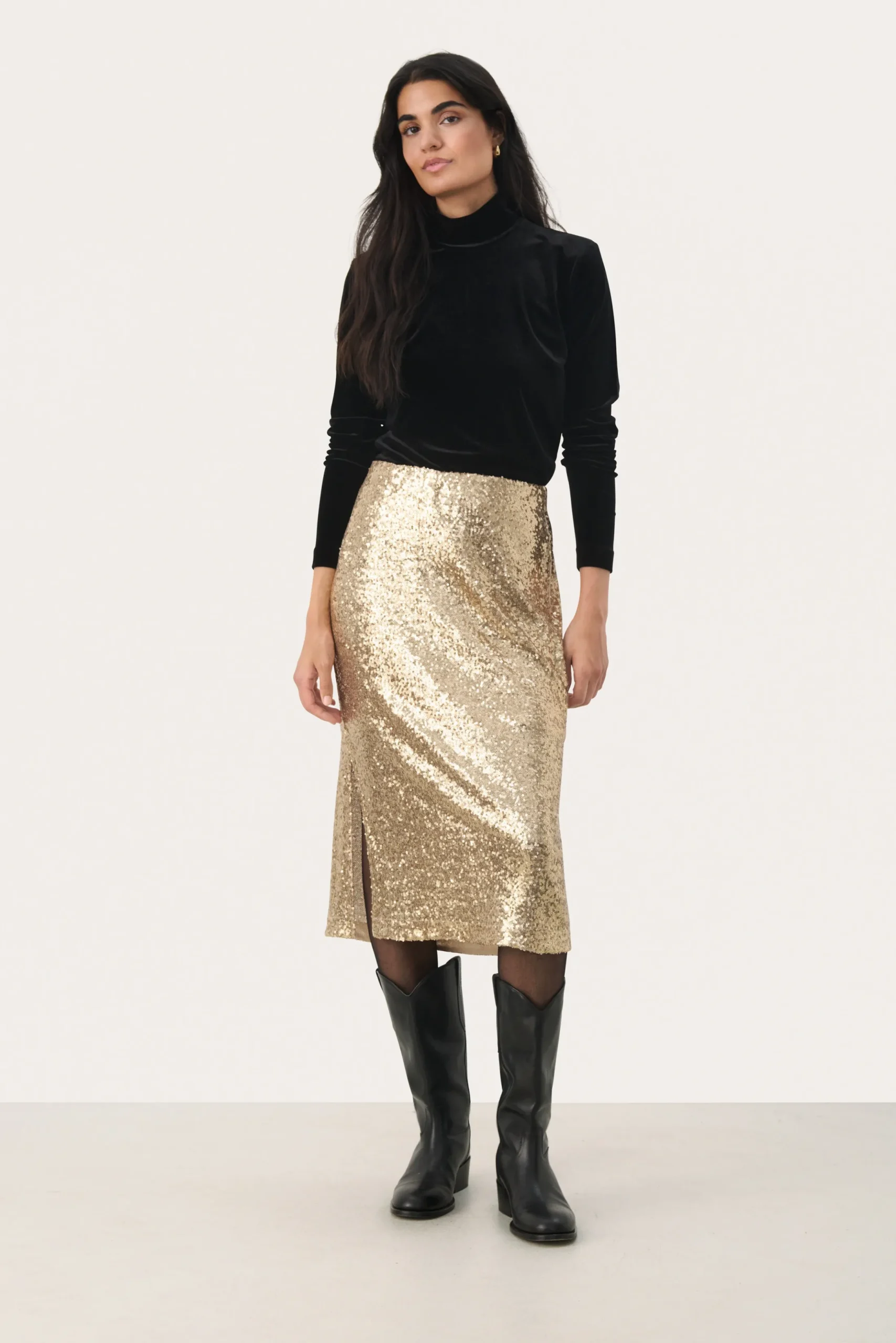 Modellen er 176 cm høj og er iført en størrelse M.\\n\\nDenne guldfarvede pailletnederdel er et statement-piece til festlige anledninger. Med sit tætsiddende snit og skinnende overflade giver den et glamourøst og sofistikeret look. Style den med høje hæle for et festligt outfit, eller med flade sko for et afslappet, men stilfuldt udtryk.