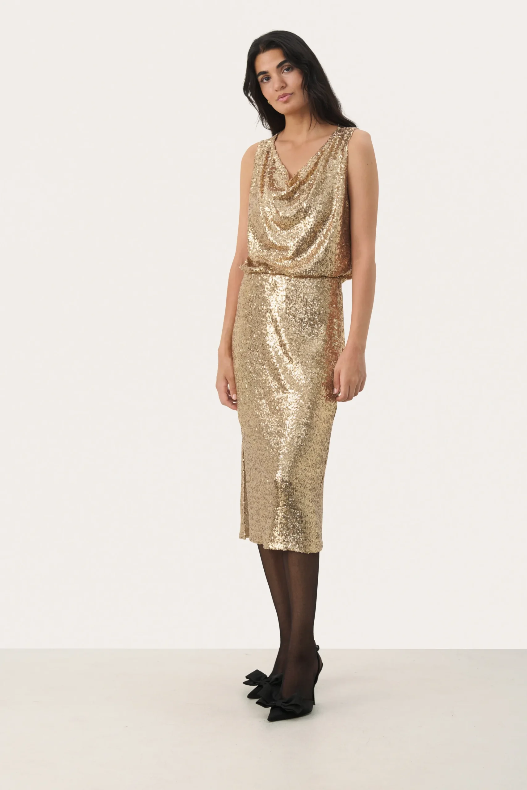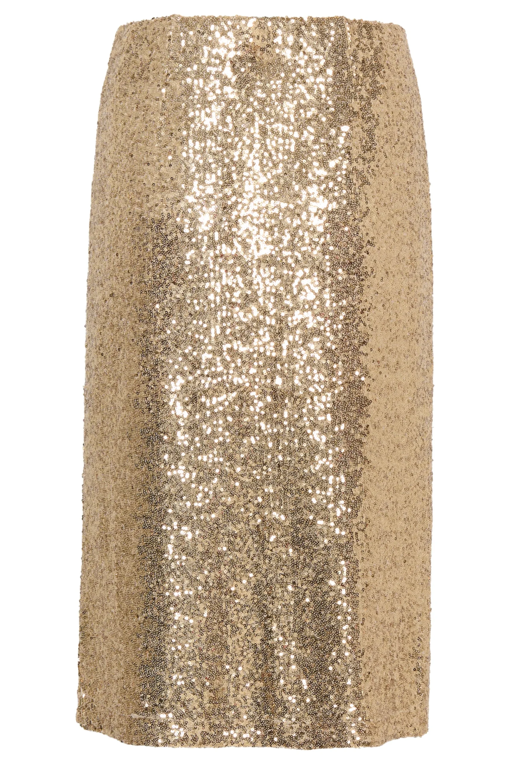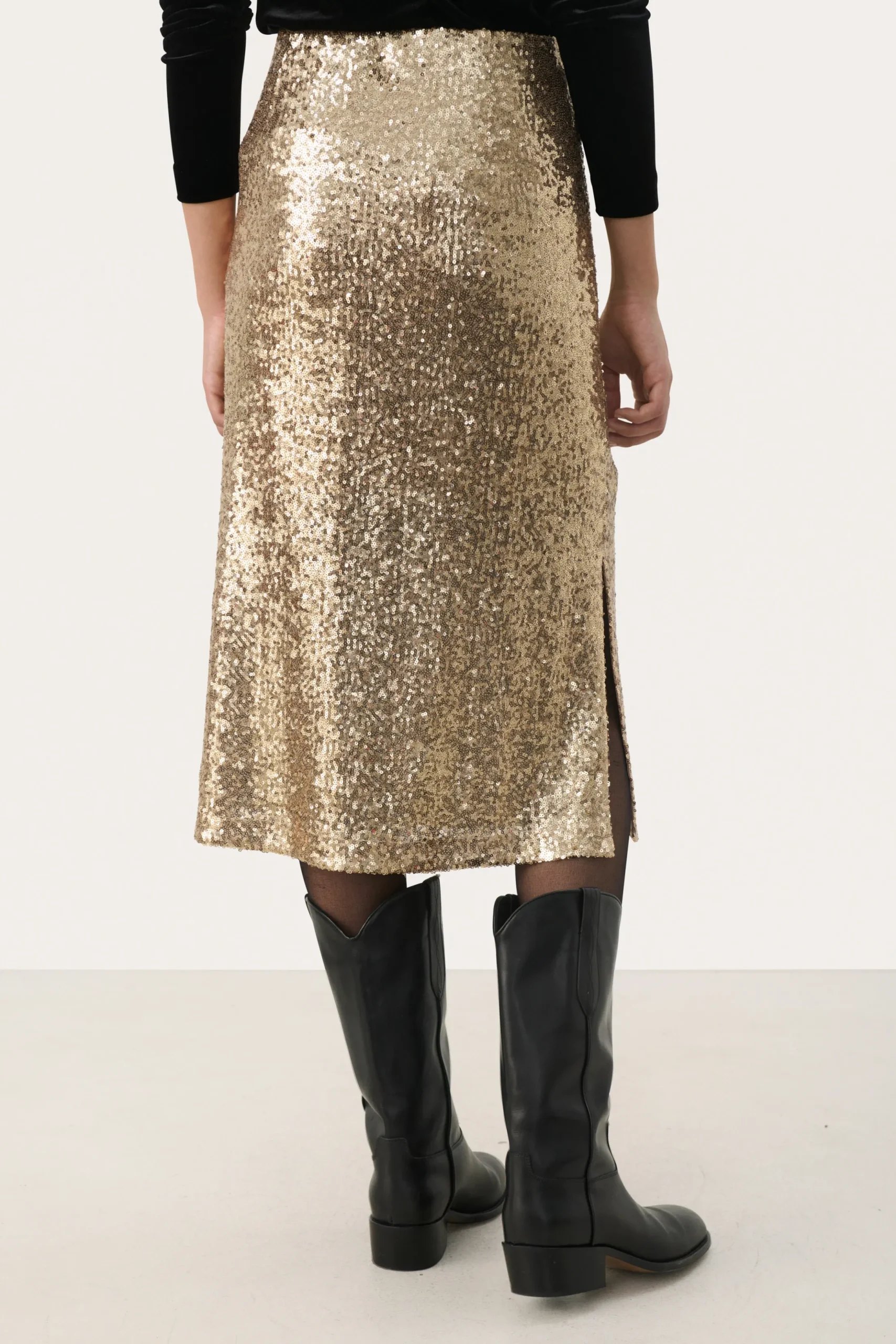 Modellen er 176 cm høj og er iført en størrelse M.\\n\\nDenne guldfarvede pailletnederdel er et statement-piece til festlige anledninger. Med sit tætsiddende snit og skinnende overflade giver den et glamourøst og sofistikeret look. Style den med høje hæle for et festligt outfit, eller med flade sko for et afslappet, men stilfuldt udtryk.