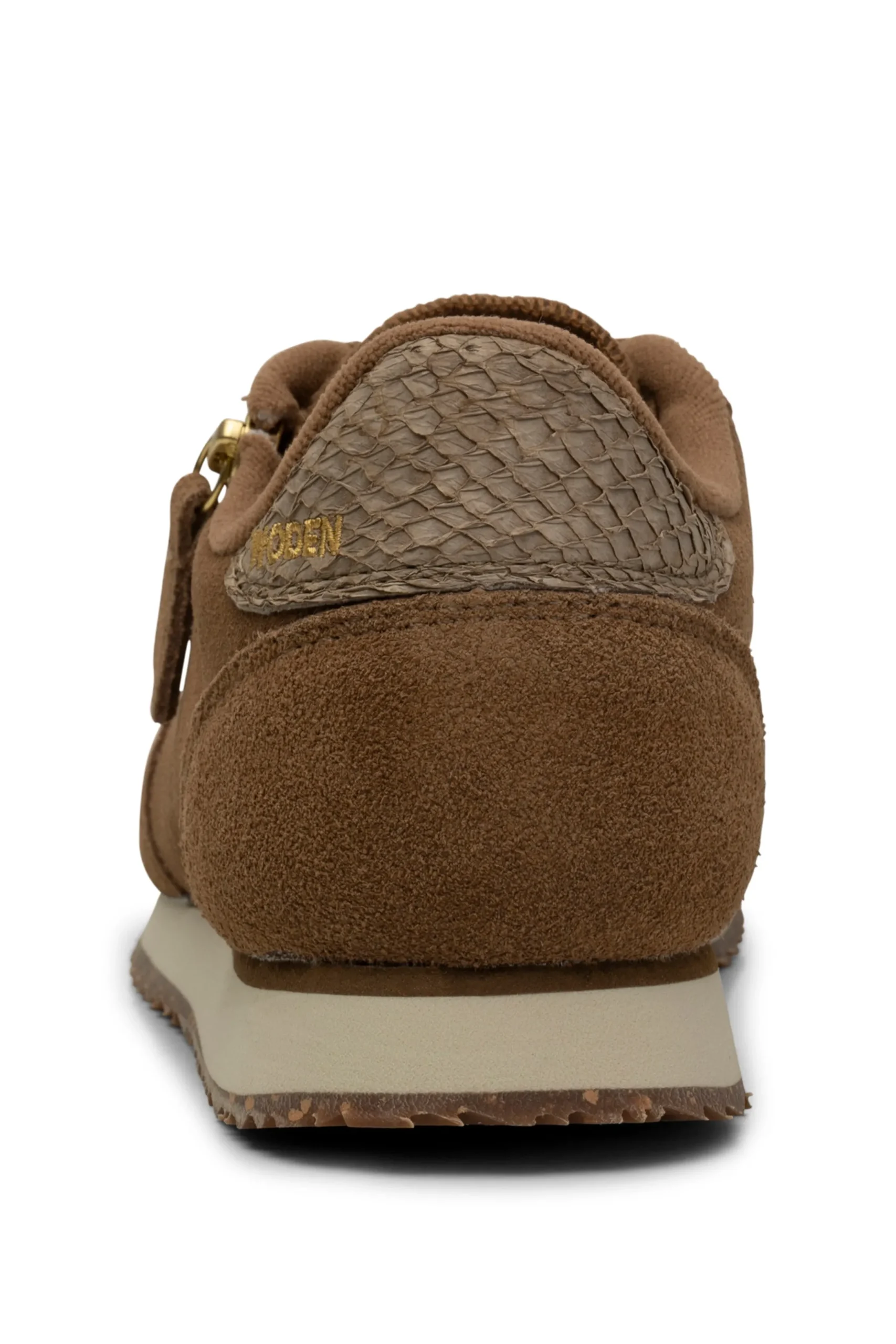 Med en fuldt funktionel lynlås, ruskindskonstruktion og fiskelæderdetaljer er Ydun Metallic Zipper et udtryk for en relevant lynlåstrend.\\n\\nUnikt for WODEN sneakers er, at vi inkorporerer mindst 50% Genanvendt polyester fra PET-flasker i materialet. Blødt PU-skum bruges til indersålen, som ikke kun er let, men også stødabsorberende.\\n \\nUd over den karakteristiske WODEN korksål har Ydun Metallic Zipper en WODEN airflow indersål for at sikre åndbarhed og giver en ultrablød gangoplevelse hele dagen.\\n\\n窶ål lavet af EVA\\n窶ås på ydersiden\\n窶æder detaljer\\n窶ægssål med Airflow system
